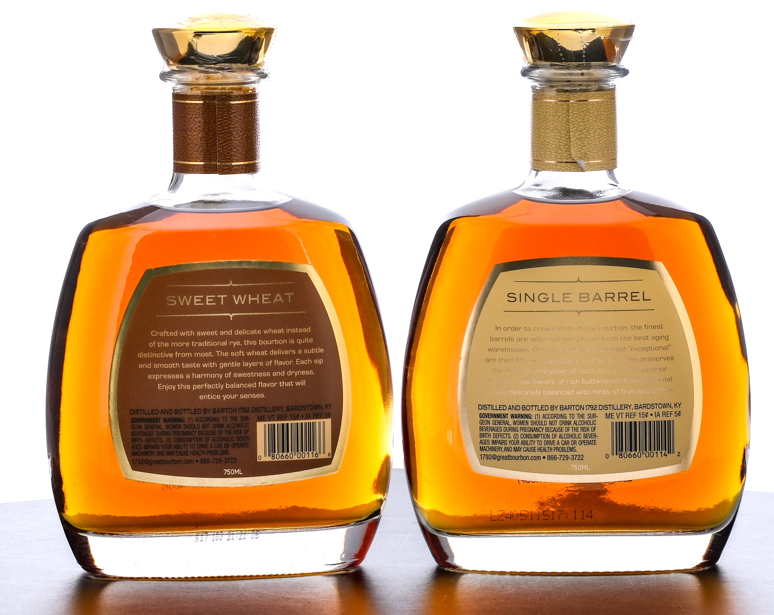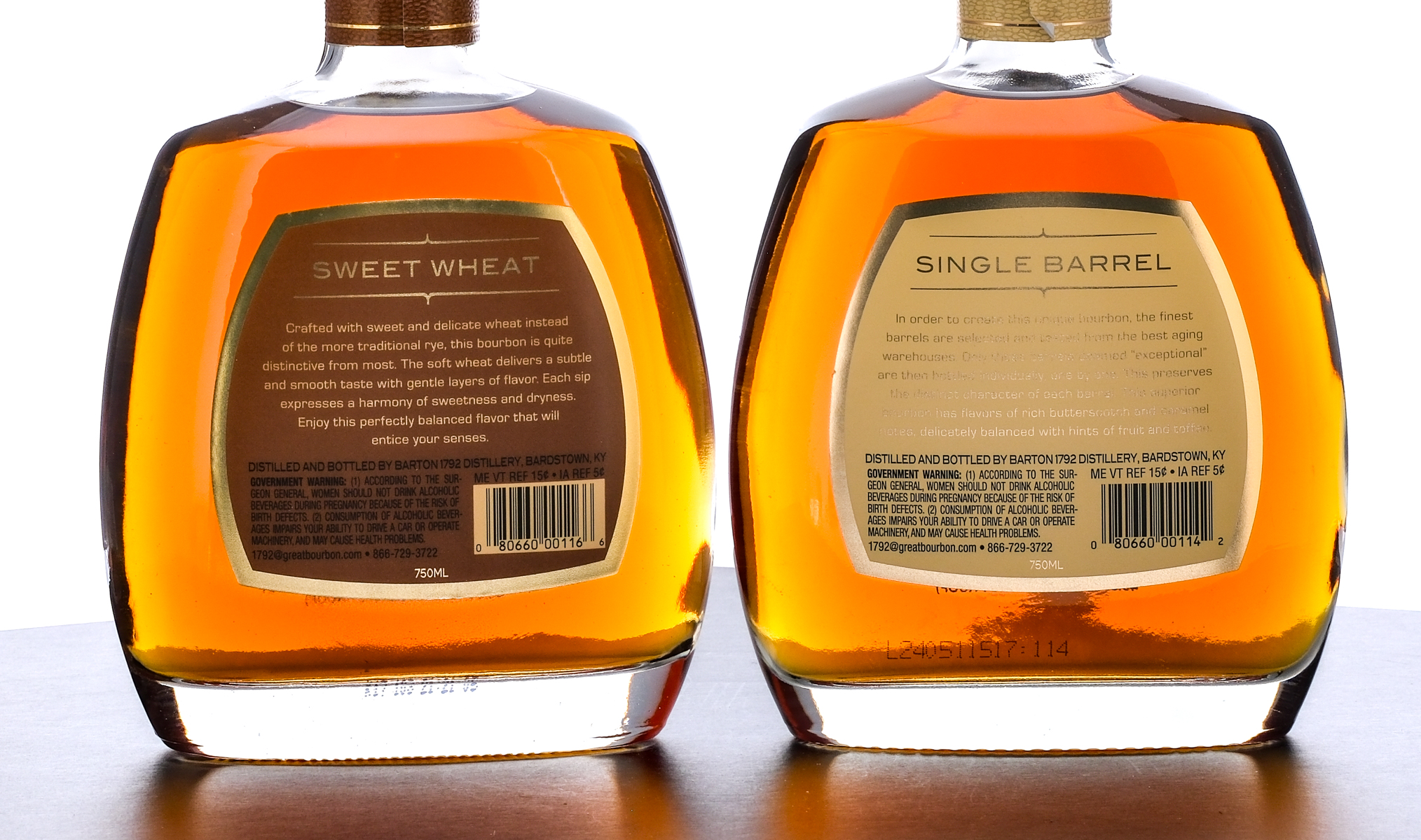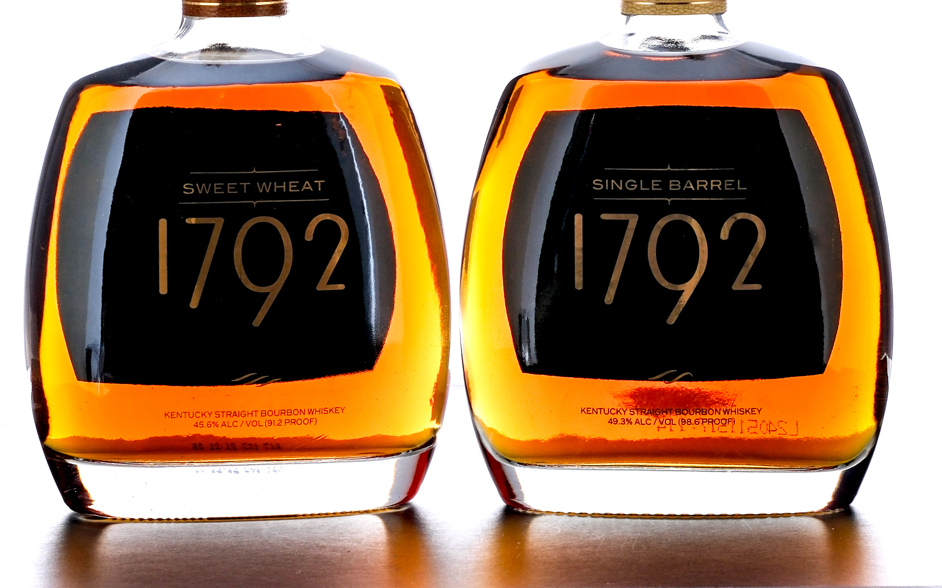 Two Bottles of 1792 Bourbon(s). First up is the 1792 Single Barrel Kentucky Straight Bourbon Whiskey (2024). 49.3% ALC/VOL (98.6 Proof). Plastic seal intact. Screened label excellent. Printed labels in very good condition, noting the neck label is exhibiting some lifting at the seam. 750ml. Distilled and Bottled By Barton 1792 distillery, Bardstown, KY. Second bottle: 1792 Sweet Wheat Kentucky Straight Bourbon Whiskey (2017). 45.6%ALC/VOL (91.2 Proof). Plastic seal intact. Screened and printed labels excellent. 750ml. Distilled and Bottled By Barton 1792 distillery, Bardstown, KY.