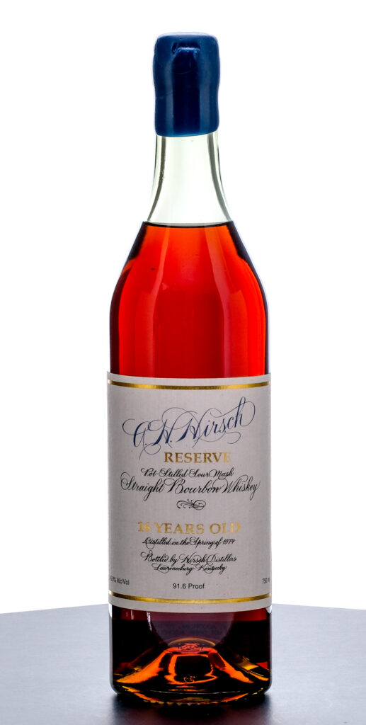 From The Collection of Michael Aronoff: A.H. Hirsch was distilled in 1974 at Pennco Distillery in Pennsylvania, home of the original Michter’s Whiskey. Distilled as a one-time, 400-barrel order for long-time Schenley executive Adolph Hirsch, A.H. Hirsch 16 Year is regarded as one of the most legendary bourbons of all time. Bottled in very small batches throughout the 1990s, A.H. Hirsch bourbon effectively hid in plain sight during a time when the American whiskey market was at its lowest point. Despite the quality of the bourbon, it often sat on store shelves for years at a time. The final stocks were bottled in 2003 for Preiss Imports, which acquired the brand in the early 2000s. As the bourbon market boomed in the 21st century and consumers started buying the last bottles still in stores, bourbon enthusiasts realized how unique this whiskey truly was. By the time this notion fully penetrated the market, the bottles were gone. The lore of A.H. Hirsch has grown to the point that the whiskey is a true legend 50 years after it was distilled. The brand is so mythical today that an entire book was written about it by the legendary bourbon historian Chuck Cowdery. A. H. Hirsch Reserve 16 Year Straight Bourbon Whiskey (early 1990’s bottling). Distilled in the Spring of 1974 at the original Michter’s Distillery. Pot-stilled sour mash. 45.8% ALC/VOL (91.6 Proof). Blue wax seal very good (exhibiting some losses around the pull tab area and a hairline crack, though seal is not compromised). Printed labels excellent. 750ml. Bottled by Hirsch Distillers.