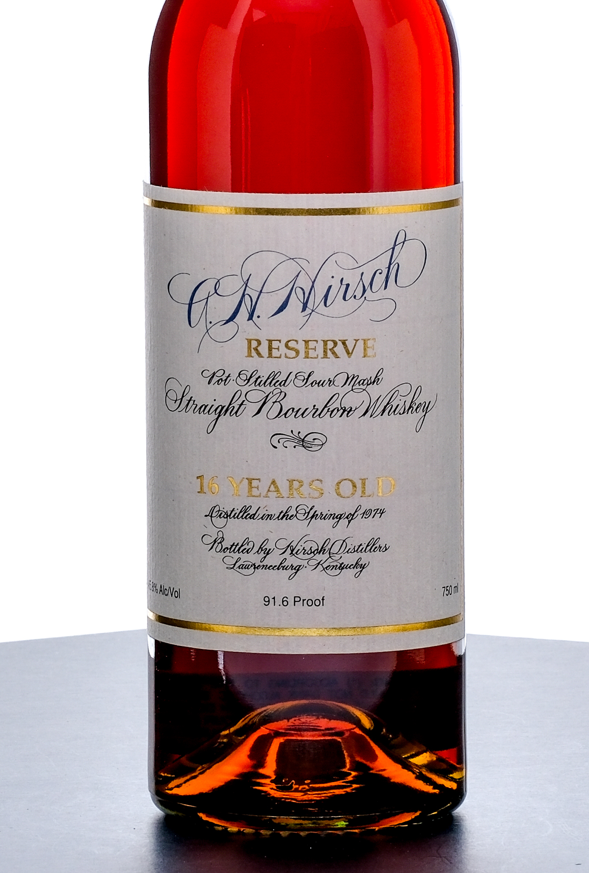 From The Collection of Michael Aronoff: A.H. Hirsch was distilled in 1974 at Pennco Distillery in Pennsylvania, home of the original Michter’s Whiskey. Distilled as a one-time, 400-barrel order for long-time Schenley executive Adolph Hirsch, A.H. Hirsch 16 Year is regarded as one of the most legendary bourbons of all time. Bottled in very small batches throughout the 1990s, A.H. Hirsch bourbon effectively hid in plain sight during a time when the American whiskey market was at its lowest point. Despite the quality of the bourbon, it often sat on store shelves for years at a time. The final stocks were bottled in 2003 for Preiss Imports, which acquired the brand in the early 2000s. As the bourbon market boomed in the 21st century and consumers started buying the last bottles still in stores, bourbon enthusiasts realized how unique this whiskey truly was. By the time this notion fully penetrated the market, the bottles were gone. The lore of A.H. Hirsch has grown to the point that the whiskey is a true legend 50 years after it was distilled. The brand is so mythical today that an entire book was written about it by the legendary bourbon historian Chuck Cowdery. A. H. Hirsch Reserve 16 Year Straight Bourbon Whiskey (early 1990’s bottling). Distilled in the Spring of 1974 at the original Michter’s Distillery. Pot-stilled sour mash. 45.8% ALC/VOL (91.6 Proof). Blue wax seal very good (exhibiting some losses around the pull tab area and a single scratch). Printed labels excellent. 750ml. Bottled by Hirsch Distillers.