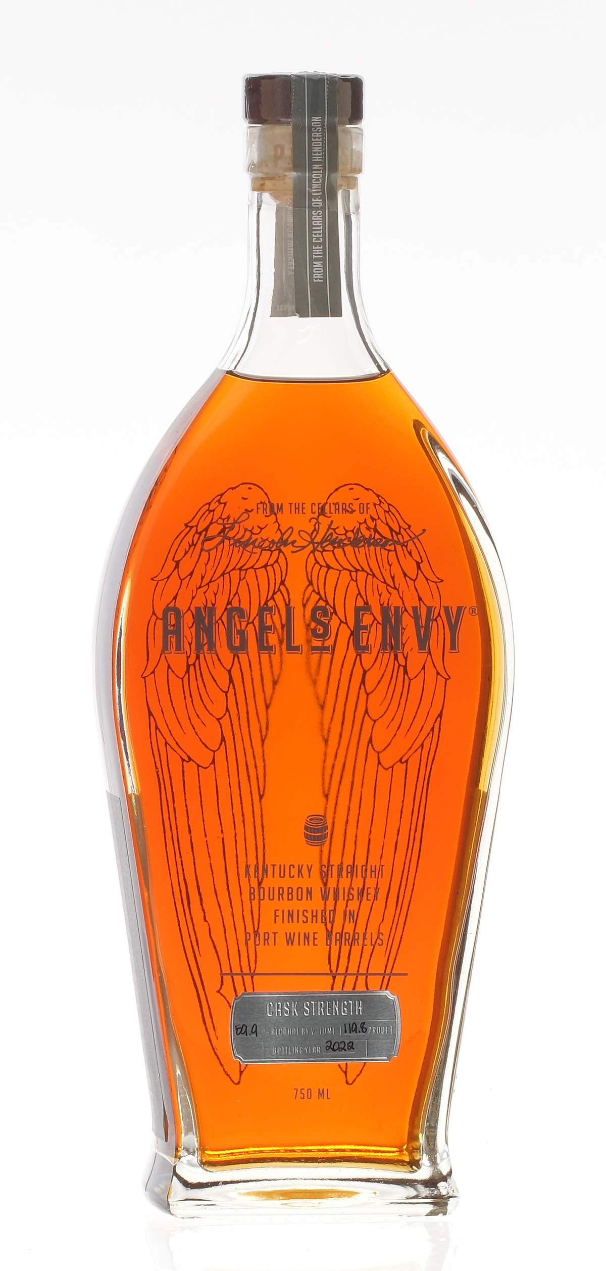 From the cellars of Lincoln Henderson. Bottling year 2022. Finished in port wine barrels. 59.9% ALC/VOL. 119.8 Proof. Original wooden box very good (some surface level scratches and scuffs at bottom corners of lid evident). Includes info sheet. Plastic seal on bottle intact. Labels excellent. Whiskey Bourbon Angel’s Envy USA Kentucky 2022 1 750ml