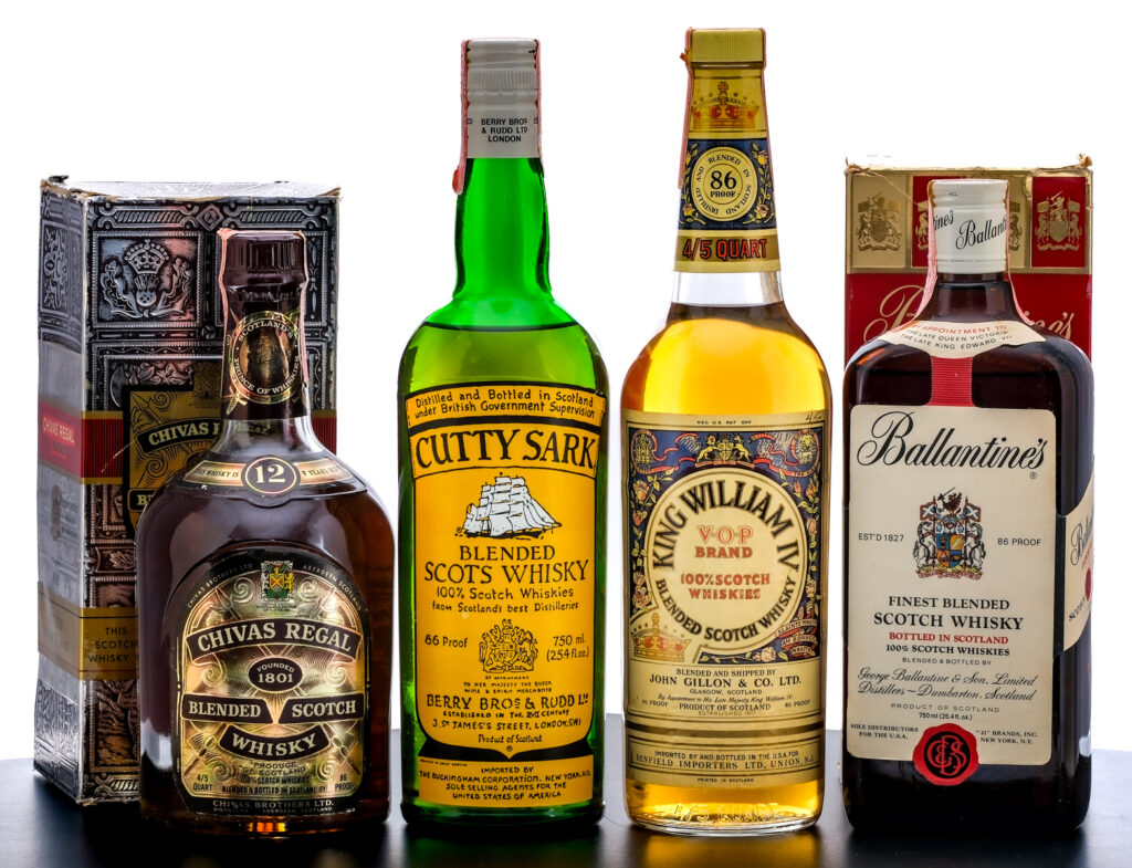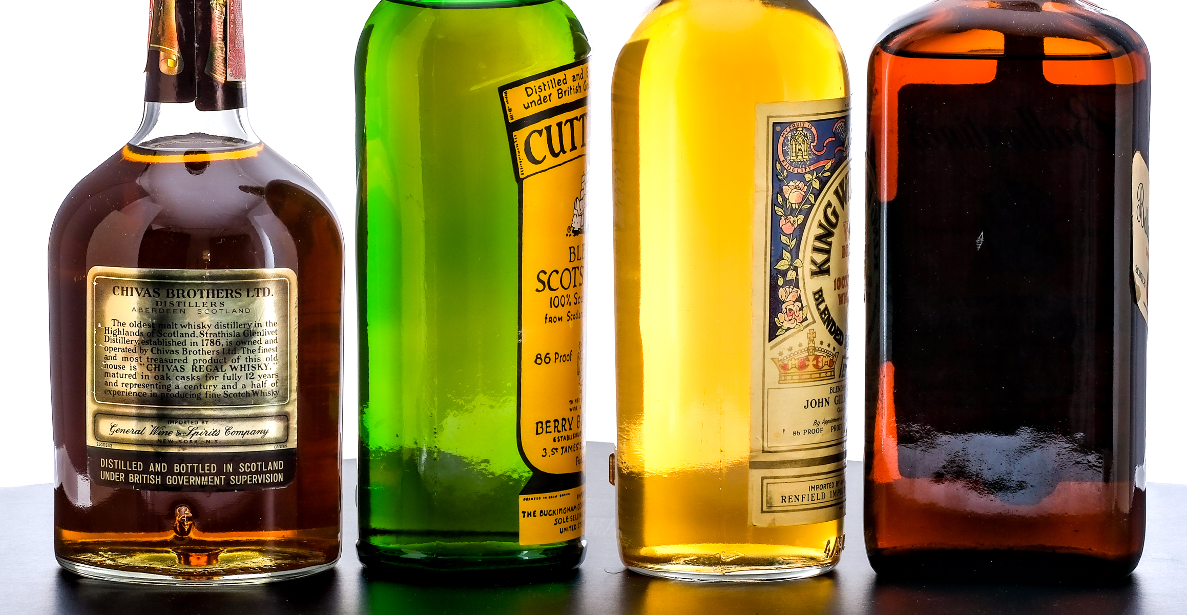 Group of four bottles of Blended Scotch Whisky (circa 1961-1977 based on tax stamps): 1x 750ml bottle Ballantine’s Finest Blended Scotch Whisky. 86 Proof. Cardboard box good (exhibiting tearing and creasing, especially around the lid). Stamp seal intact. Printed labels good (exhibiting some staining and lifting/dogearing on one side panel). Product of Scotland. Blended & bottled by George Ballantine & Son, Limited Distillers. Sole distributors for the U.S.A. “21” Brands, Inc. (New York, NY). 1x 4/5 Qt bottle of Chivas Regal 12 Year Blended Scotch Whisky. 86 Proof. Cardboard box good (exhibiting some edge wear in addition to some staining and extensive creasing below the lid). Stamp seal on bottle intact though with minor losses. Printed labels good with some nicks, dings and losses in foil stamp throughout. Blended & bottled in Scotland by Chivas Brothers Ltd. Imported by General Wine & Spirits Company (New York, NY). 1x 750ml bottle of Cutty Sark Blended Scots Whisky. 86 Proof. Stamp seal on bottle intact but exhibiting some losses and lifting/curling at one end. Printed label very good with the top right corner exhibiting some dogearing. Berry Bros. & Rudd Ltd. Imported by The Buckingham Corporation (New York, NY), sole selling agents for the United States of America. 1x 4/5 Qt bottle of King William IV V.O.P. Brand Blended Scotch Whisky. 86 Proof. Stamp seal intact but exhibits some tears. Printed labels very good, exhibiting some toning, staining and a single instance of handwriting at the top right corner of the front facing label. Blended and shipped by John Gillon & Co. Imported by and bottled in the U.S.A. for Renfield Importers Ltd. (Union, NJ).