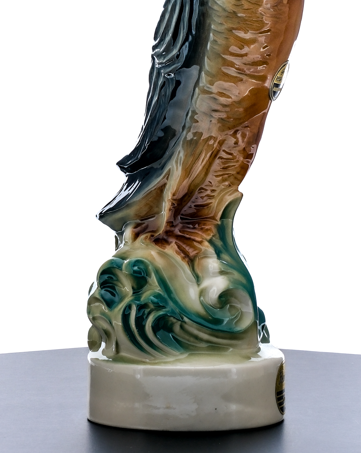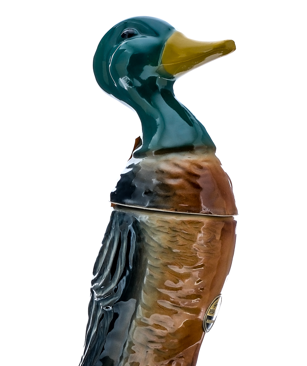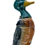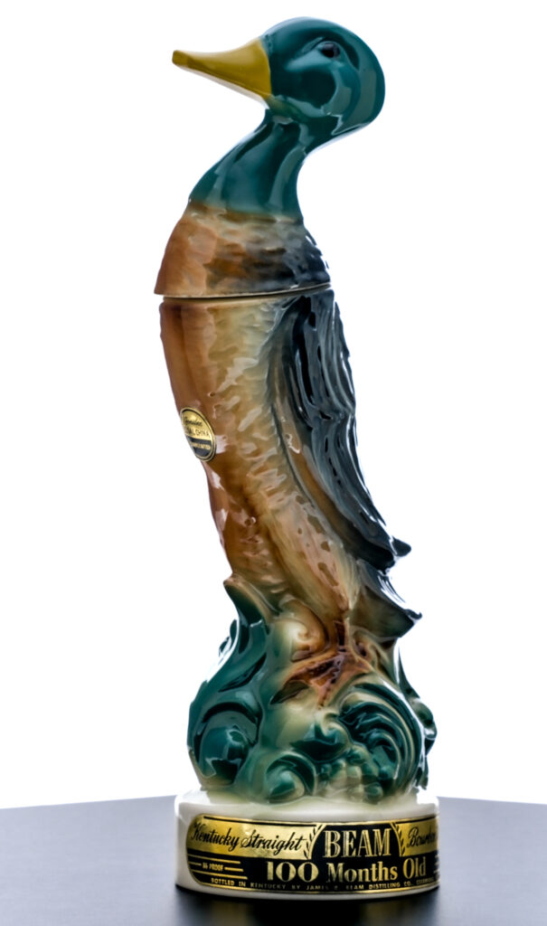 Beam 100 Months Old Kentucky Straight Bourbon Whiskey Ducks Unlimited Mallard Duck Decanter (1957). Painted ceramic decanter manufactured by C. Miller Regal China Corporation. 86 Proof. Stamp seal intact. Plastic shipping tube is dented and warped in a few areas but good overall considering its age. Decanter itself is excellent. Printed labels good (with the front facing label exhibiting some minor staining). 4/5 Quart. Bottled by James B. Beam Distilling Co, Clermont, Kentucky.
