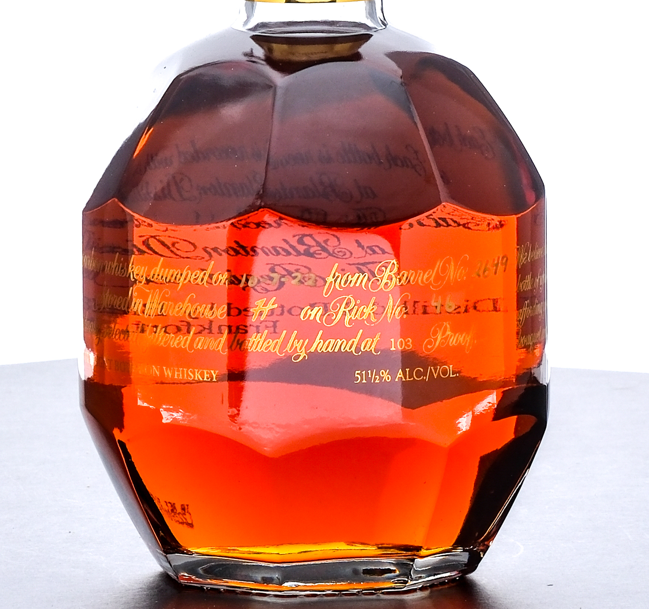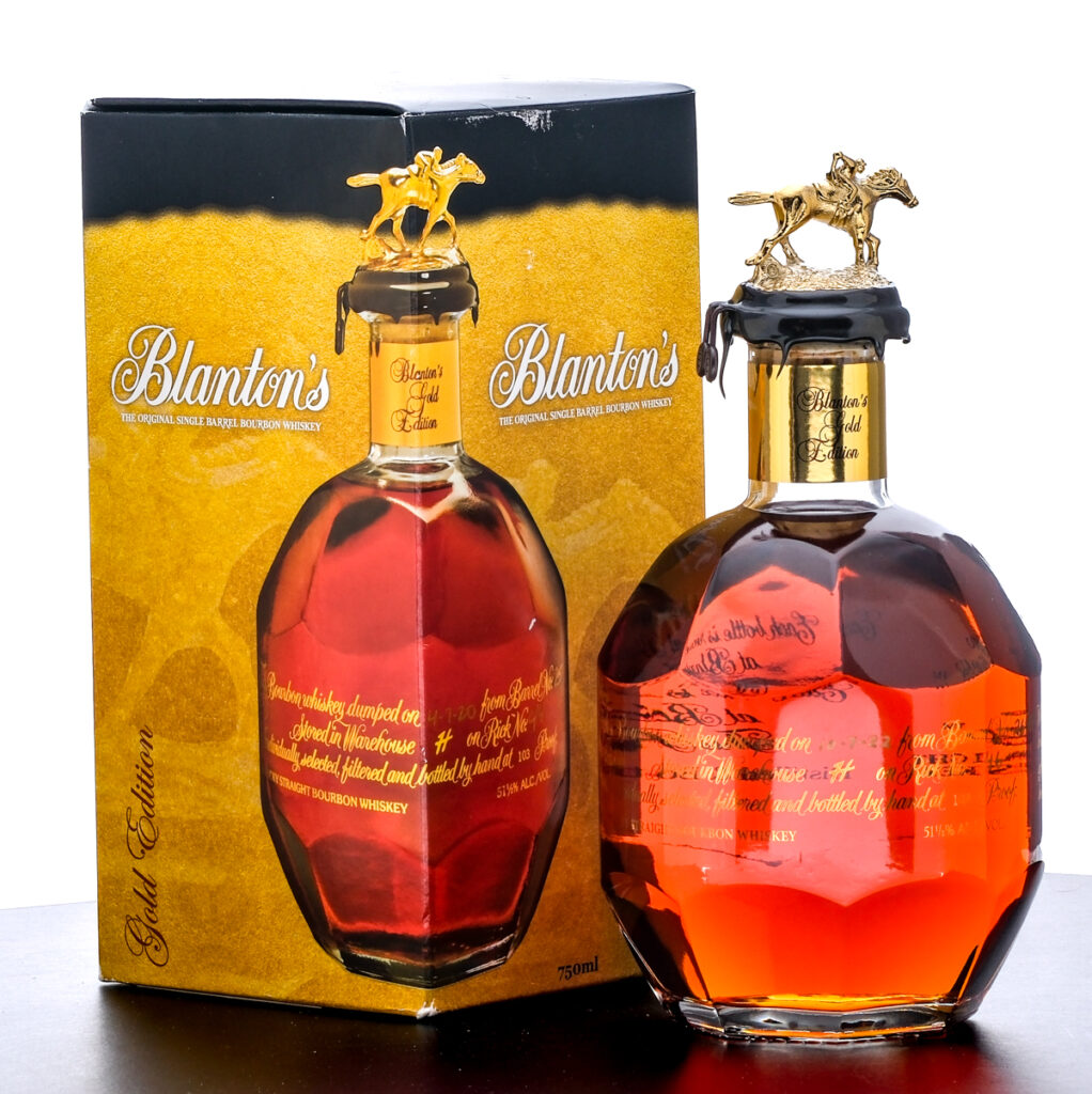 Blanton’s Gold Edition Kentucky Single Barrel Bourbon Whiskey. Dumped on 10-7-2022 from Barrel No. 2649. Stored in Warehouse H on Rick No. 46. Registered Bottle No. 177. 51.5% ALC/VOL (103 Proof). Cardboard box very good, exhibiting slight creasing and color losses in various spots on the box. Included drawstring bag excellent. Wax seal on bottle intact. Racehorse and jockey “O” figure on cork top pristine. Screened and printed labels excellent. 750ml. Distilled & bottled by Blanton Distilling Company
