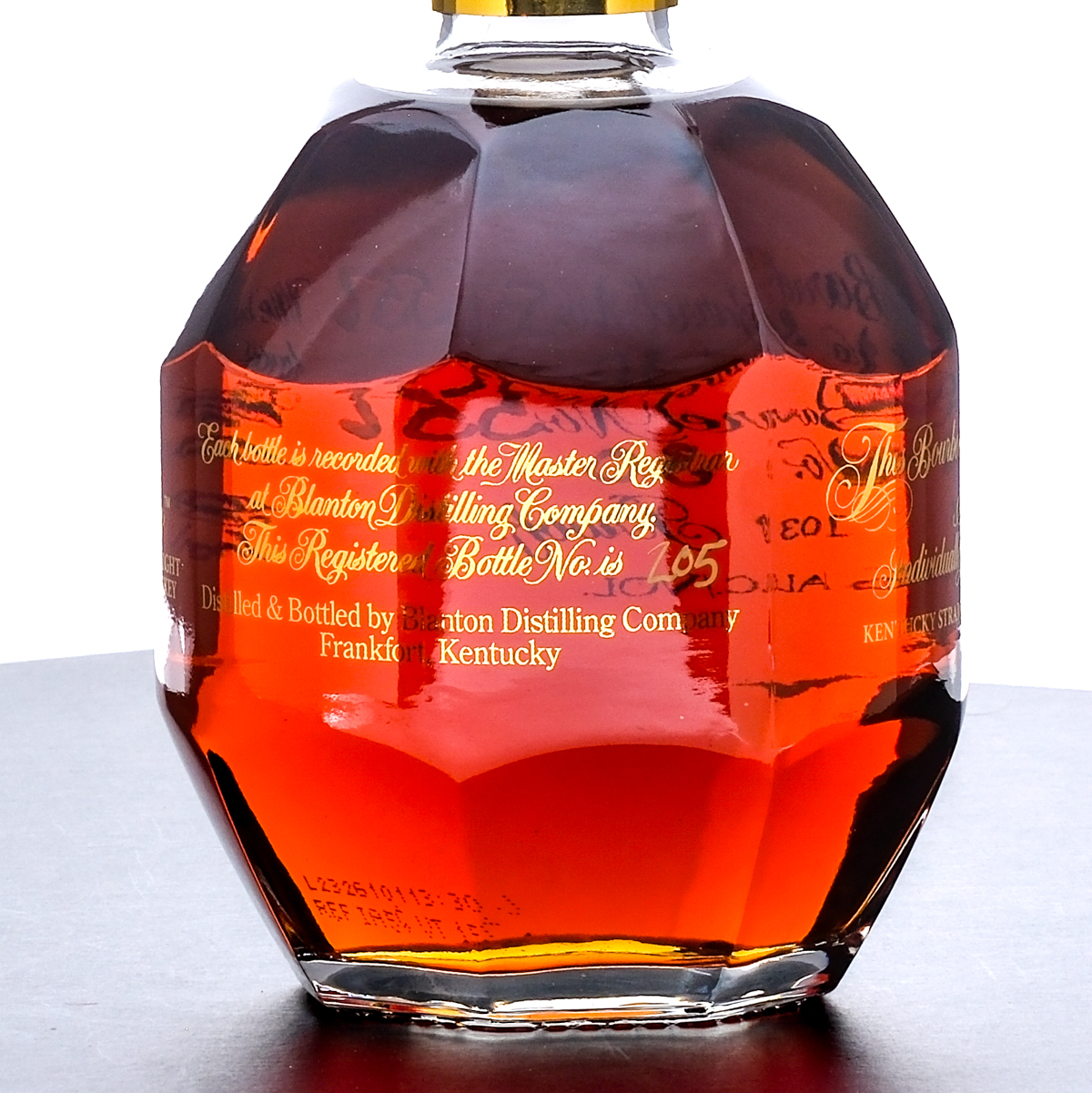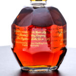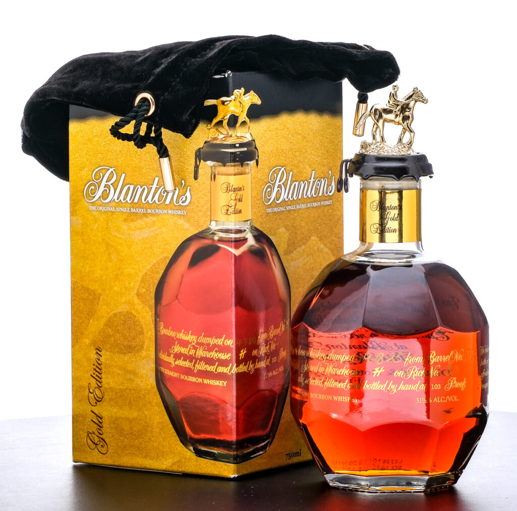 Blanton’s Gold Edition Kentucky Single Barrel Bourbon Whiskey. Dumped on 09-18-2023 from Barrel No. 556. Stored in Warehouse H on Rick No. 30. Registered Bottle No. 205. 51.5% ALC/VOL (103 Proof). Cardboard box very good, exhibiting slight creasing and color losses. Included drawstring bag excellent. Wax seal on bottle intact. Racehorse and jockey “B” figure on cork top pristine. Screened and printed labels excellent. 750ml. Distilled & bottled by Blanton Distilling Company