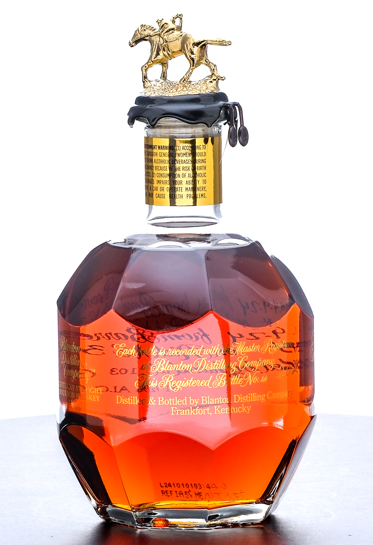 Blanton’s Gold Edition Kentucky Single Barrel Bourbon Whiskey. Dumped on 4-9-24 from Barrel No. 252. Stored in Warehouse H on Rick No. 34. Registered Bottle No. 202. 51.5% ALC/VOL (103 Proof). Cardboard box fair overall. Exterior exhibits creasing though out, while the flap beneath the lid exhibits extensive damage in the form of crushing and tearing. Included drawstring bag excellent. Wax seal on bottle intact. Racehorse and jockey “O” figure on cork top pristine. Screened and printed labels excellent. 750ml. Distilled & bottled by Blanton Distilling Company.