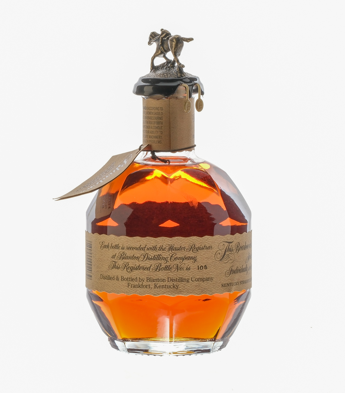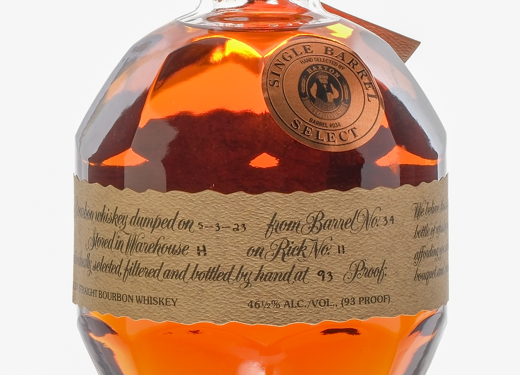 Single Barrel Select. Hand selected by Haxton Liquors. Barrel #034. Dumped on 5-3-23 from Barrel No. 34. Stored in Warehouse H on Rick No. 11. 93 Proof. 46 1/2% ALC/VOL. Original cardboard box very good. Top lid exhibits some creasing. Embroidered drawstring bag housing bottle excellent. Wax seal intact. Hang tag intact. Labels excellent. Glass decanter. Racehorse and jockey figure on cork top pristine. Whiskey Bourbon Blanton’s Bourbon USA Kentucky 2023 1 750ml