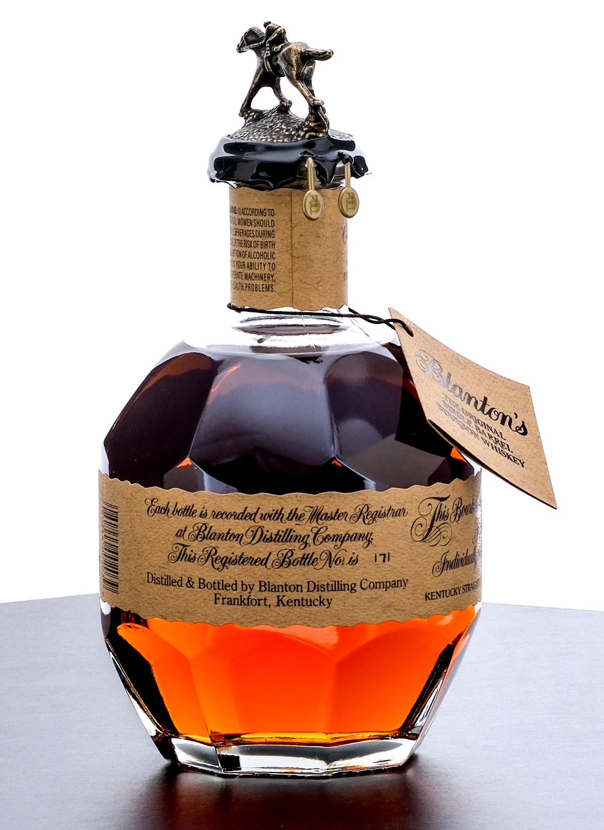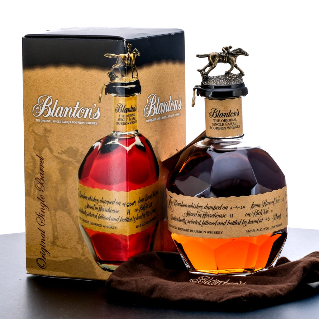 Blanton’s Single Barrel Bourbon Whiskey. Dumped on 2-9-24. Barrel No.137. Warehouse H. Rick No. 11. Bottle No. 171. 46% ALC/VOL (93 Proof). Cardboard box in very good condition, displays some small creasing on the lid. Drawstring bag excellent. Wax seal excellent. Hang tag intact. Printed labels excellent. Racehorse and jockey “A” figure on cork top pristine. 750ml. Distilled and bottled by Blanton Distilling Company, Frankfort Kentucky.
