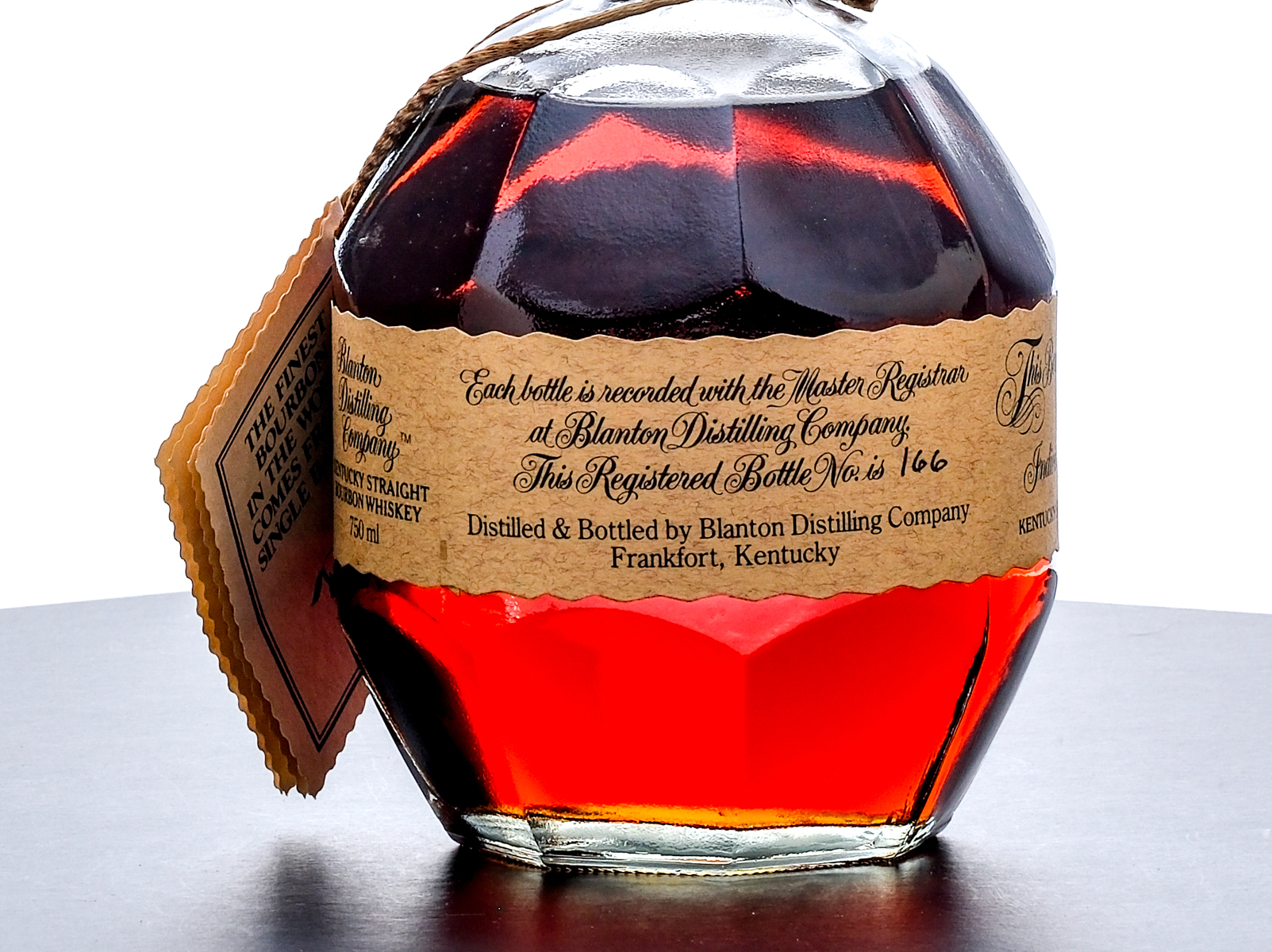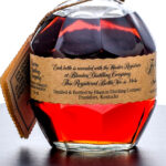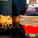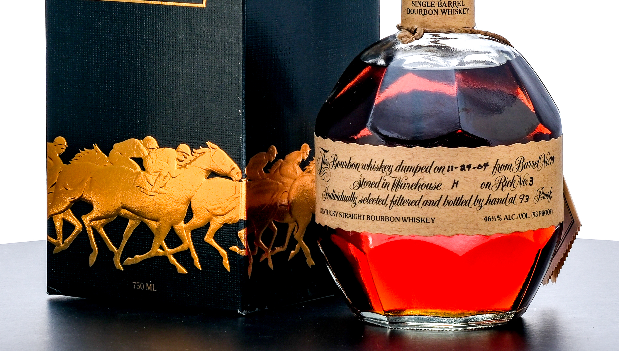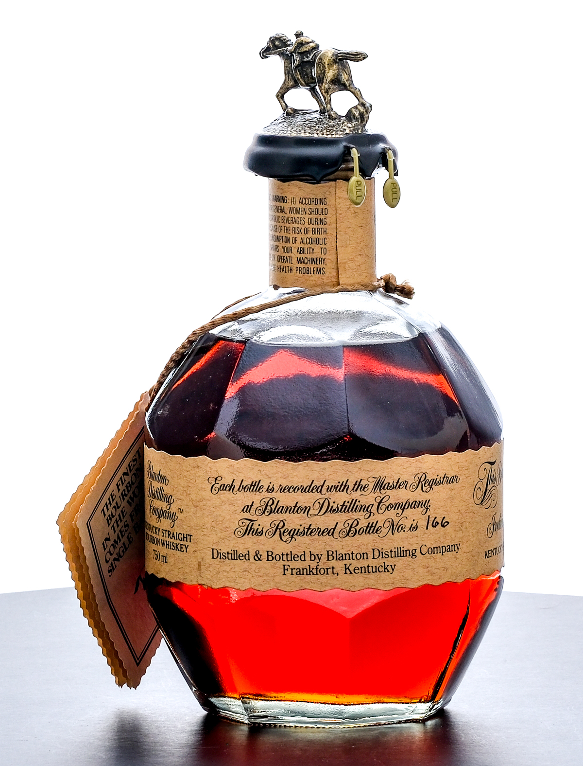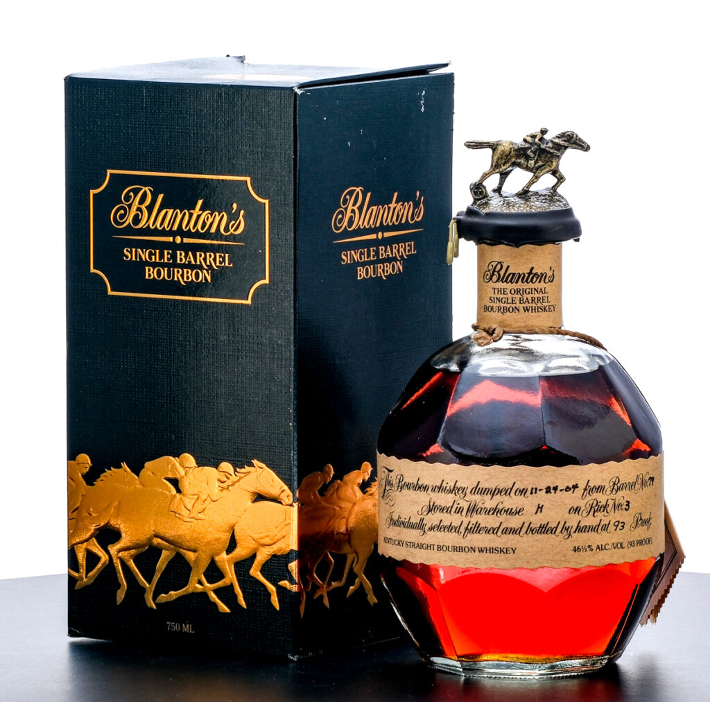 From The Collection of Michael Aronoff: Blanton’s Single Barrel Kentucky Straight Bourbon Whiskey. Dumped on 11-24-04. Barrel No. 79. Warehouse H. Rick No. 3. Registered Bottle No. 166. 46.5% ALC/VOL (93 Proof). Cardboard box in very good condition (exhibiting some creasing in the area around the top flap and some minor losses in the foil stamp). Included embroidered drawstring bag excellent. There is a faint hairline crack in the wax seal running vertically from one of the pull tabs but is not compromising to the seal overall. Printed labels excellent. Racehorse and jockey “T” figure on cork top pristine. 750ml. Distilled & bottled by Blanton Distilling Company.