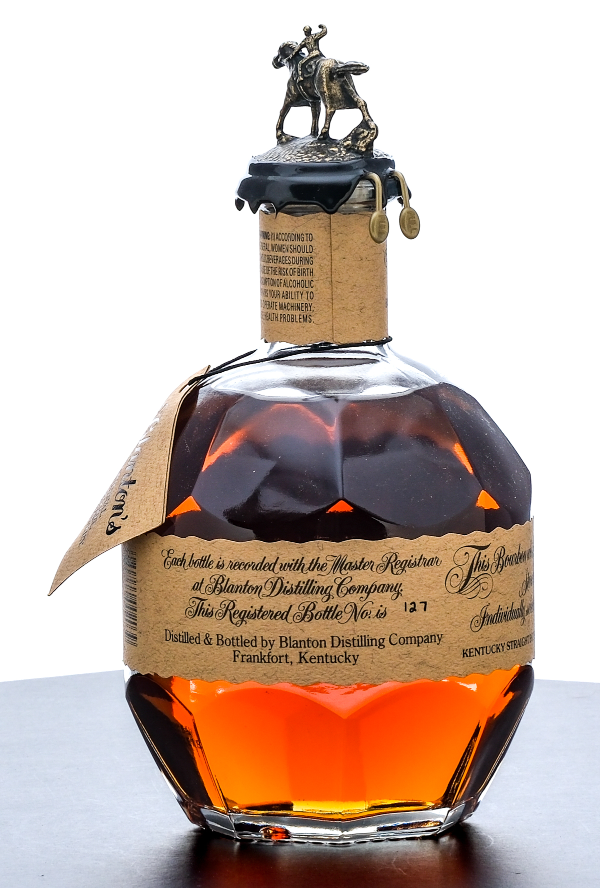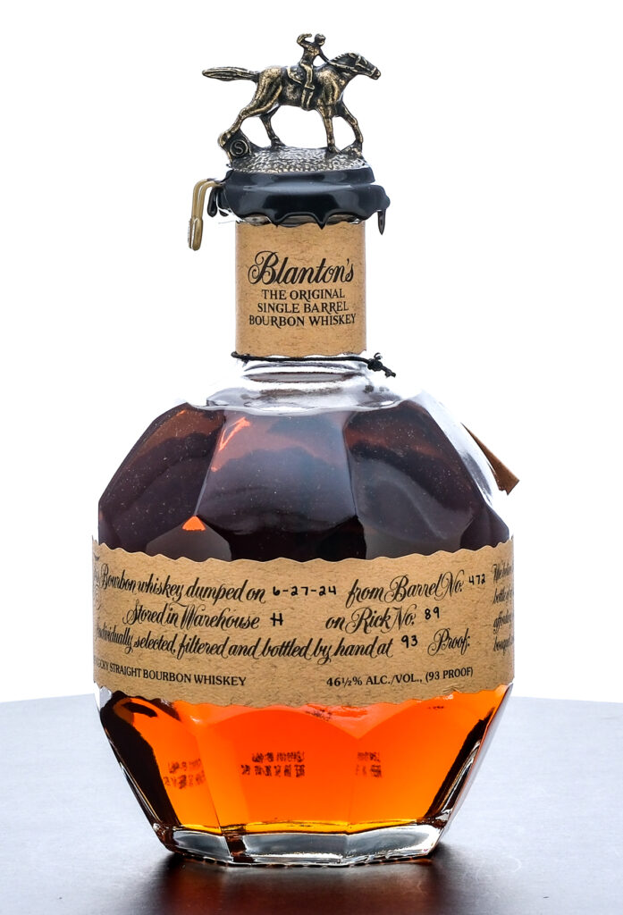 Blanton’s Single Barrel Kentucky Straight Bourbon Whiskey. Dumped on 6-27-24. Barrel No.472. Warehouse H. Rick No. 89. Registered Bottle No. 127. 46.5% ALC/VOL (93 Proof). Does not come with the cardboard box or draw string bag. Bottle has protective plastic mesh surrounding it. Wax seal and hang tag intact. Printed labels excellent. Racehorse and jockey “S” figure on cork top pristine. 750ml. Distilled and bottled by Blanton Distilling Company.