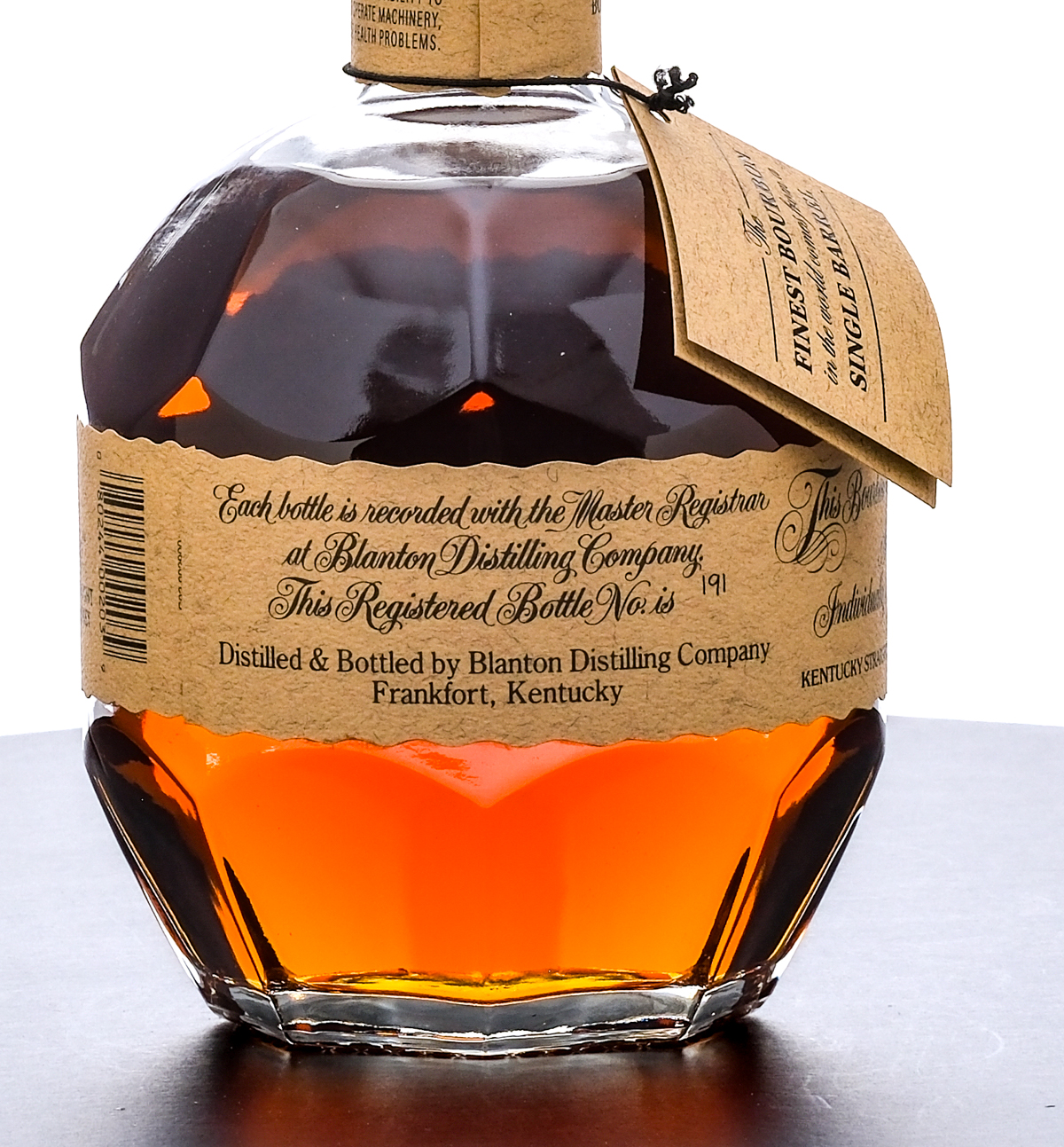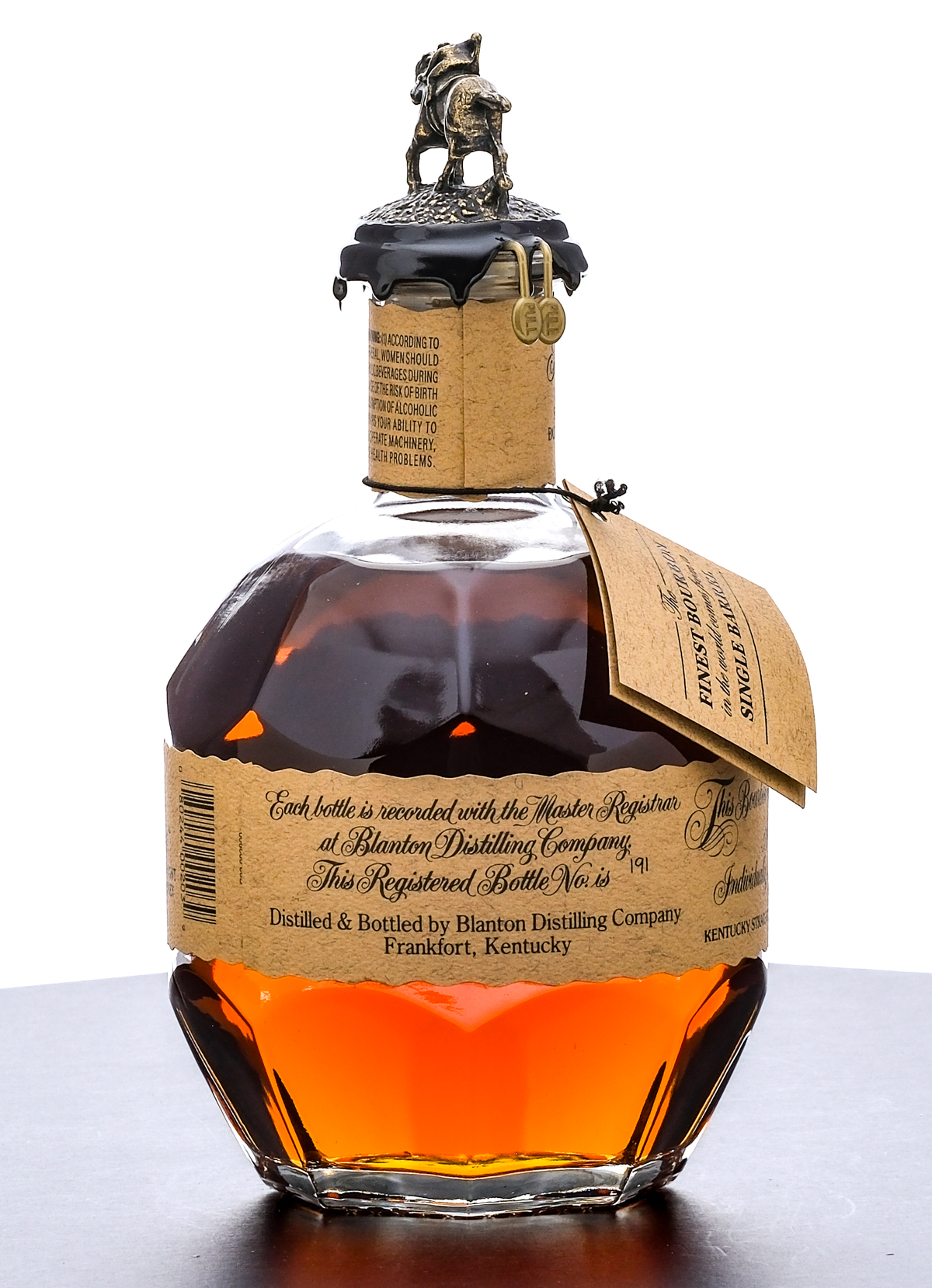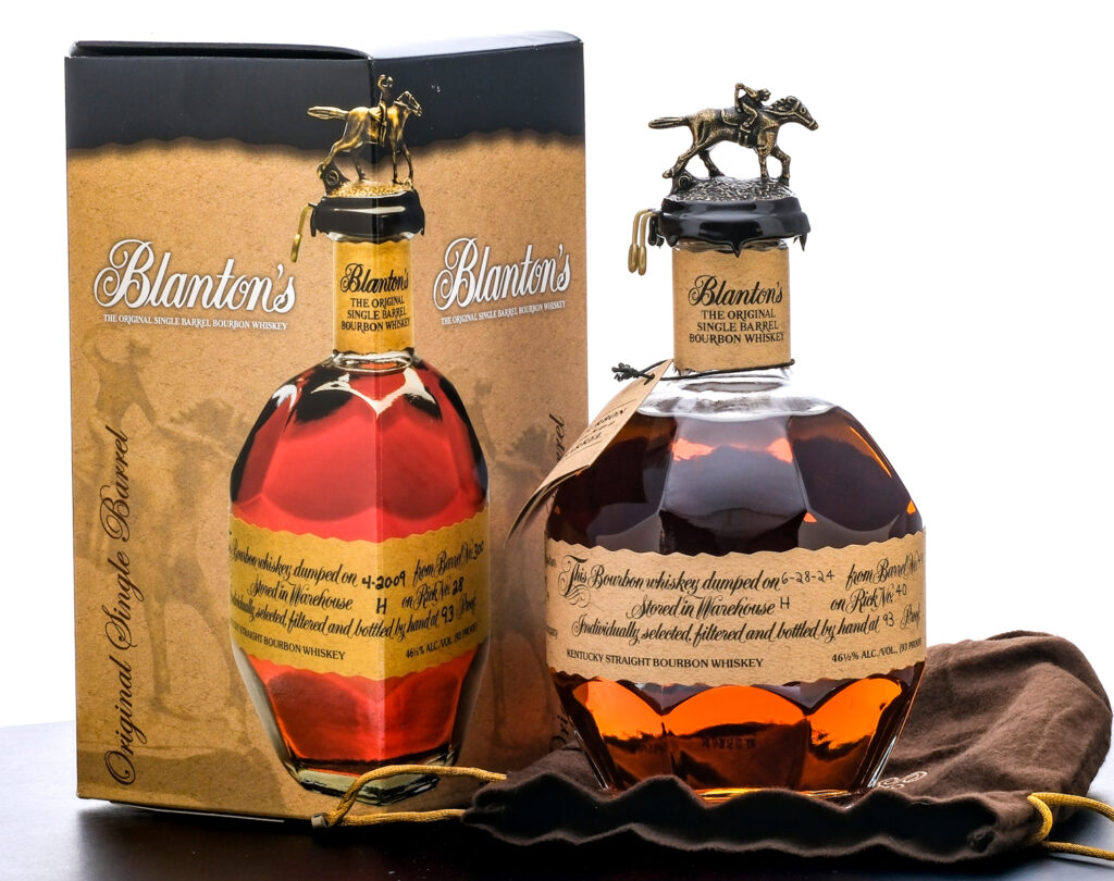 Blanton’s Single Barrel Kentucky Straight Bourbon Whiskey. Dumped on 6-28-24. Barrel No.498. Warehouse H. Rick No. 40. Registered Bottle No. 191. 46.5% ALC/VOL (93 Proof). Cardboard box in good condition, displaying some instances of creasing on the lid and tearing on the flap beneath. Included drawstring bag excellent. Wax seal and hang tag intact. Printed labels excellent. Racehorse and jockey “O” figure on cork top pristine. 750ml. Distilled and bottled by Blanton Distilling Company.