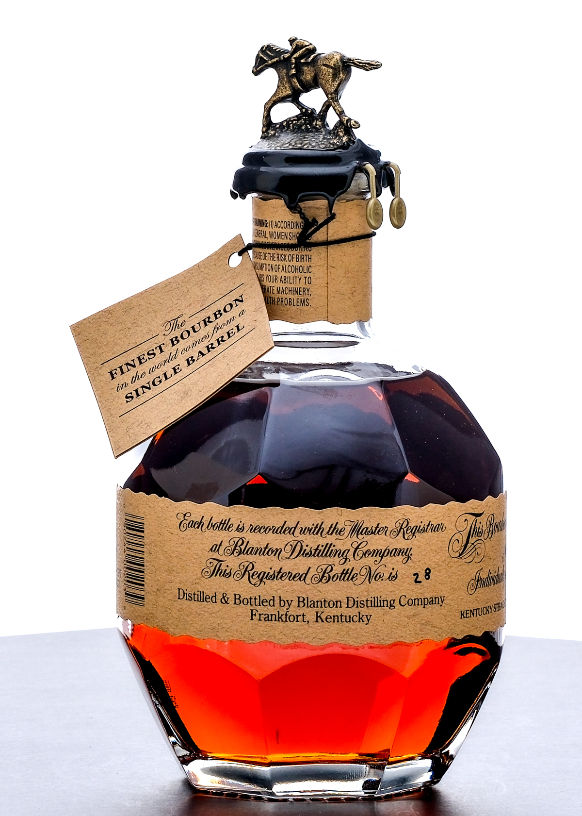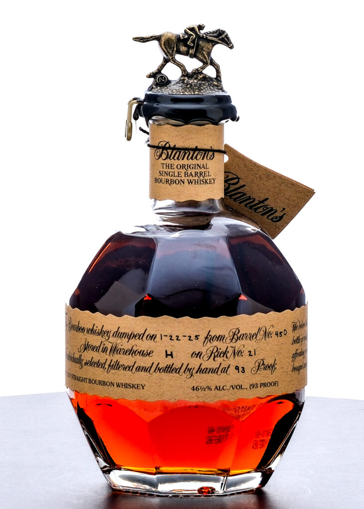 Blanton’s Single Barrel Kentucky Straight Bourbon Whiskey. Dumped on 1-22-25. Barrel No.450. Warehouse H. Rick No. 21. Registered Bottle No. 28. 46.5% ALC/VOL (93 Proof). Comes with protective plastic webbing  Wax seal and hang tag intact. Printed labels excellent. Racehorse and jockey “N” figure on cork top pristine. 750ml. Distilled and bottled by Blanton Distilling Company.