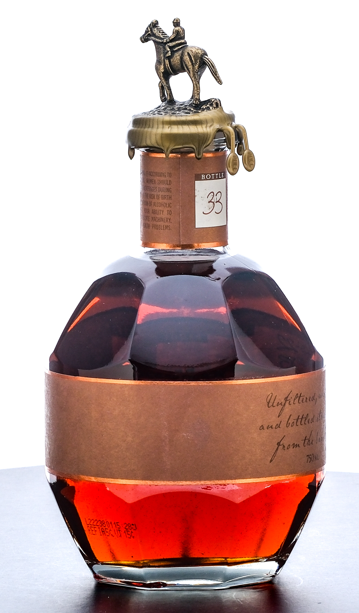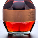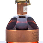 Blanton’s Straight From The Barrel Bourbon Whiskey (2022). Single Barrel. Dumped on 8-25-22 from Barrel No. 1283. Stored in Warehouse H on Rick No. 3. Bottle 33. 63.9% ALC/VOL (127.7 Proof). Cardboard box good, exhibiting creasing and slight tearing in the jockeys stable located on the inner flap of the lid. Box also exhibits some color losses on corners and seams. Included drawstring bag excellent. Wax seal on bottle intact. Printed labels excellent. Racehorse and jockey “B” figure on cork top pristine. 750ml. Distilled & bottled by Blanton Distilling Company.