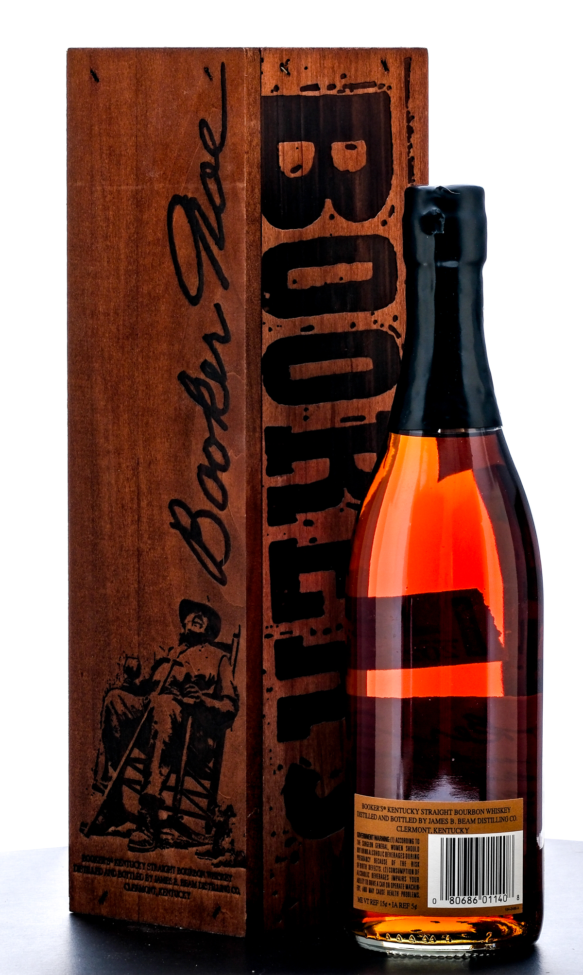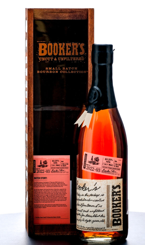 Booker’s “Kentucky Tea Batch” 7 Year 4 Month 14 Days Kentucky Straight Bourbon Whiskey. Batch #2022-03. 63.25% ALC/VOL (126.5 Proof). Wooden presentation box and acrylic window excellent. Information card intact and present. Wax seal intact. Printed labels excellent. 750ml. Distilled and Bottled by James B. Beam Distilling CO.
