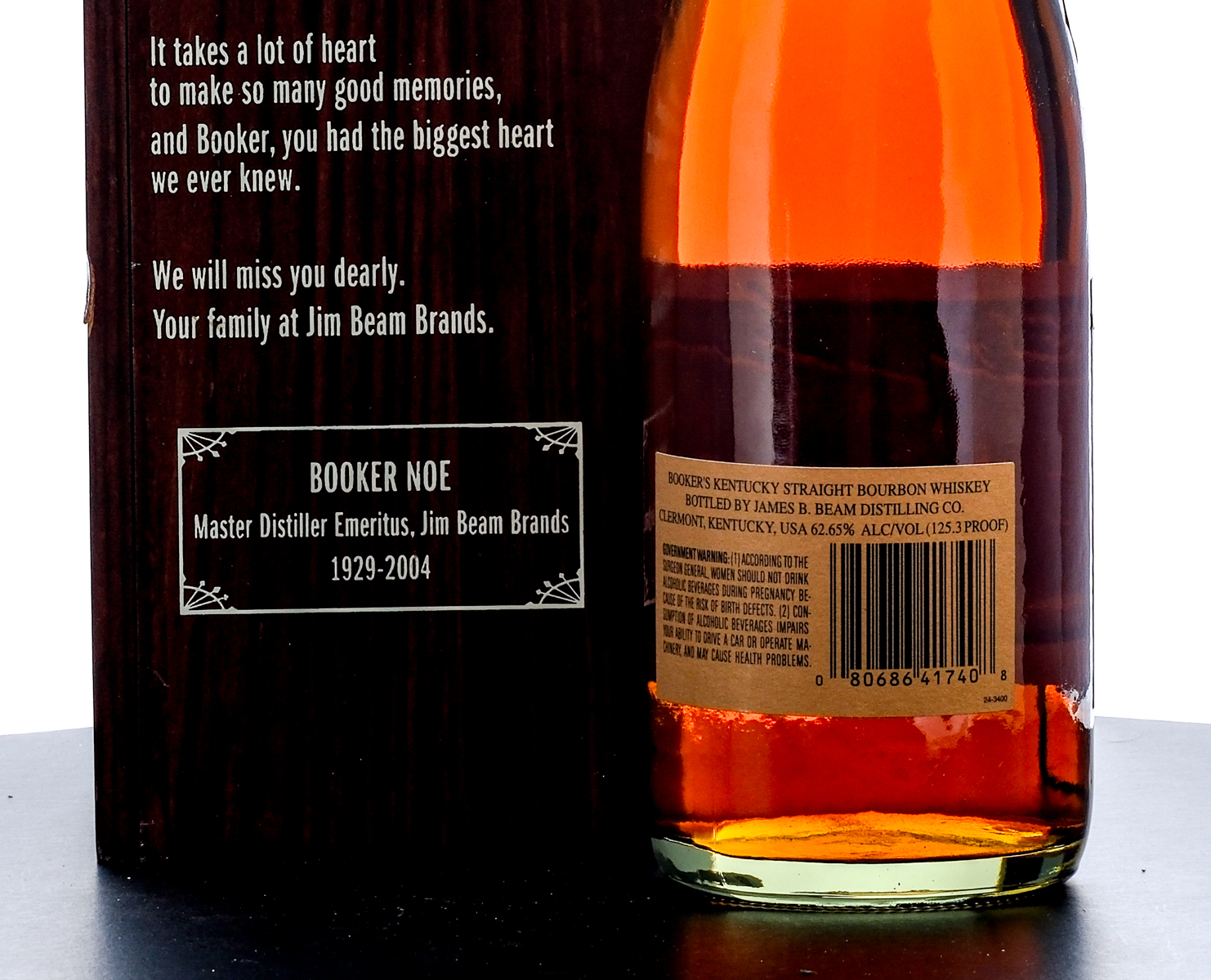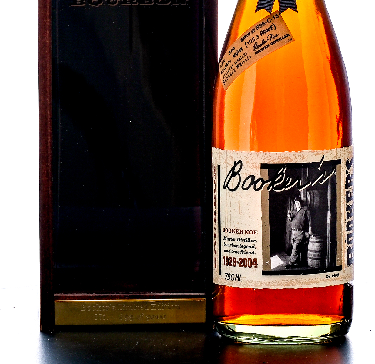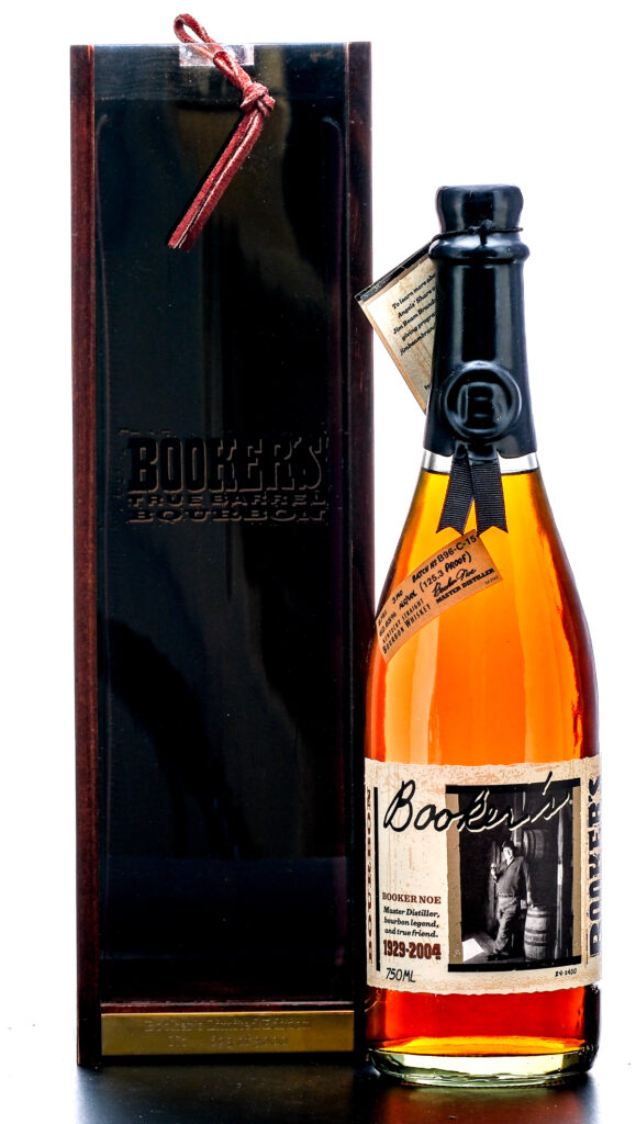 From The Collection of Michael Aronoff: Booker’s Small Batch Kentucky Straight Bourbon Whiskey, Batch No. B96-C-15, Commemorating the life of master distiller, bourbon legend and true friend, Booker Noe (1929-2004). Aged 8 years and 3 months. Bottle no. 693 of 3000 (indicated by the engraved plaque on the box). 62.65 ALC/VOL (125.3 Proof). Wooden presentation box and plexiglass window excellent. Box has polished and engraved plaque with bottle number info. Wax seal, pull tab and hangtag intact. Printed labels excellent. 750ml. Bottled by James B. Beam Distilling Co., Clermont, Kentucky, USA.