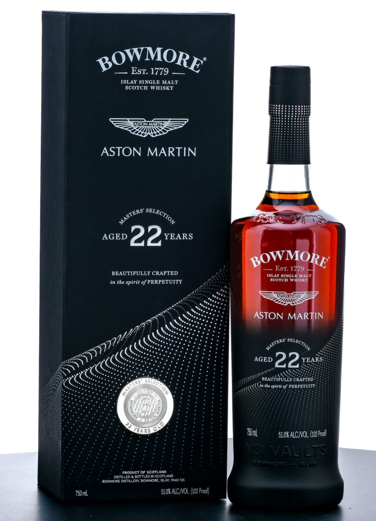 Bowmore Aston Martin Edition 22 Year Islay Single Malt Scotch (2023). Masters’ Selection. No.1 Vaults. 51% ALC./VOL. (102 Proof). Display box in excellent condition. Foil seal and screen printed labels likewise excellent. 750ml. Imported by Beam Suntory Import Co. (Chicago, IL).