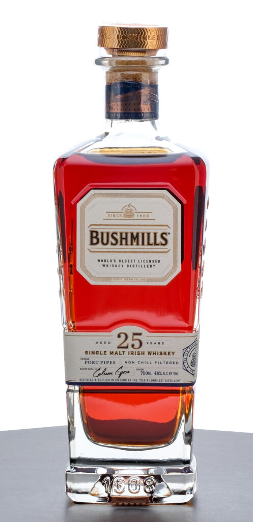 Bushmill’s 25 Year Single Malt Irish Whiskey. Port Pipes finish. 46% ALC/VOL. Plastic seal intact. Printed labels very good (rear facing label exhibits some nicks and losses). 750ml. Distilled & bottled at the Old Bushmill’s Distillery. Imported by Proximo Spirits (Jersey City, NJ).