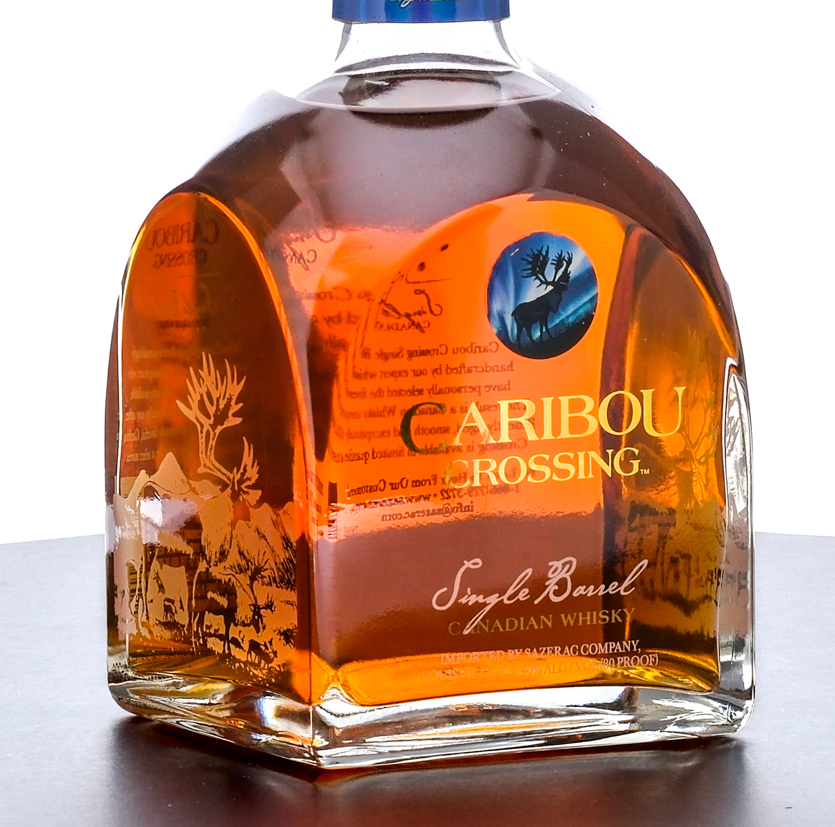 Caribou Crossing Single Barrel Canadian Whisky. 40% ALC/VOL (80 Proof). Does not have cardboard box or drawstring bag. Wax seal on bottle intact. Caribou figurine on cork top pristine. Screened and etched labels excellent. 750ml. Sazerac Distillers of Canada Inc. Imported by Sazerac Company (Louisville, KY).
