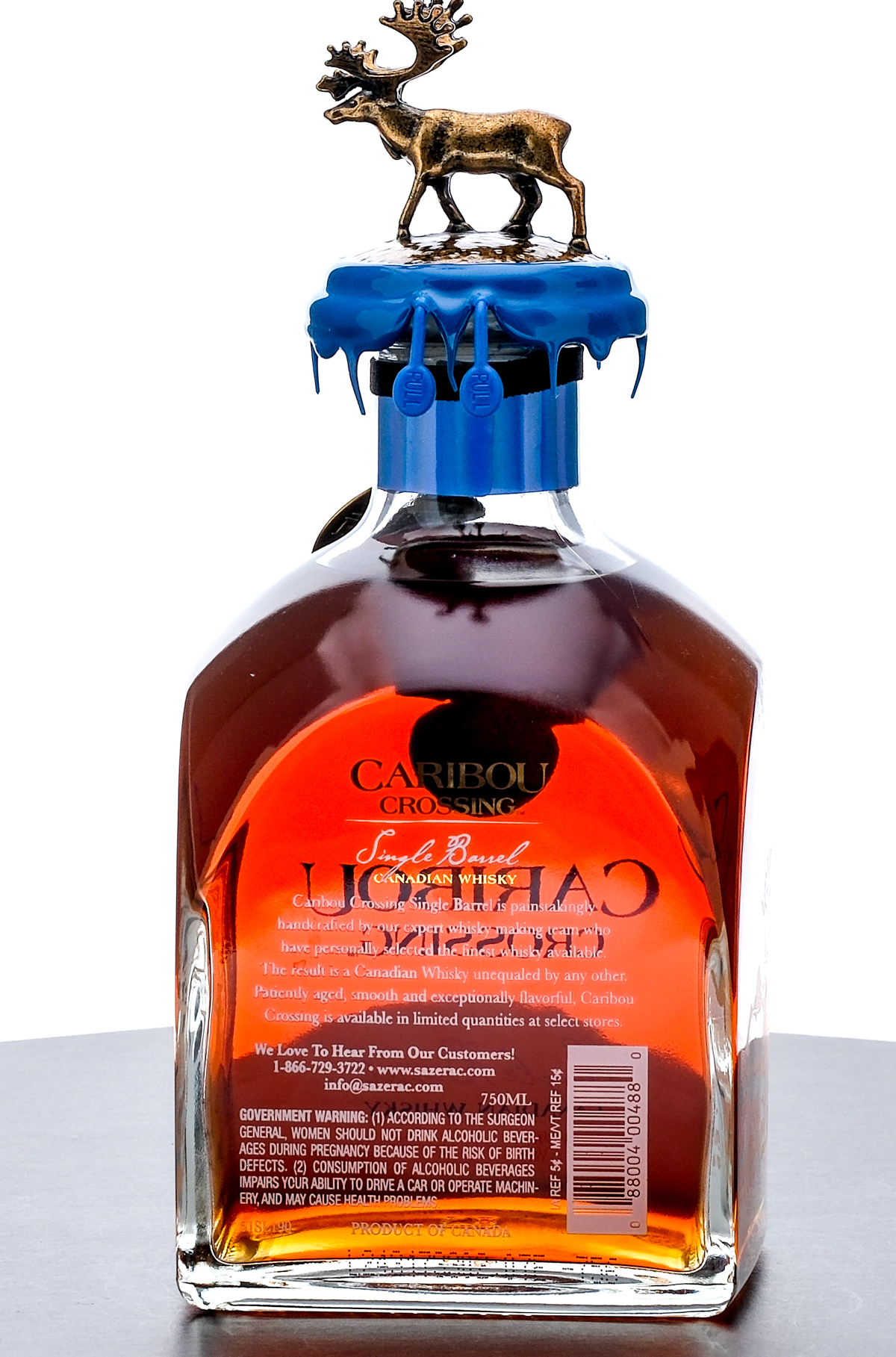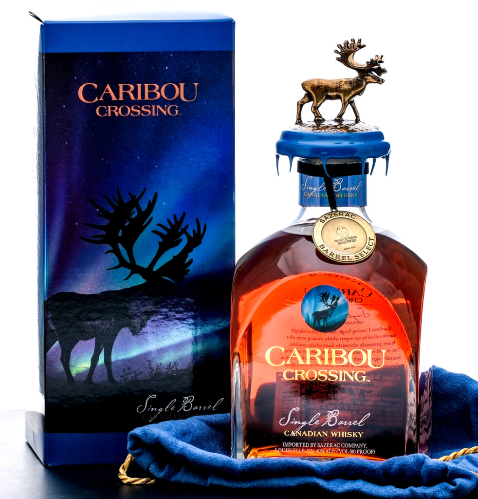Caribou Crossing Single Barrel Canadian Whisky. Sazerac Barrel Select by Crazy Bruce’s Liquors (Barrel #756). 40% ALC/VOL (80 Proof). Cardboard box very good (exhibiting some creasing at one corner). Included drawstring bag excellent. Wax seal on bottle and Sazerac Barrel Select hanging medallion intact. Caribou figurine on cork top pristine. Screened and etched labels excellent. 750ml. Sazerac Distillers of Canada Inc. Imported by Sazerac Company (Louisville, KY).