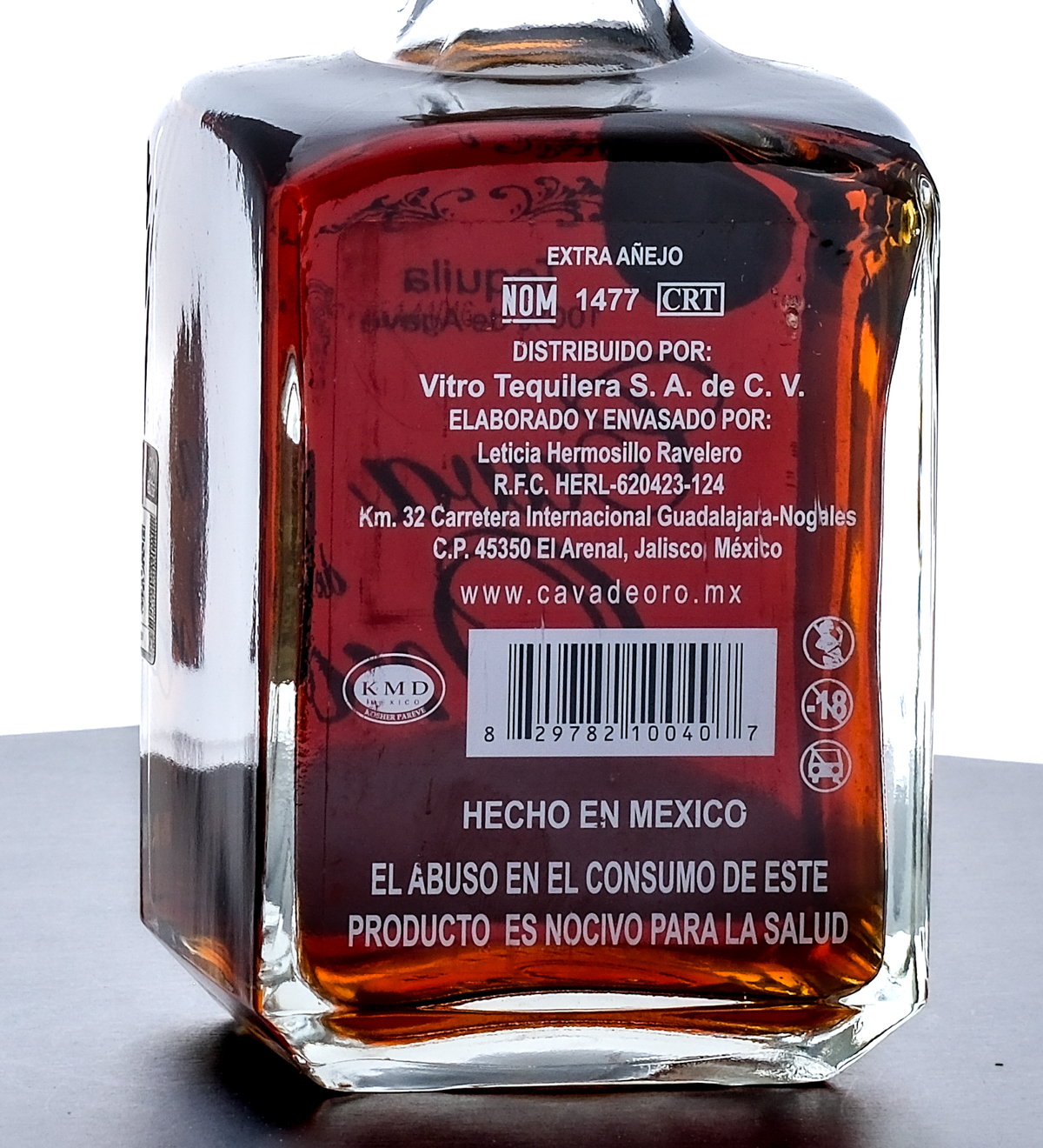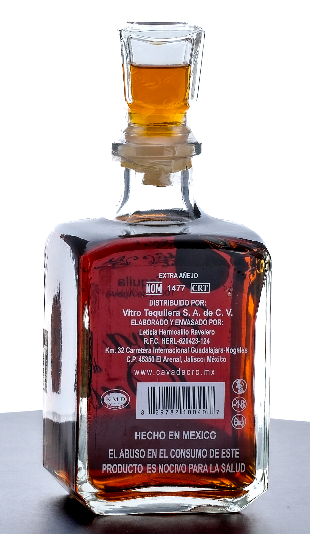 Cava de Oro Extra Anejo Tequila (2013). 100% de Agave. 38% ALC/VOL. Plastic seal intact (the bottle stopper/top beneath contains an extra shot of Tequila). Spirits of Mexico 2012 Award gold medallion pristine. Screened and printed labels excellent. 750ml. Made and packaged by Leticia Hermosillo Ravelero. Distributed by Vitro Tequilera S.A. de C.V.