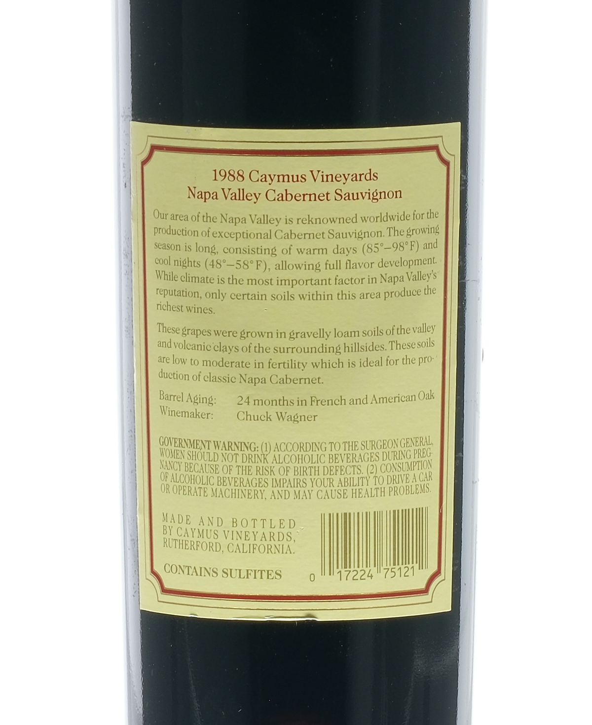 Fill Level = Mid Neck. Label excellent. Wine California Caymus Vineyard USA Napa Valley Cabernet Sauvignon 1988 1 750ml