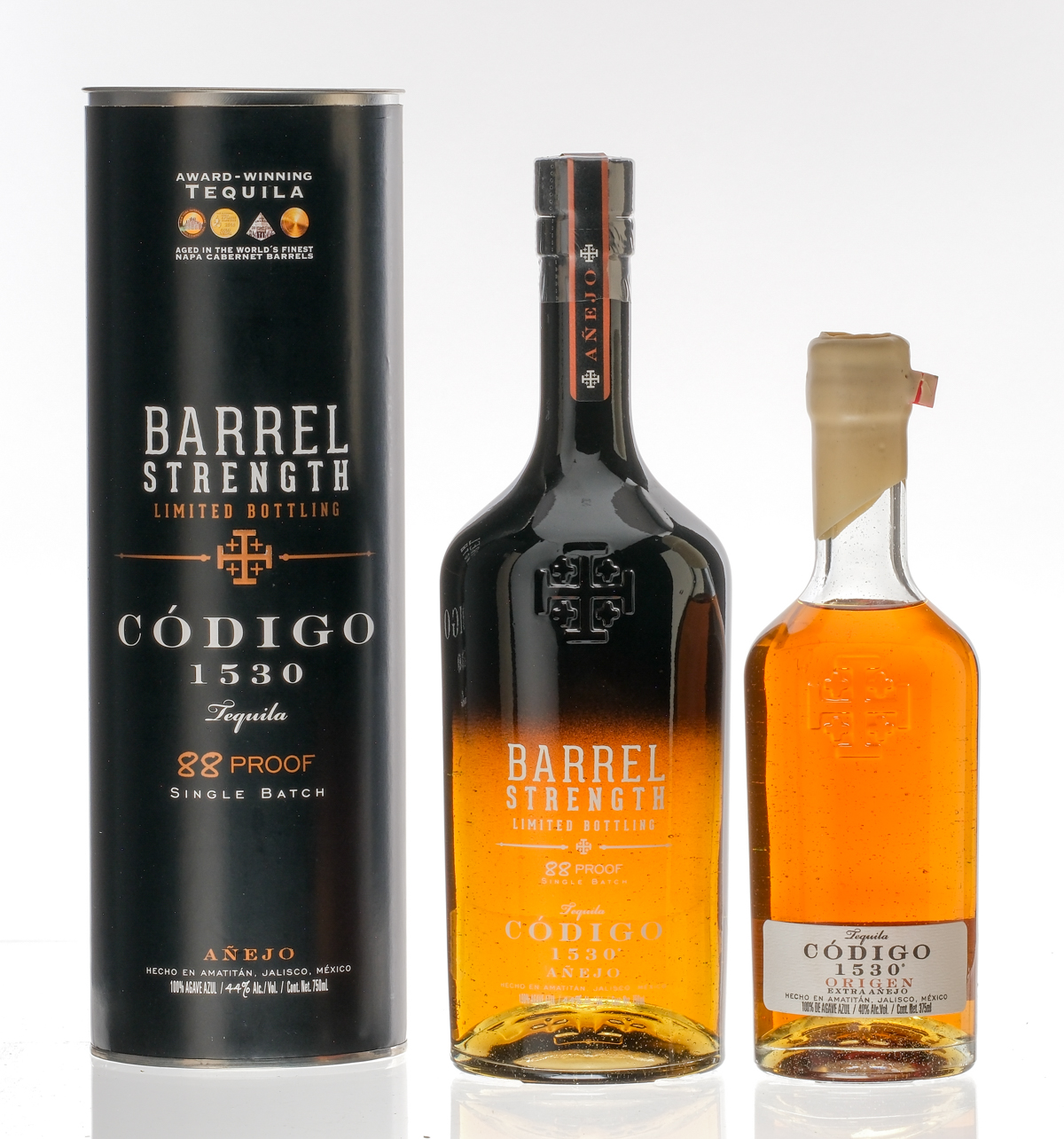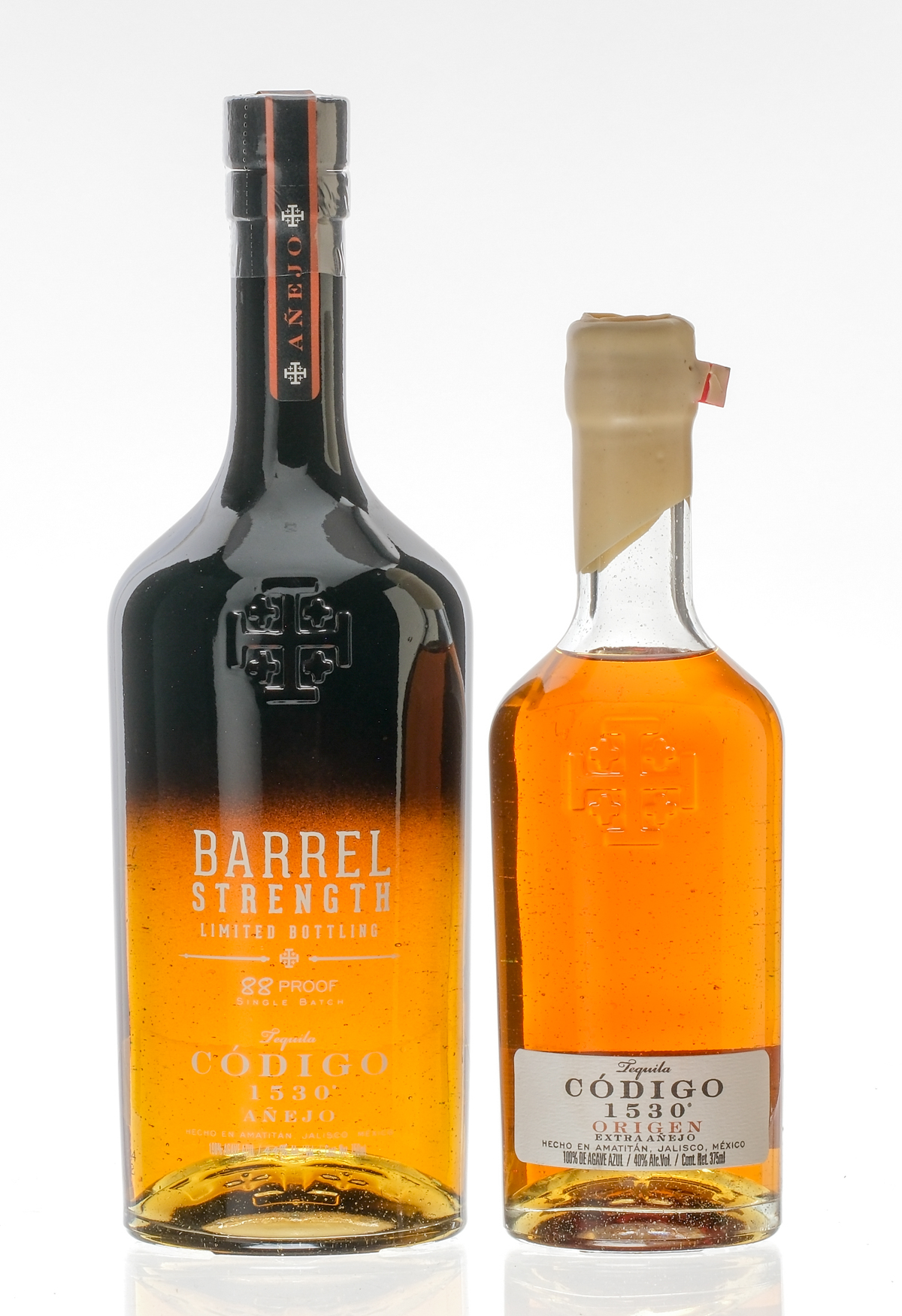 1x 375ml bottle of Codigo 1530 Origen Extra Anejo Tequila. 40% ALC/VOL. Wax seal intact. Labels excellent. 1x 750ml bottle of Codigo 1530 Barrel Strength Limited Bottling Anejo Tequila. 88 Proof. 44% ALC/VOL. Original cardboard tube excellent. Plastic seal intact. Labels excellent. Tequila Anejo / Xtra Anejo Codigo 1530 Mexico 2022 / Unknown 2 375ml/750ml