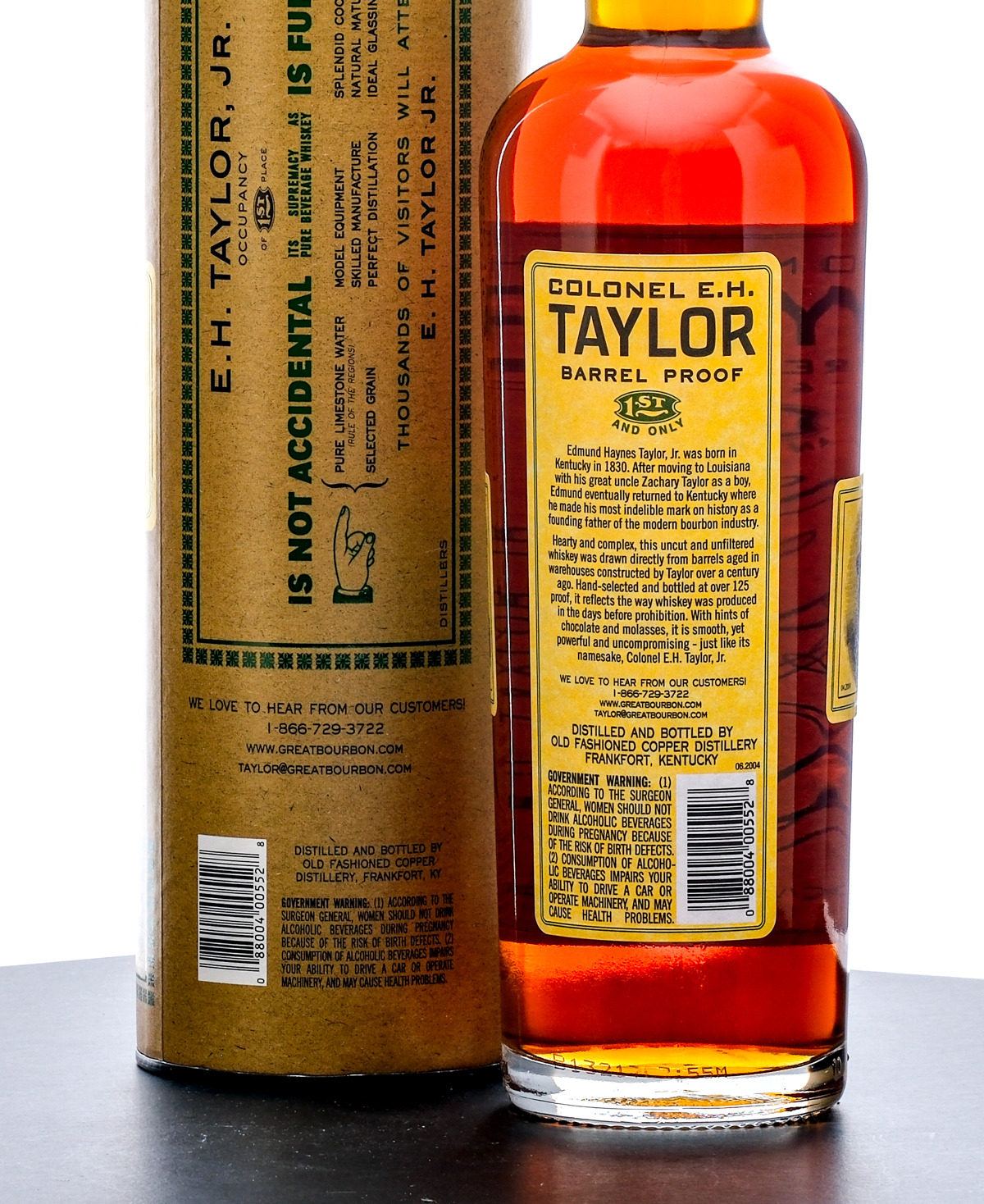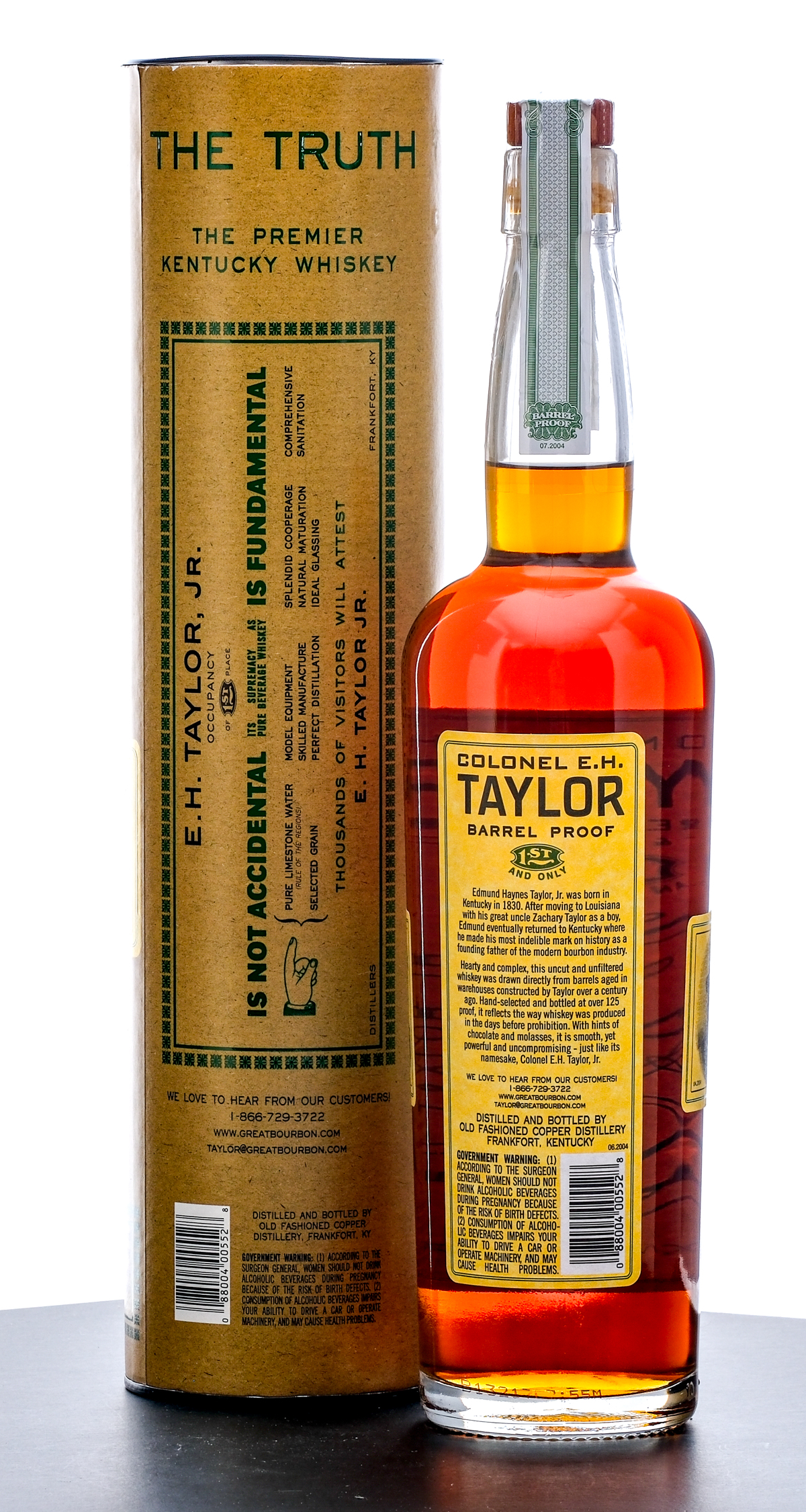 From The Collection of Michael Aronoff: Colonel E. H. Taylor Barrel Proof Straight Kentucky Bourbon Whiskey, Uncut & Unfiltered (2013). Laser Code: B13217D7:55M. 67.7% ALC/VOL (135.4 Proof). Cardboard tube very good, exhibits one small area of minor color losses. Plastic and stamp seal intact. Printed labels excellent. 750ml. Old Fashioned Copper Distillery.