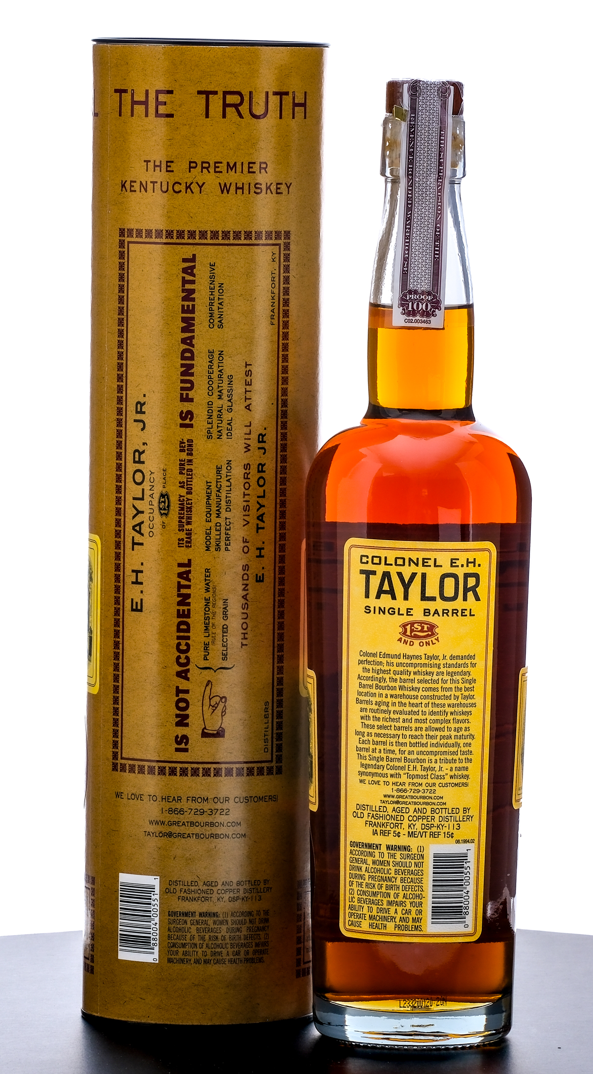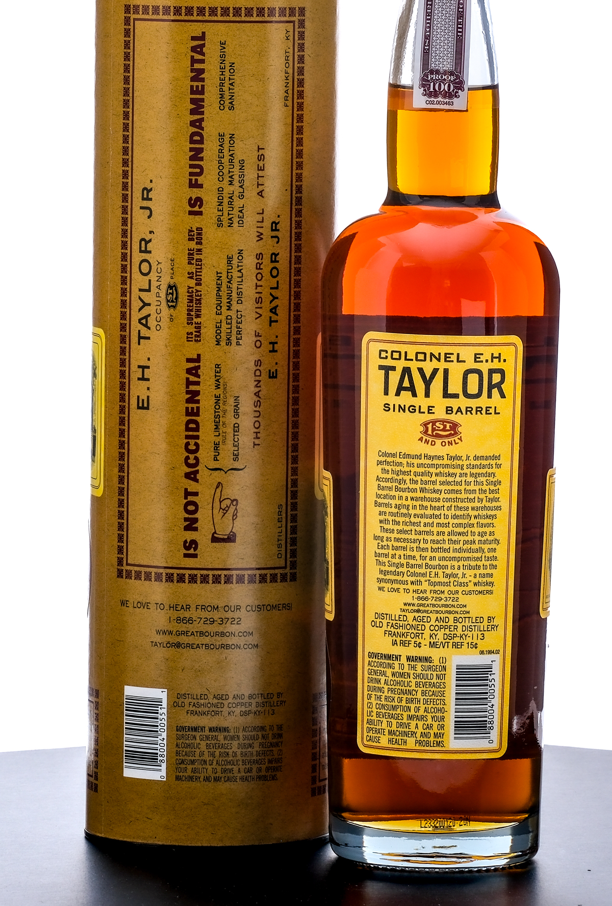 Colonel E. H. Taylor Single Barrel Bottled-in-Bond Straight Kentucky Bourbon Whiskey (2023). Sazerac Barrel Select. Hand selected by Conti’s Wines & Spirits (Barrel #101). 50% ALC/VOL (100 Proof). Cardboard tube excellent. Plastic and stamp seal on bottle intact. Printed labels excellent. 750ml. Distilled, aged, and bottled by Old Fashioned Copper Distillery.