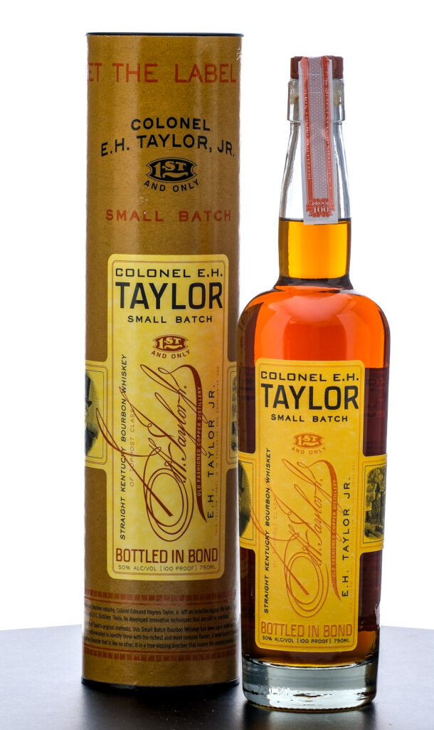 Colonel E.H. Taylor Small Batch Kentucky Straight Bourbon Whiskey (Date unknown due to poor laser code quality). Bottled In Bond. 50% ALC/VOL (100 Proof). Cardboard tube in very good condition, displaying some minor scuffs. Plastic and stamp seal intact. Printed labels excellent. 750ml. Distilled, Aged and Bottled by Old Fashioned Copper Distillery