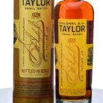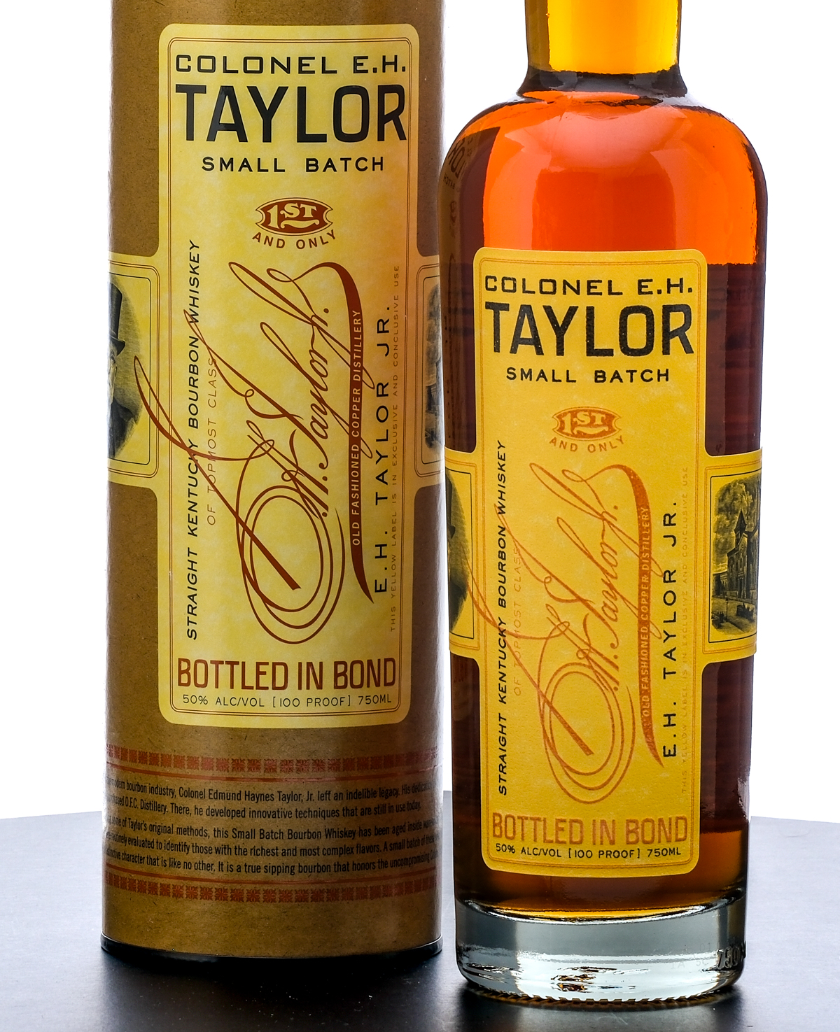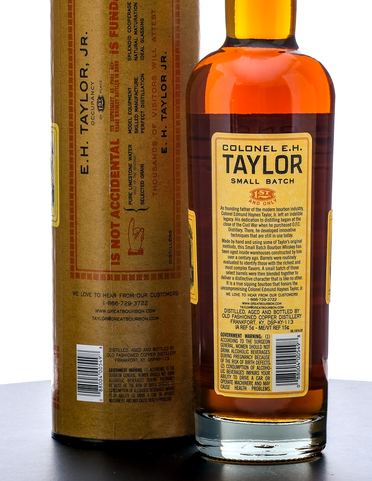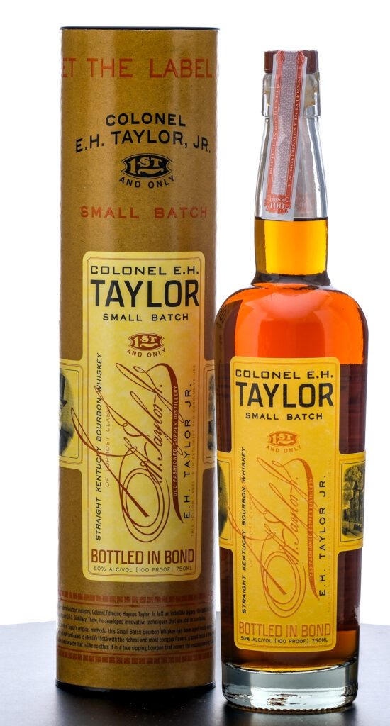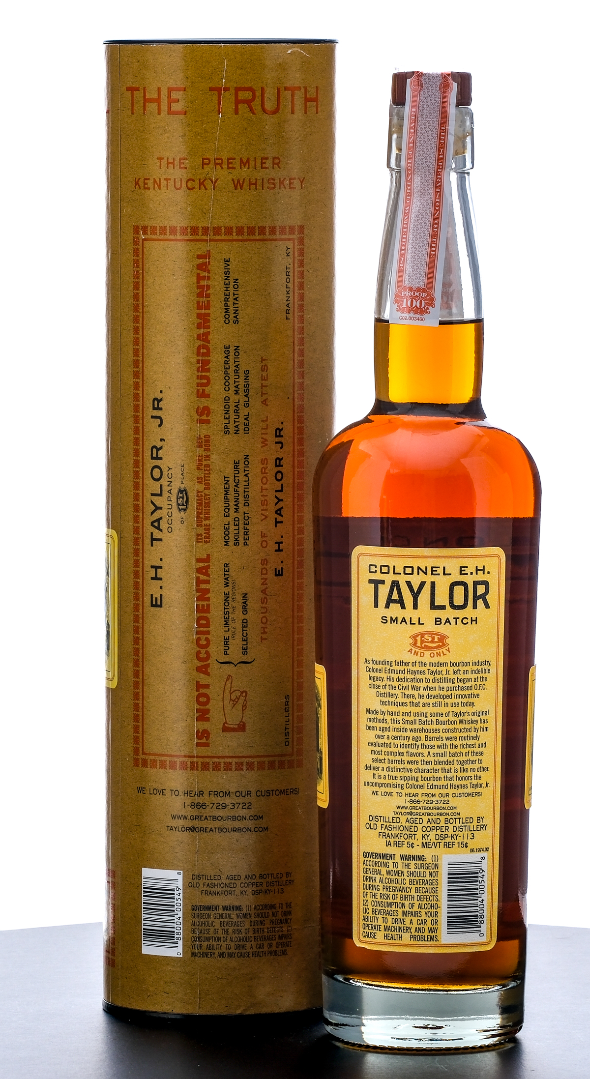Colonel E.H. Taylor Small Batch Kentucky Straight Bourbon Whiskey (Date unknown due to poor laser code quality). Bottled In Bond. 50% ALC/VOL (100 Proof). Cardboard tube in good condition, displaying some minor scuffs and one small cut running the vertical length of the back. Plastic and stamp seal intact. Printed labels excellent. 750ml. Distilled, Aged and Bottled by Old Fashioned Copper Distillery.