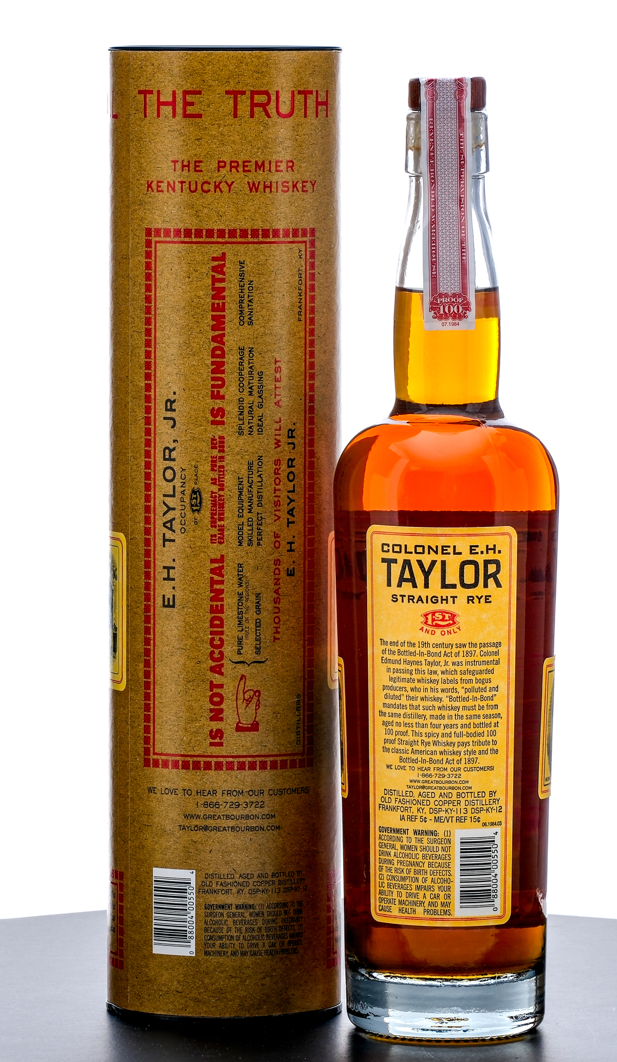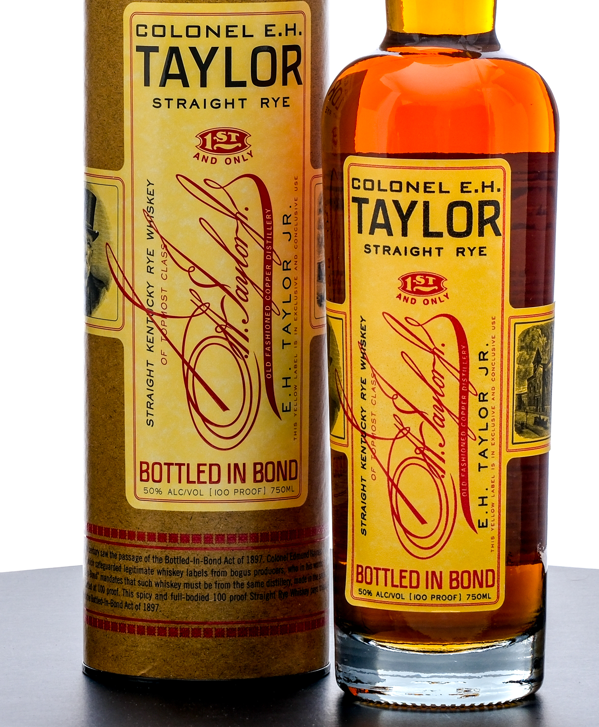 Colonel E. H. Taylor Bottled in Bond Straight Kentucky Rye Whiskey (2024). Laser Code: L2128001 10:19D. 50% ALC/VOL (100 Proof). Cardboard tube excellent. Plastic and stamp seal intact. Printed labels excellent. 750ml. Distilled, aged and bottled by Old Fashioned Copper Distillery.