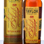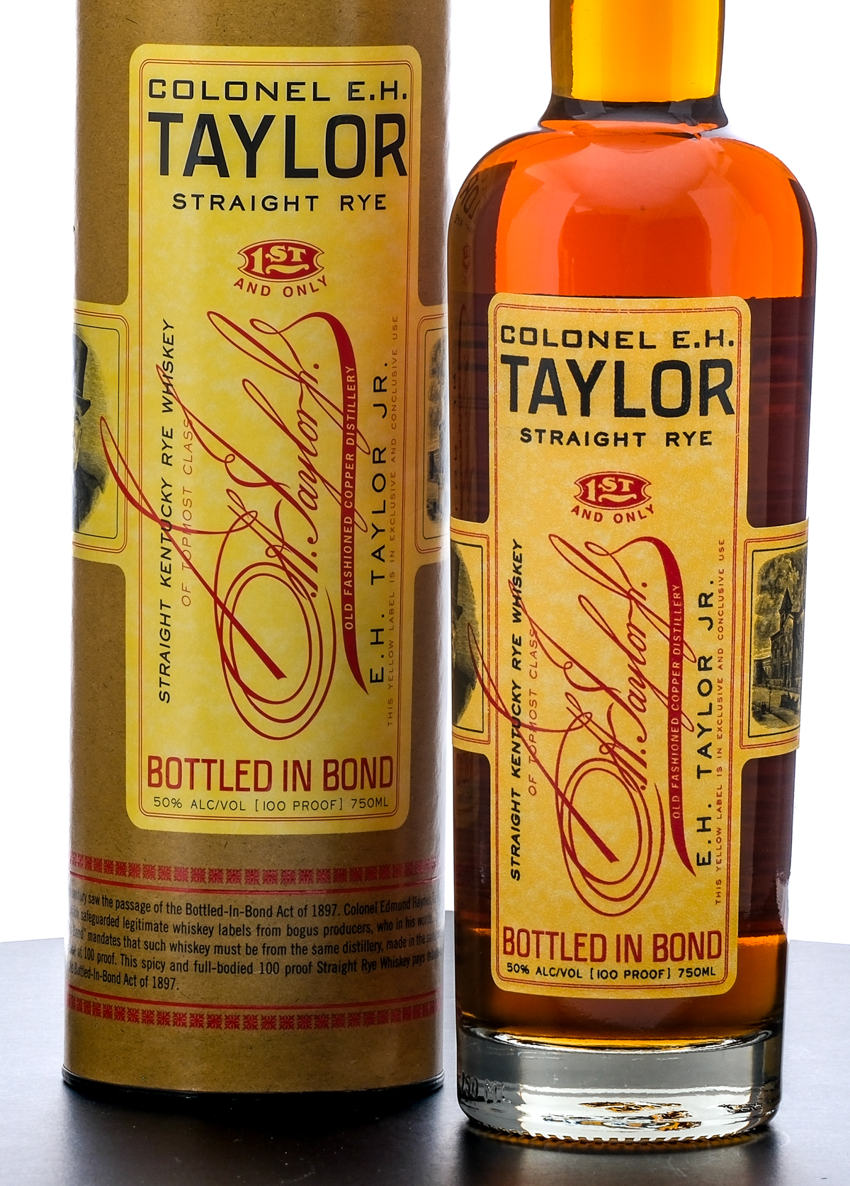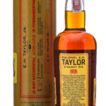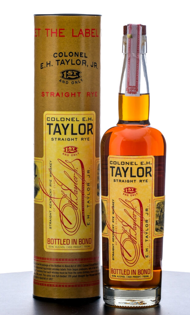 Colonel E.H Taylor Straight Kentucky Rye Whiskey (2024). Bottled in bond. Laser Code: L24296 01 05:35D. 50% ALC/VOL (100 Proof). Cardboard tube itself excellent, Metal cap for cardboard tube has a noticeable dent on the edge. Plastic and stamp seal intact. Printed labels excellent. 750ml. Distilled, aged and bottled by Old Fashioned Copper Distillery.