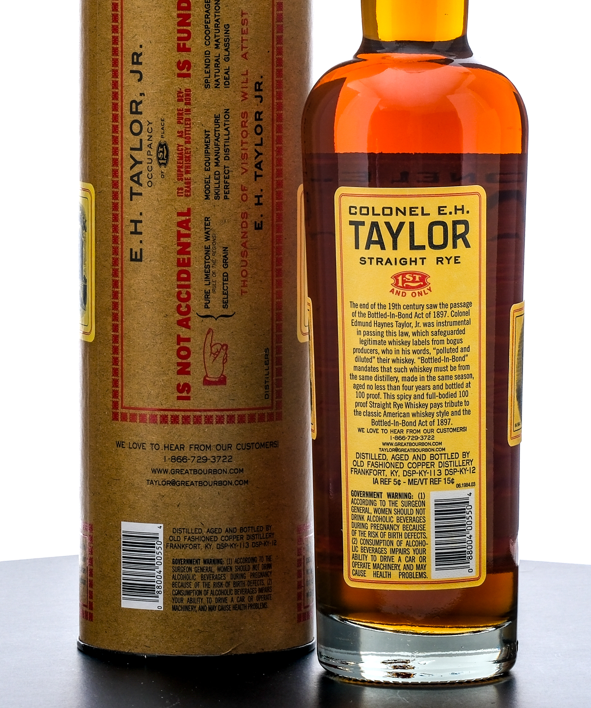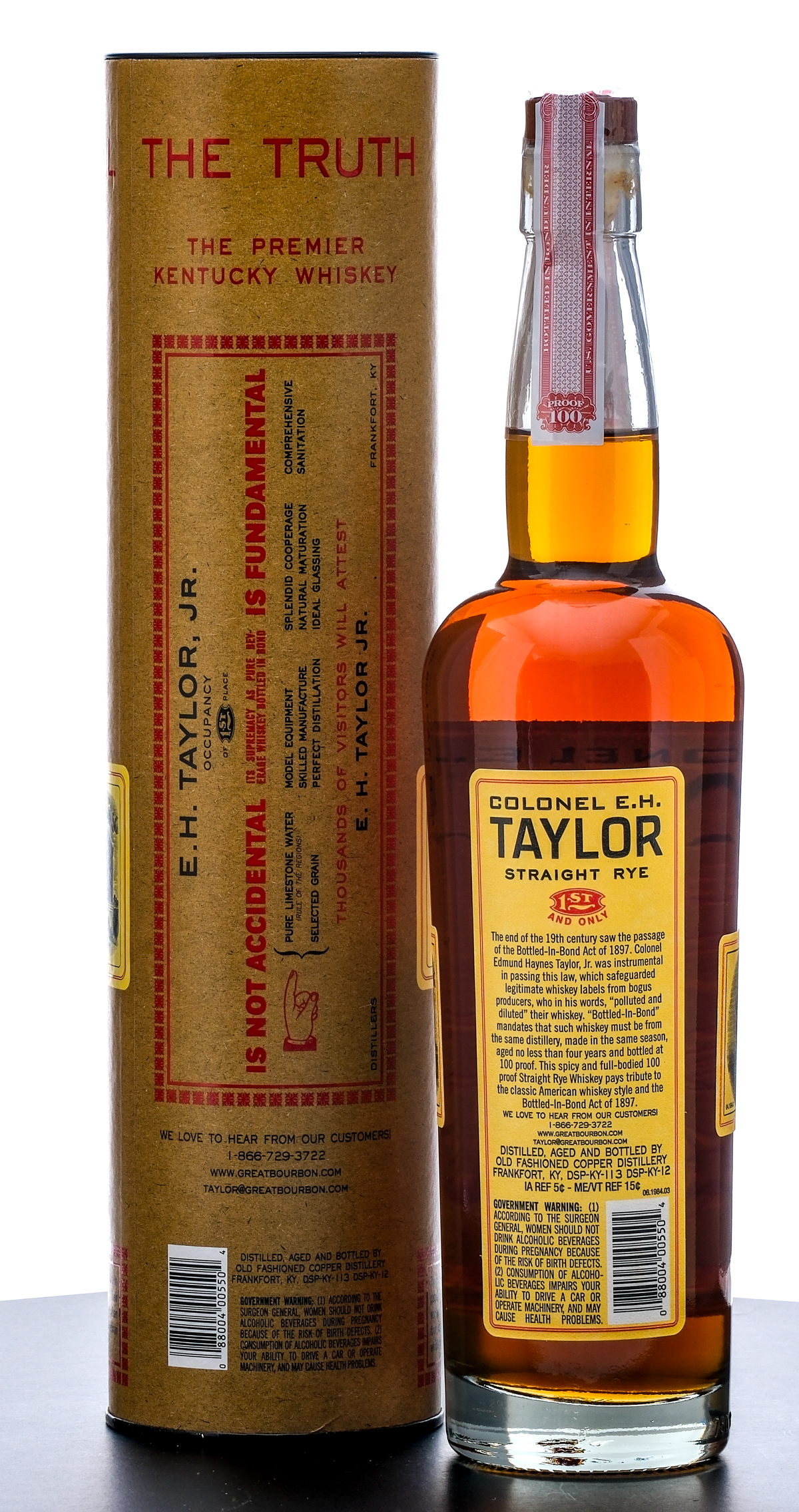 Colonel E.H Taylor Straight Kentucky Rye Whiskey (First digits of the laser code missing to determine date). Bottled in bond. Laser Code: ???292 01 14:02D . 50% ALC/VOL (100 Proof). Cardboard tube in very good condition, noting some shelf wear losses.  Plastic and stamp seal intact. Printed labels excellent. 750ml. Distilled, aged and bottled by Old Fashioned Copper Distillery.