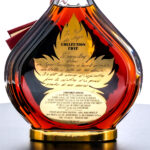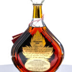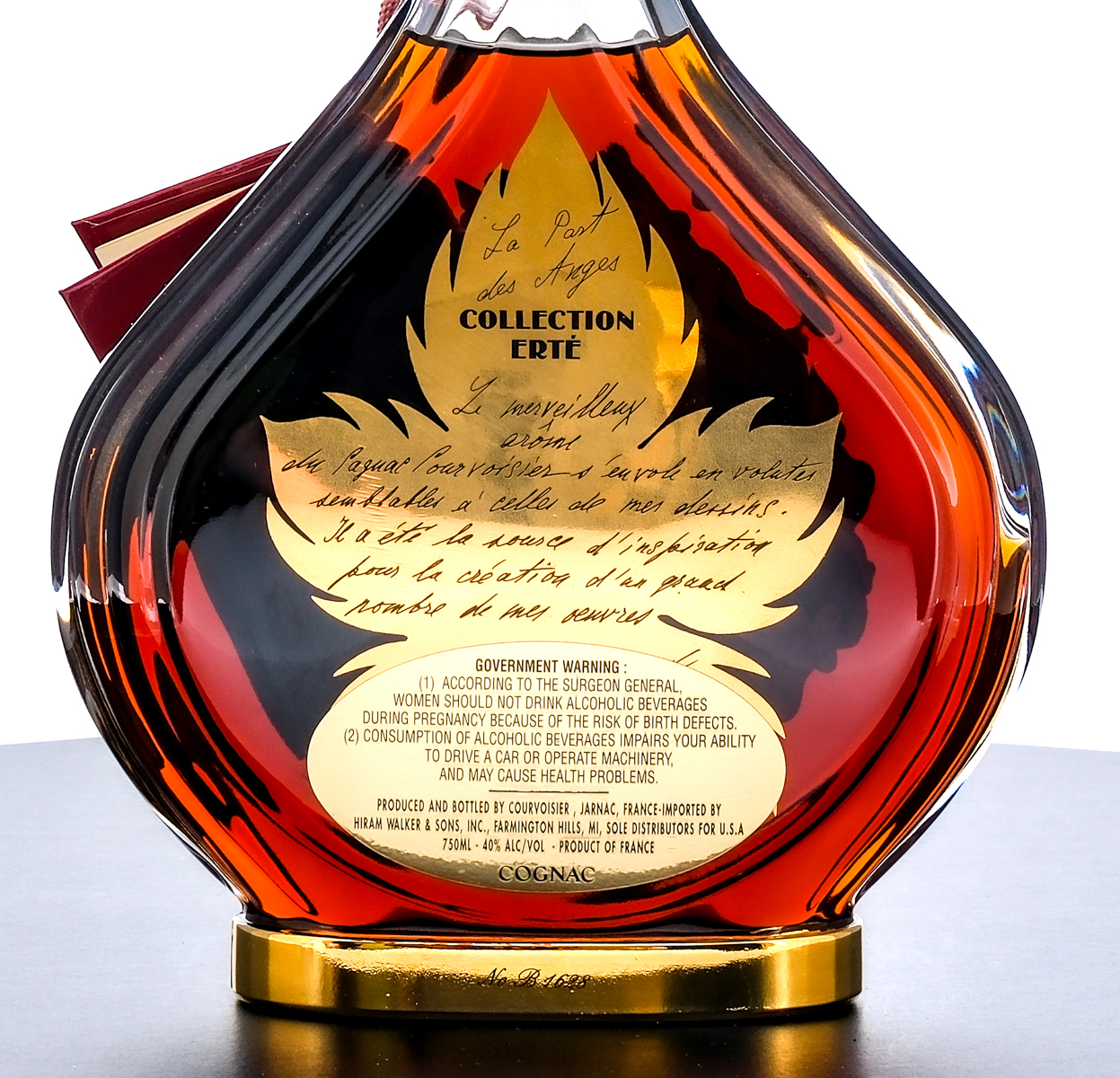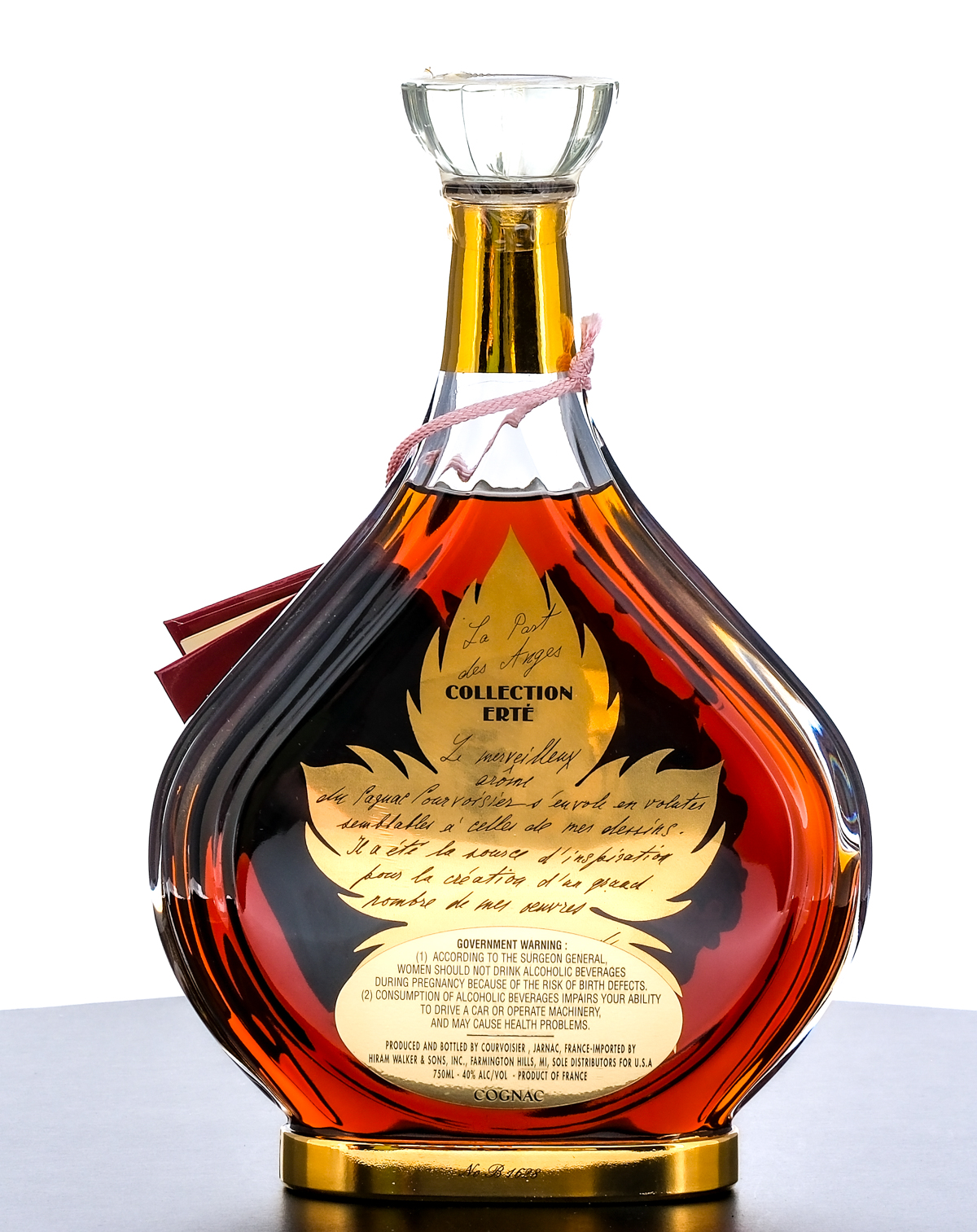 Courvoisier Erte Collection La Parte de Anges Cognac (1988). Edition No. 7. From limited edition of 12,000 (# B1628). 40% ALC/VOL. Plastic sleeve good. Presentation box very good, exhibiting minor cosmetic issues (in addition to a single strip of Scotch tape adhered to the bottom portion). Contains an envelope with a Limited Edition Certification and mail-in Registration Card. Plastic seal on bottle intact. Screened and printed labels excellent. 750ml. Produced and bottled by Courvoisier (Jarnac, France). Imported by Hiram Walker & Sons. Inc., (Farmington Hills, MI). Sole distributors for U.S.A.