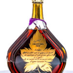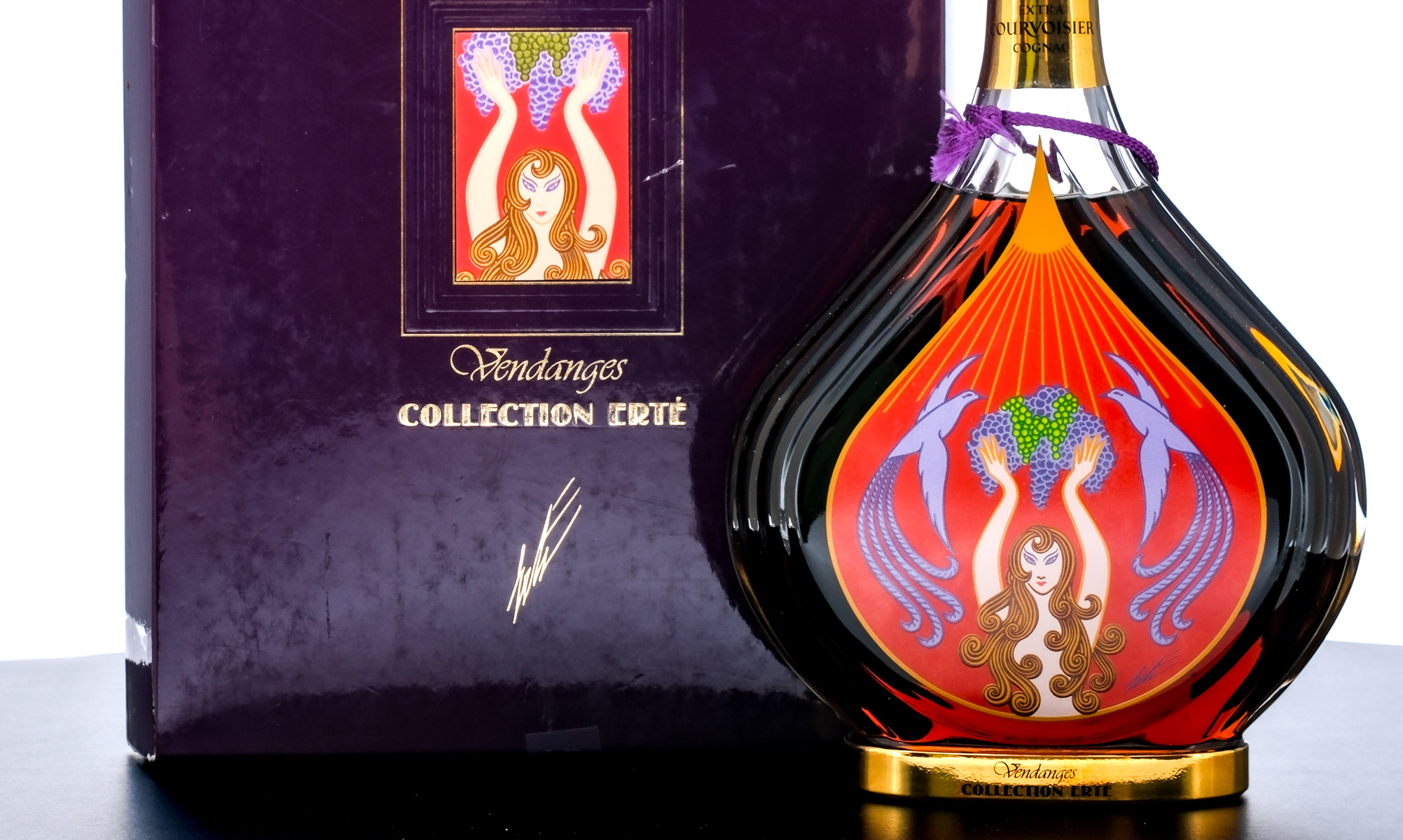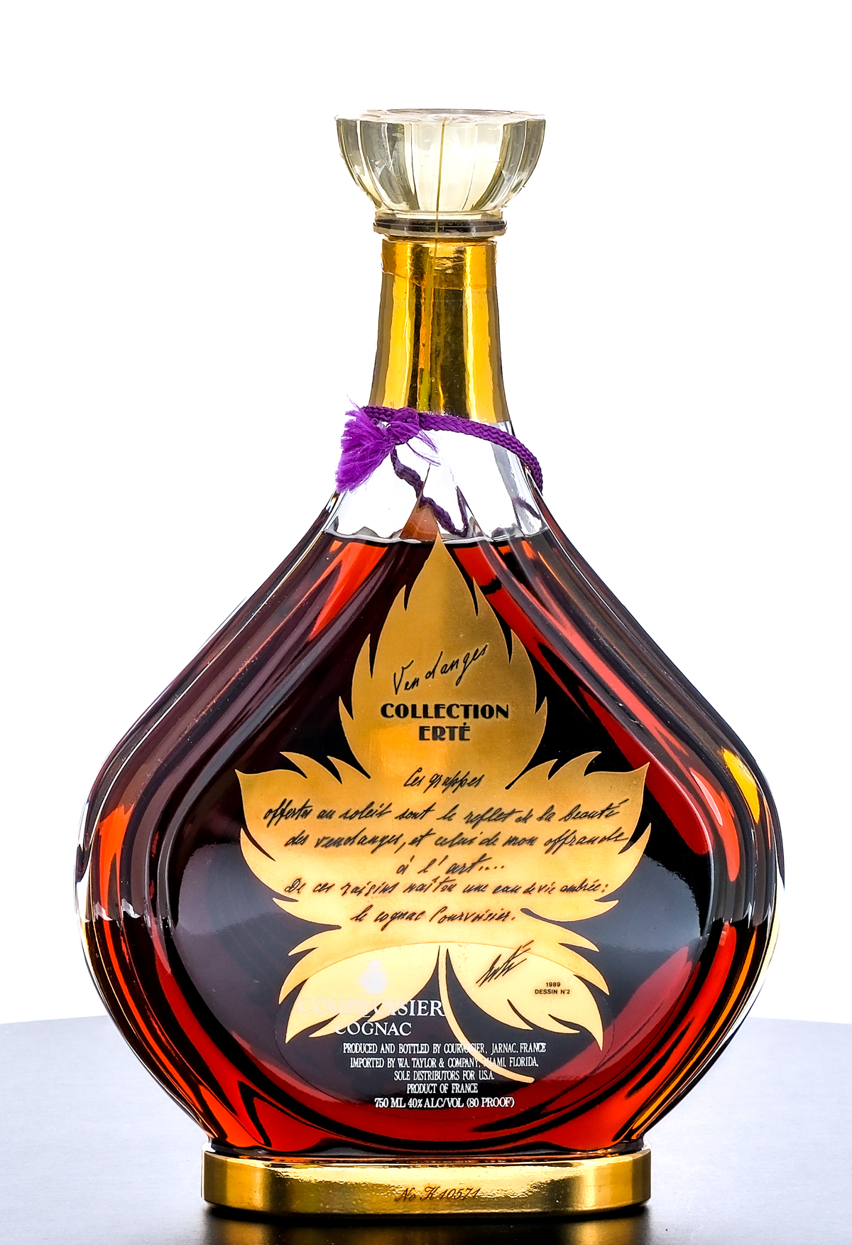 Courvoisier Erte Collection Vendanges Cognac (1988). From limited edition of 12,000 (# K10571). 40% ALC/VOL (80 Proof). Original lined carboard presentation box exhibits major structural and cosmetic issues (including torn corners, losses in foil stamped portions and strips of Scotch tape affixed to the righthand and bottom panels of the box). Contains an envelope with a Limited Edition Certification and mail-in Registration Card. Plastic seal and hang tag on bottle intact. Screened labels in good condition, with some losses in the neck portion. Printed label on rear of bottle excellent. 750ml. Produced and bottled by Courvoisier Cognac (Jarnac, France). Imported by W.A. Taylor & Co. (Miami, FL).
