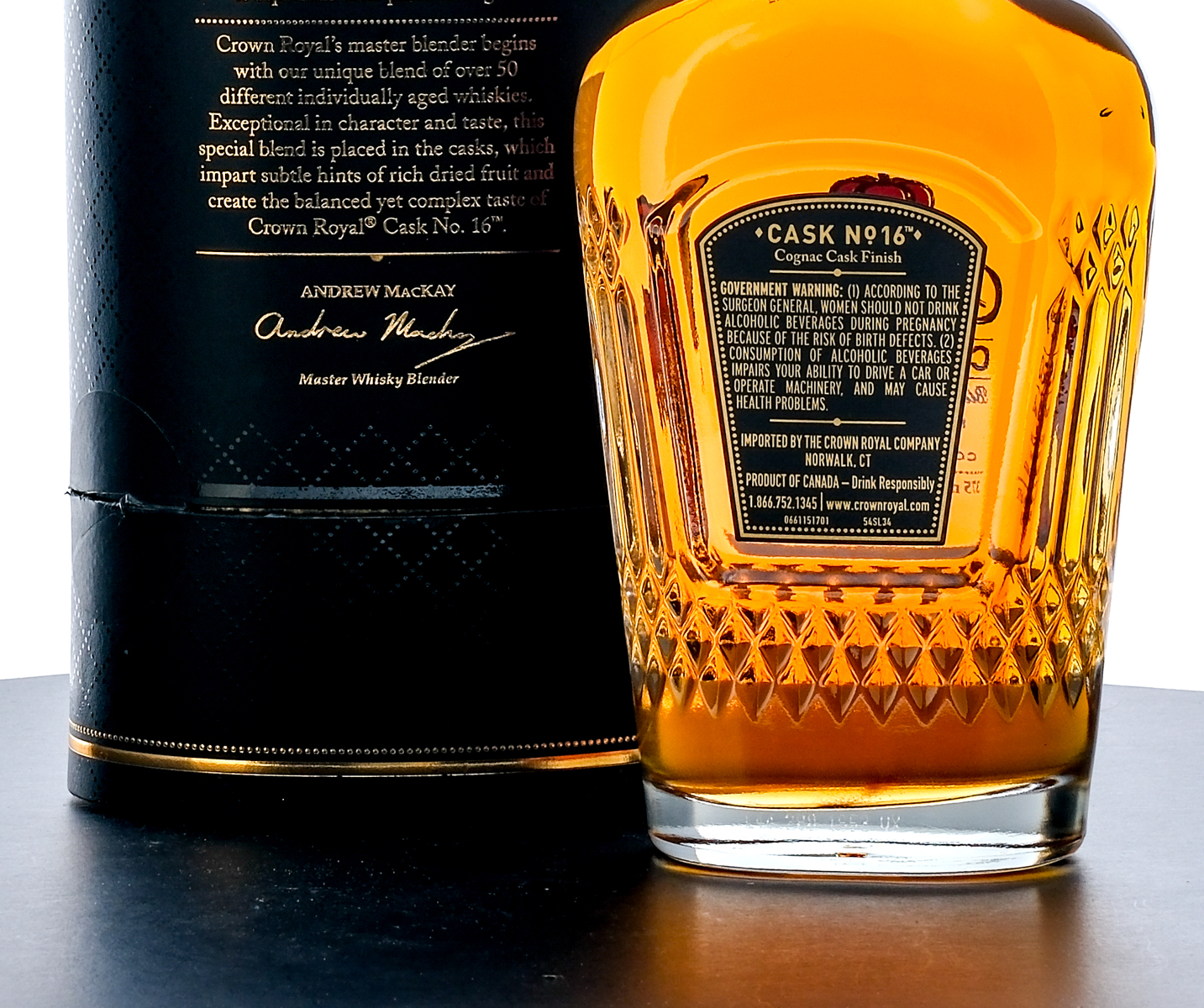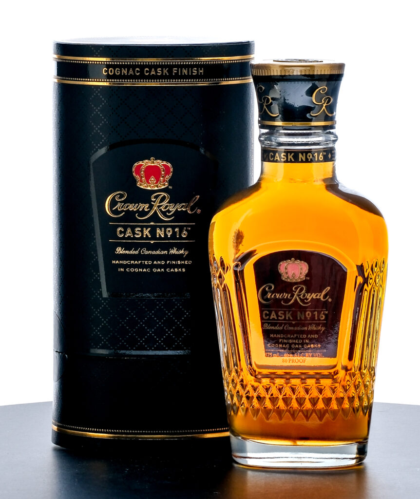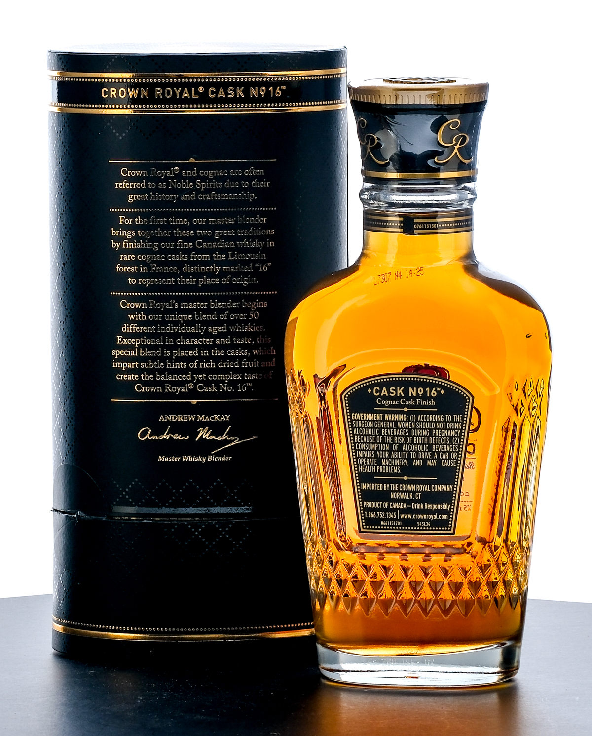 From The Collection of Michael Aronoff: Crown Royal Cask No. 16 Blended Canadian Whisky. Series discontinued in 2012. Handcrafted and finished in Cognac Oak casks. 40% ALC/VOL (80 Proof). Cardboard tube very good (some lifting is present at the edges of the wrap). Embroidered drawstring bag excellent. Plastic seal on bottle intact. Screened and printed labels excellent. 375ml. Imported by The Crown Royal Company (Norwalk, CT).