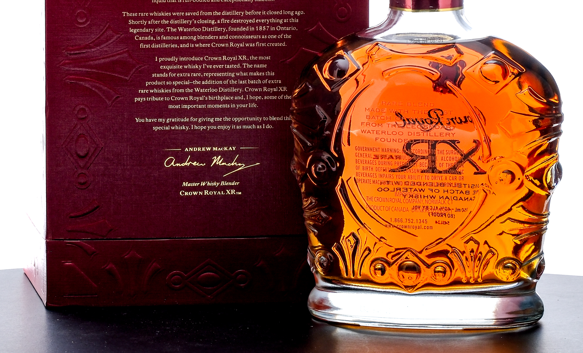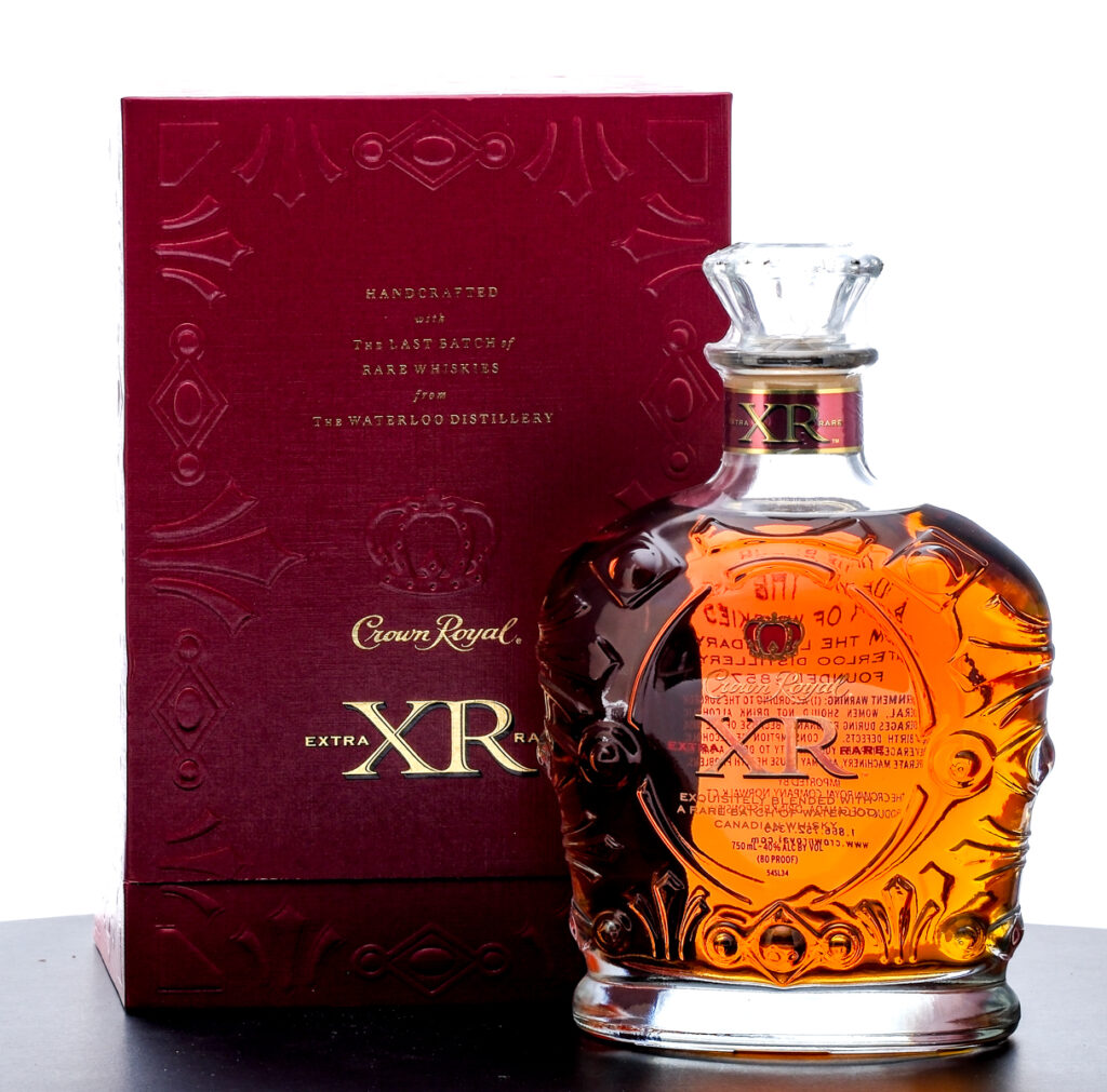 From The Collection of Michael Aronoff: Crown Royal XR Extra Rare Canadian Whisky (2006). Handcrafted with the last batch of rare Whiskies from The Waterloo Distillery. Bottle No. AB 0719. 40% ALC/VOL (80 Proof). Lined presentation box excellent. Embroidered drawstring bag exhibits wear, staining and what appears to be adhesive residue throughout. Plastic seal on bottle intact. Screened labels excellent. 750ml. Imported by the Crown Royal Company (Norwalk, CT).