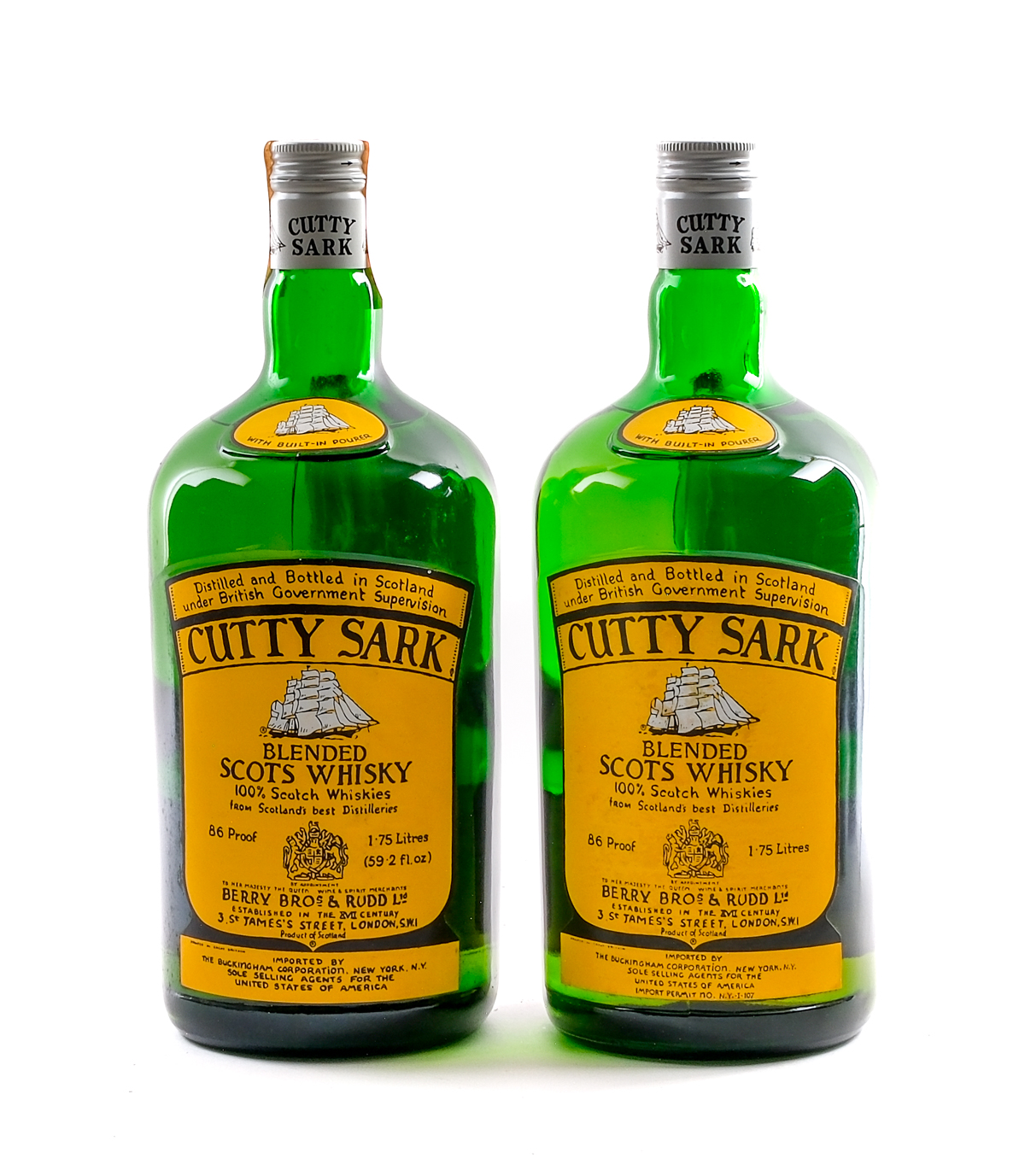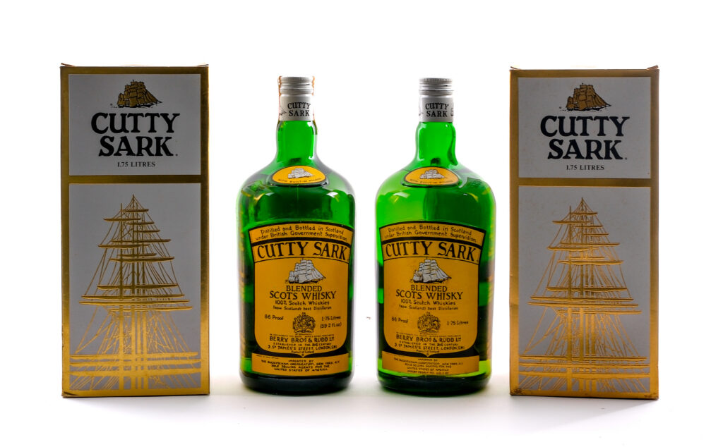 86 Proof. Original cardboard boxes in fair condition with some deterioration and general staining throughout. Mold present on packaging and glass decanters. Foils intact. Stamp seal missing on one bottle. Labels good. Whiskey Scotch Cutty Sark Scotland Unknown 2 1.75 L