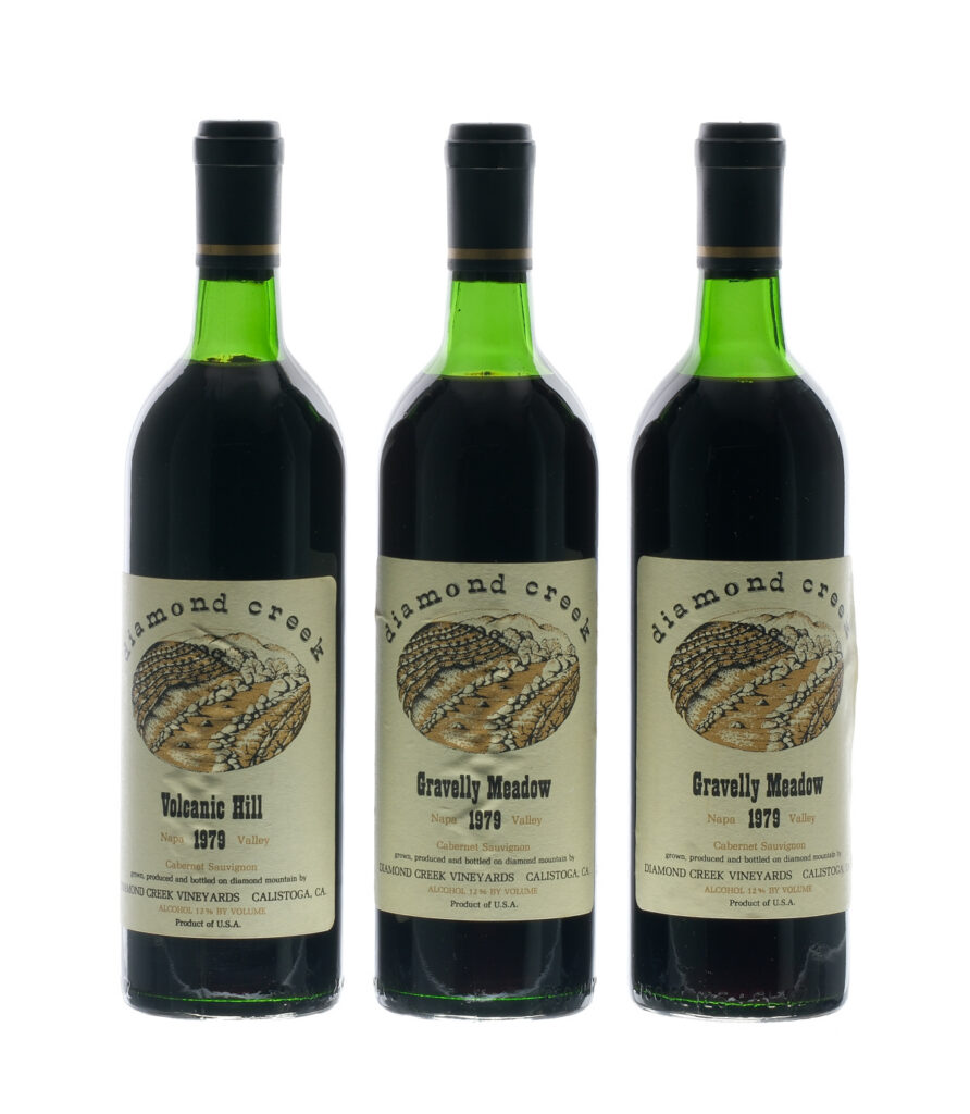 One from Volcanic Hill. Level Base Neck. Two from Gravelly Meadow. Levels just Below Neck. VG labels. Wine Diamond Creek USA Napa Valley Cabernet Sauvignon 1979 3 750ml