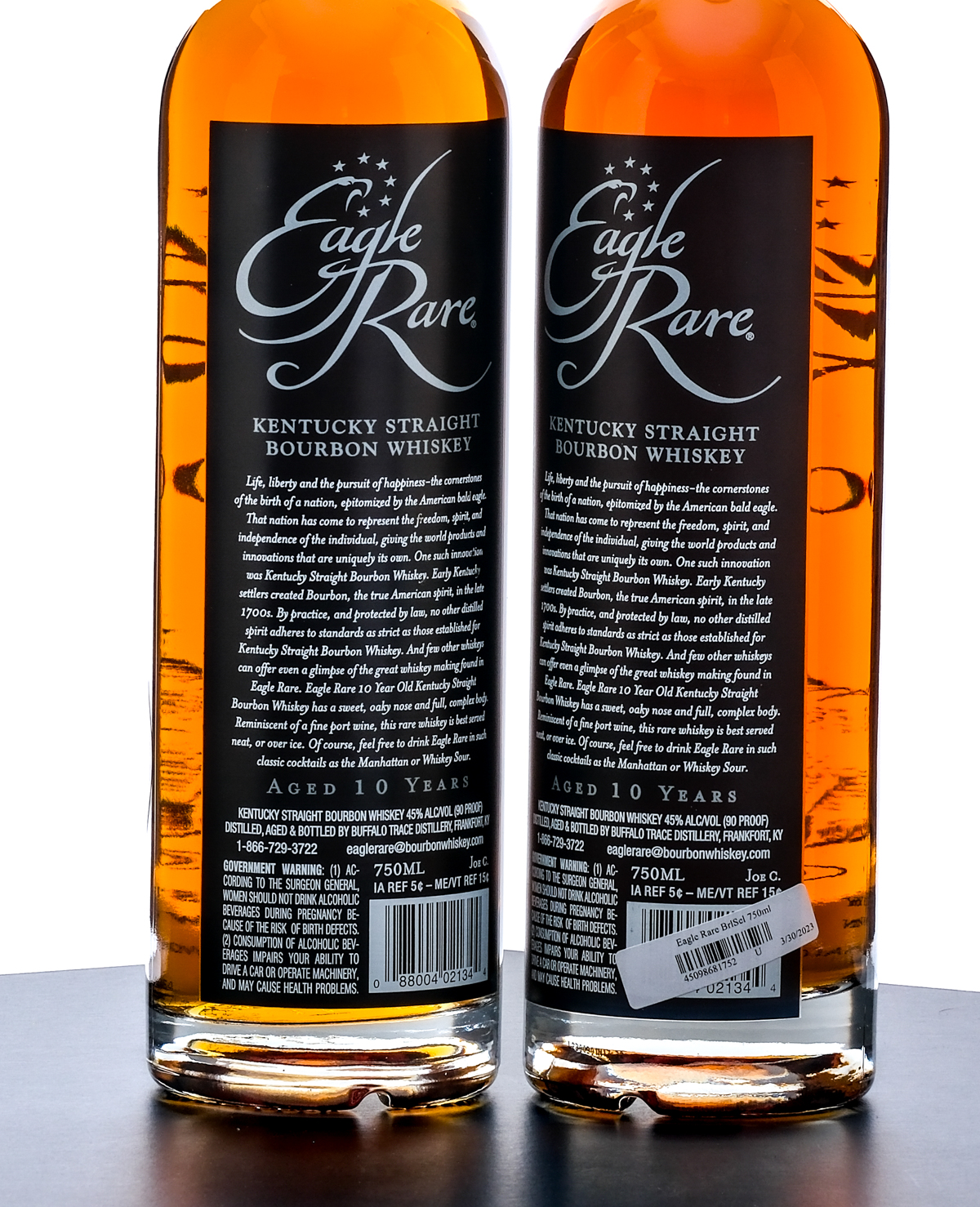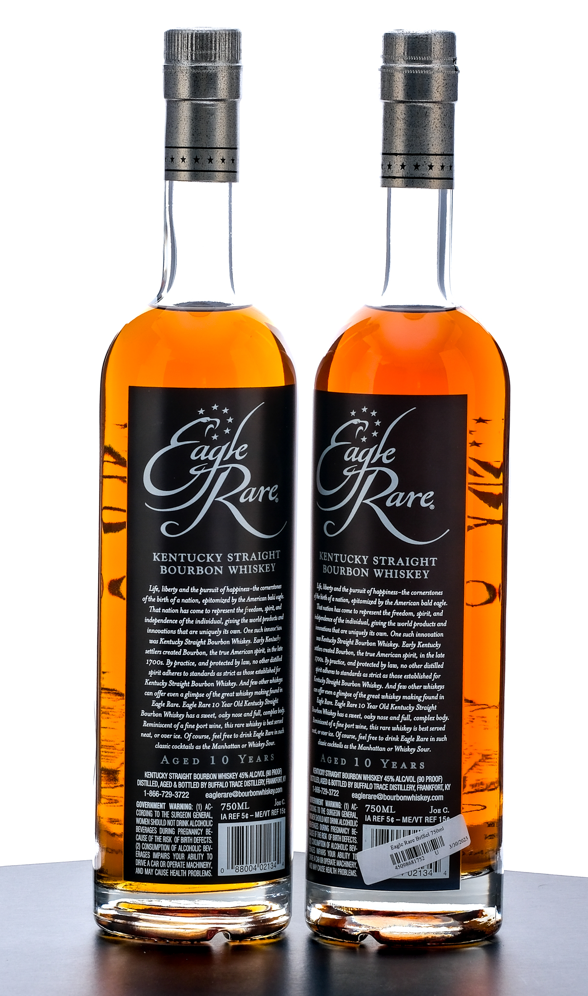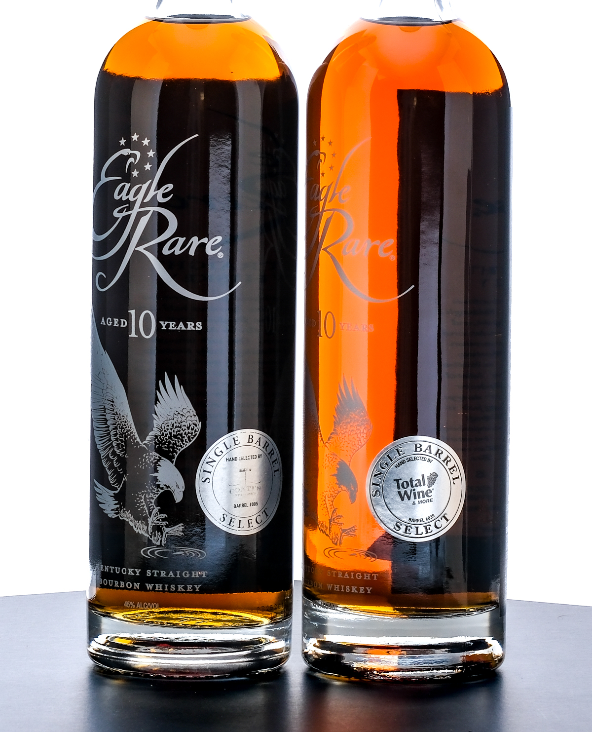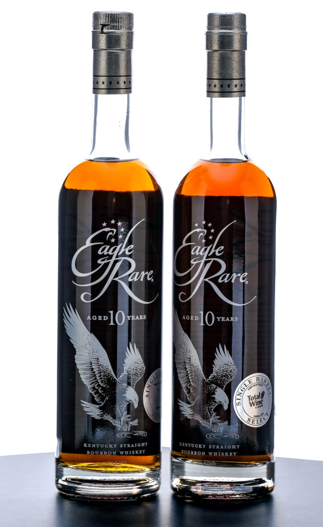 Group of two Eagle Rare Single Barrel Select bottles: 1x bottle of Eagle Rare 10 Year Kentucky Straight Bourbon Whiskey (2023). Laser code: L232620112:54. Hand selected by Conti’s Wines & Spirits (Barrel #605). 1x bottle of Eagle Rare 10 Year Kentucky Straight Bourbon Whiskey (2023). Laser code: L2300901N17:32. Hand selected by Total Wine & More (Barrel #039). 45% ALC/VOL (90 Proof). Foil seals excellent. Printed labels excellent. 750ml each. Distilled, aged & bottled by Buffalo Trace Distillery.