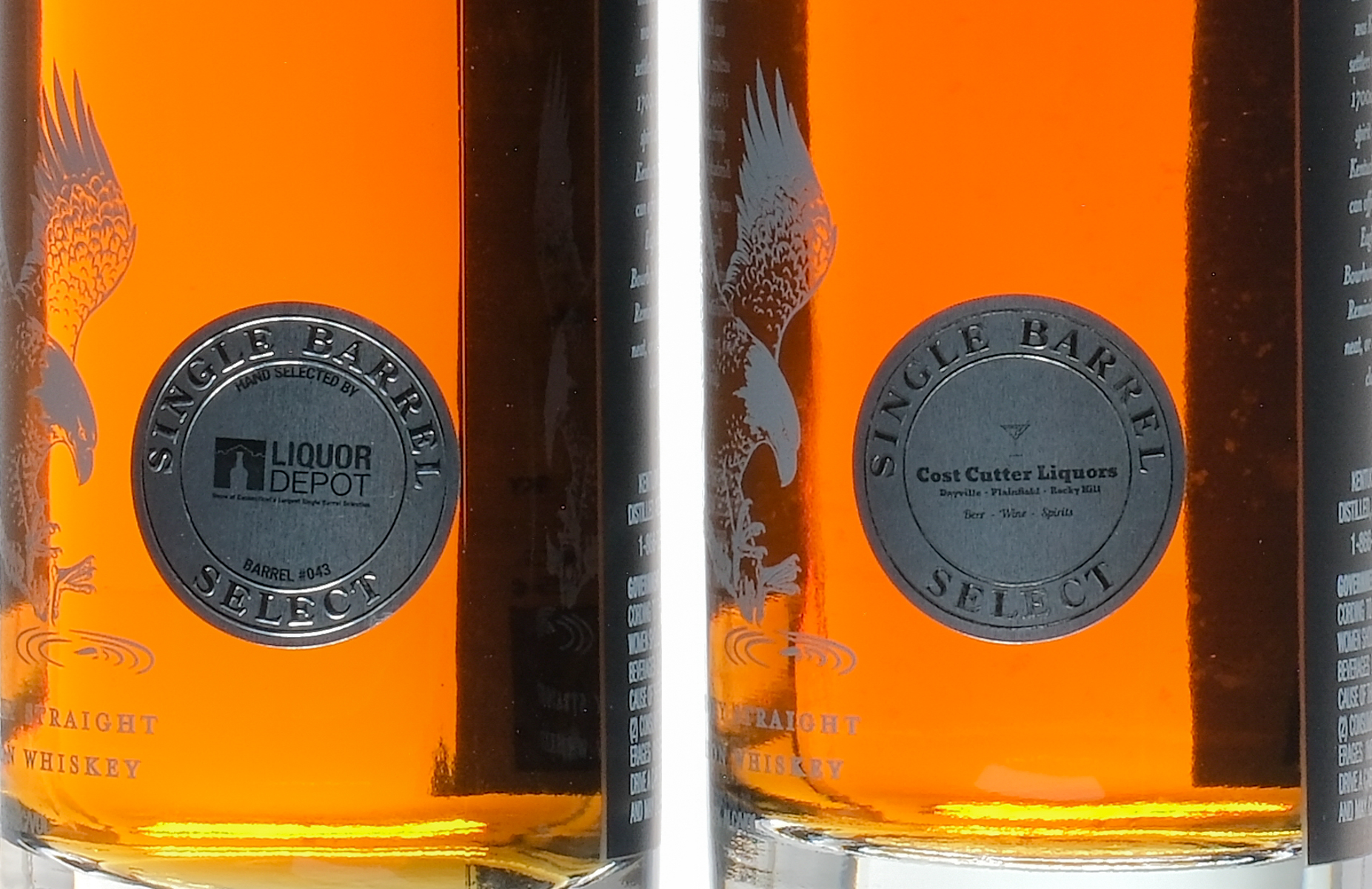 Selections by Cost Cutter Liquors and Liquor Depot. Liquor Depot Barrel #043. 45% ALC/VOL. Labels and foils excellent condition. Whiskey Bourbon Eagle Rare USA Kentucky 2022 / 23 Aged 10 Years 2 750ml
