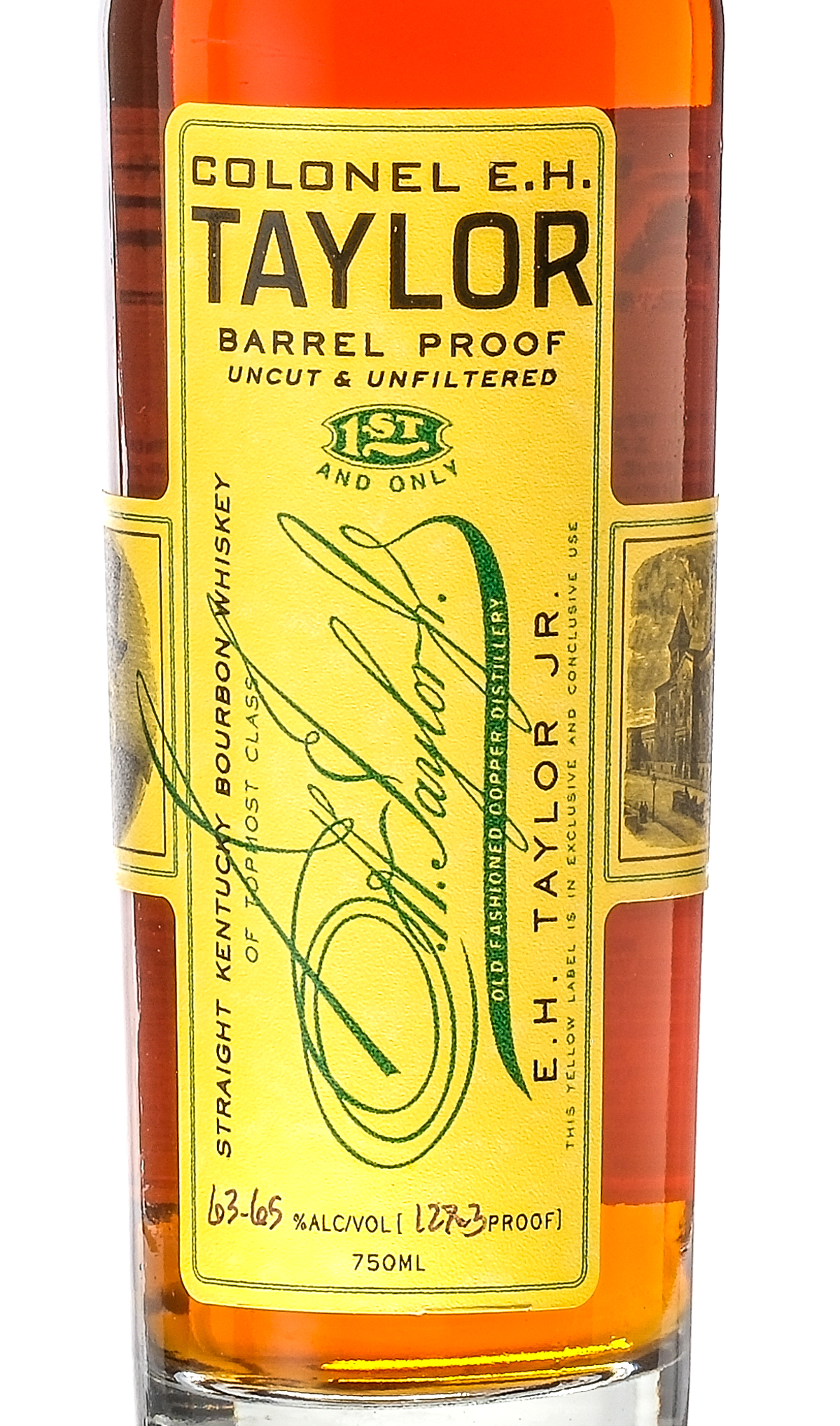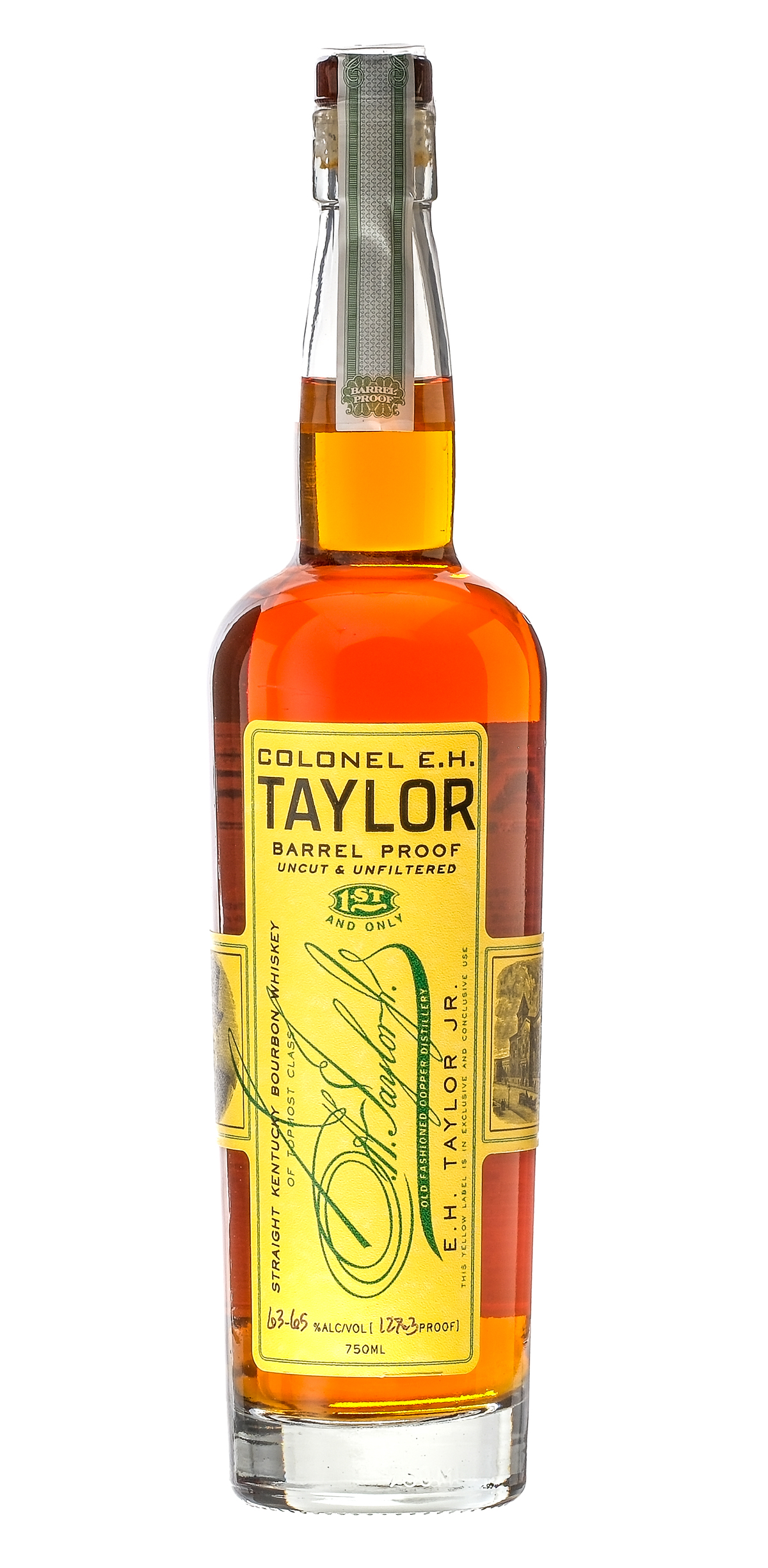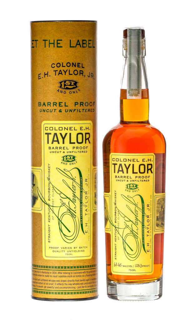 Uncut & unfiltered. 63.65% ALC/VOL (127.3 Proof). Original cardboard tube excellent. Plastic seal intact on bottle. Labels largely excellent (some damage evident at the bottom of the front label). Whiskey Bourbon E.H. Taylor Jr. USA Kentucky 2021 1 750ml