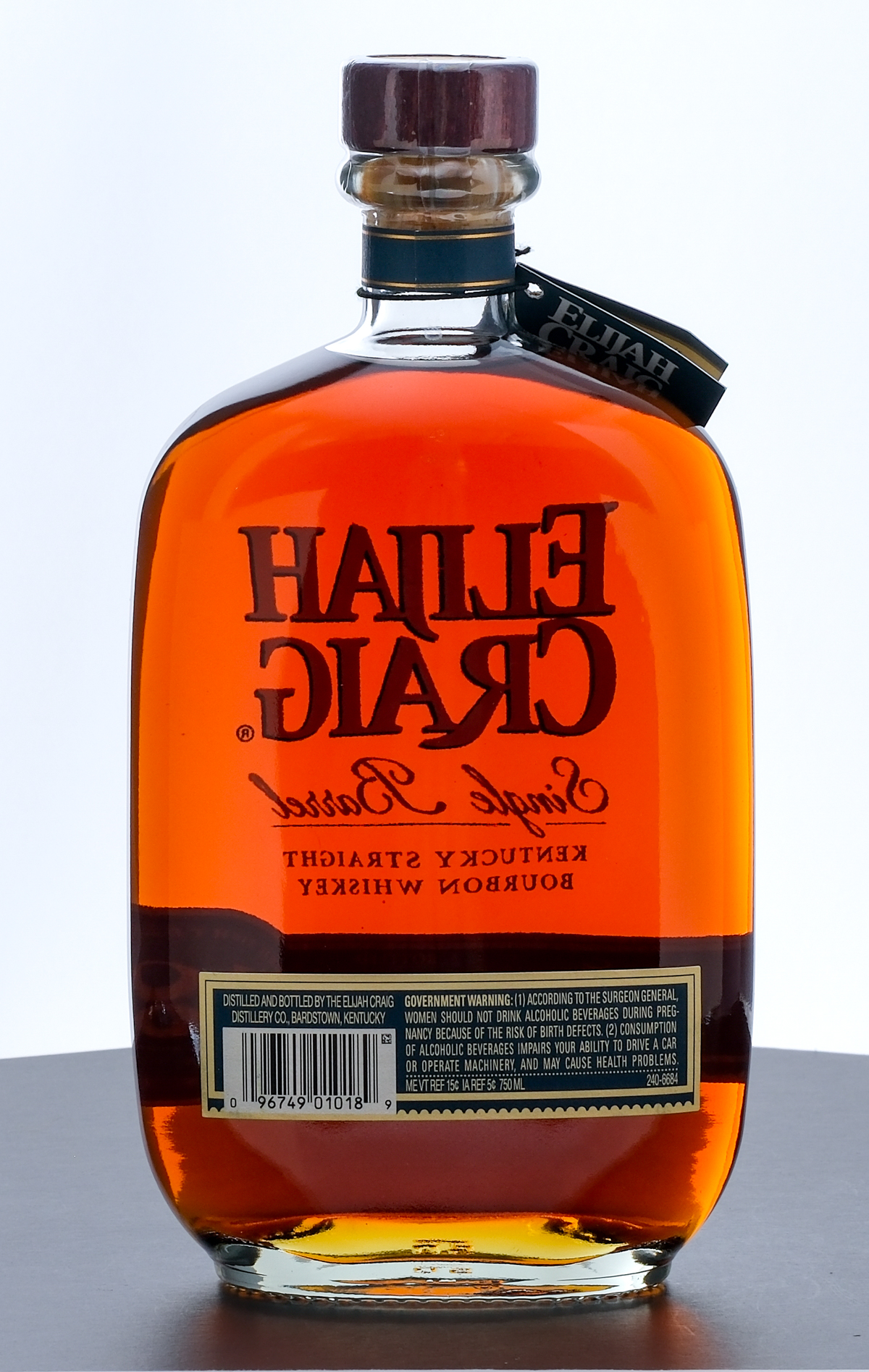 Elijah Craig 18 Year Single Barrel Kentucky Straight Bourbon Whiskey. Bottled: 2.12.21. Barrel 5373. 45% ALC/VOL. Plastic seal and hang tag intact. Screened and printed labels excellent. 750ml. Distilled and bottled by The Elijah Craig Distillery Co.