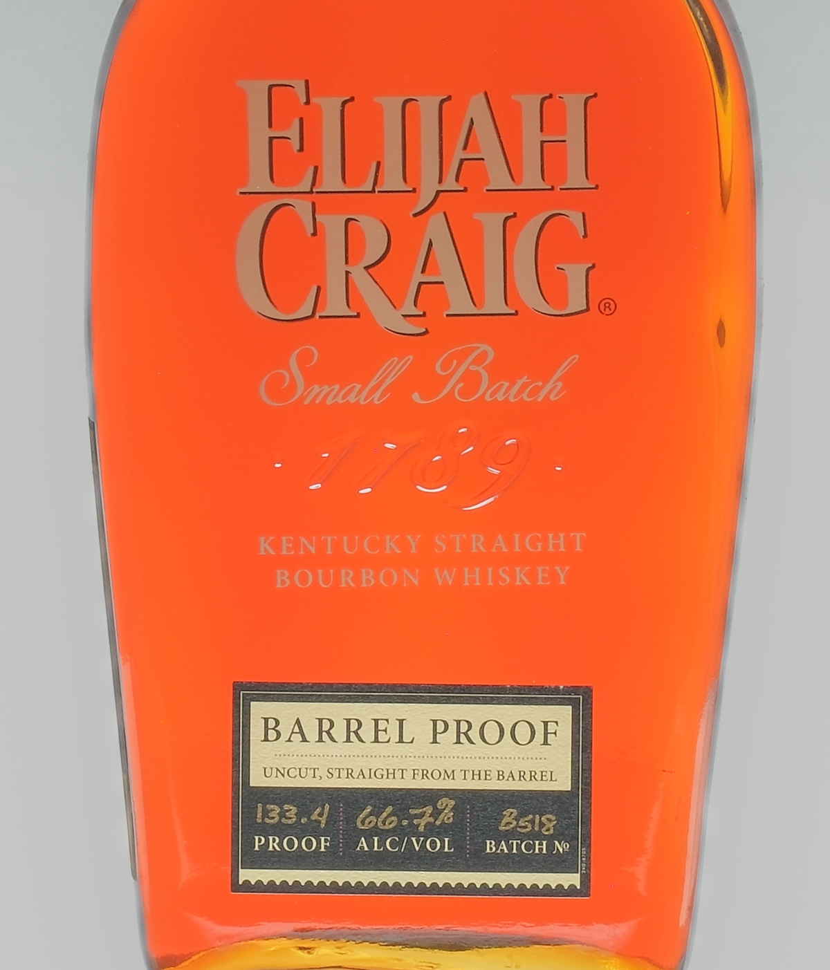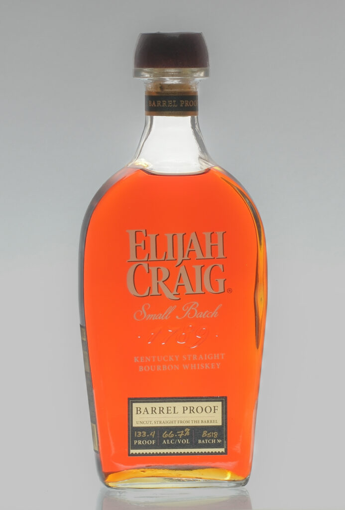 Small Batch. Barrel Proof. Uncut, straight from the barrel. Non-chill filtered. 133.4 proof. 66.7% ALC/VOL. Batch No. B518. Labels excellent. Plastic wrap intact. 12 yr. Whiskey Bourbon Elijah Craig USA Kentucky 2018 12 Years Old 1 750ml