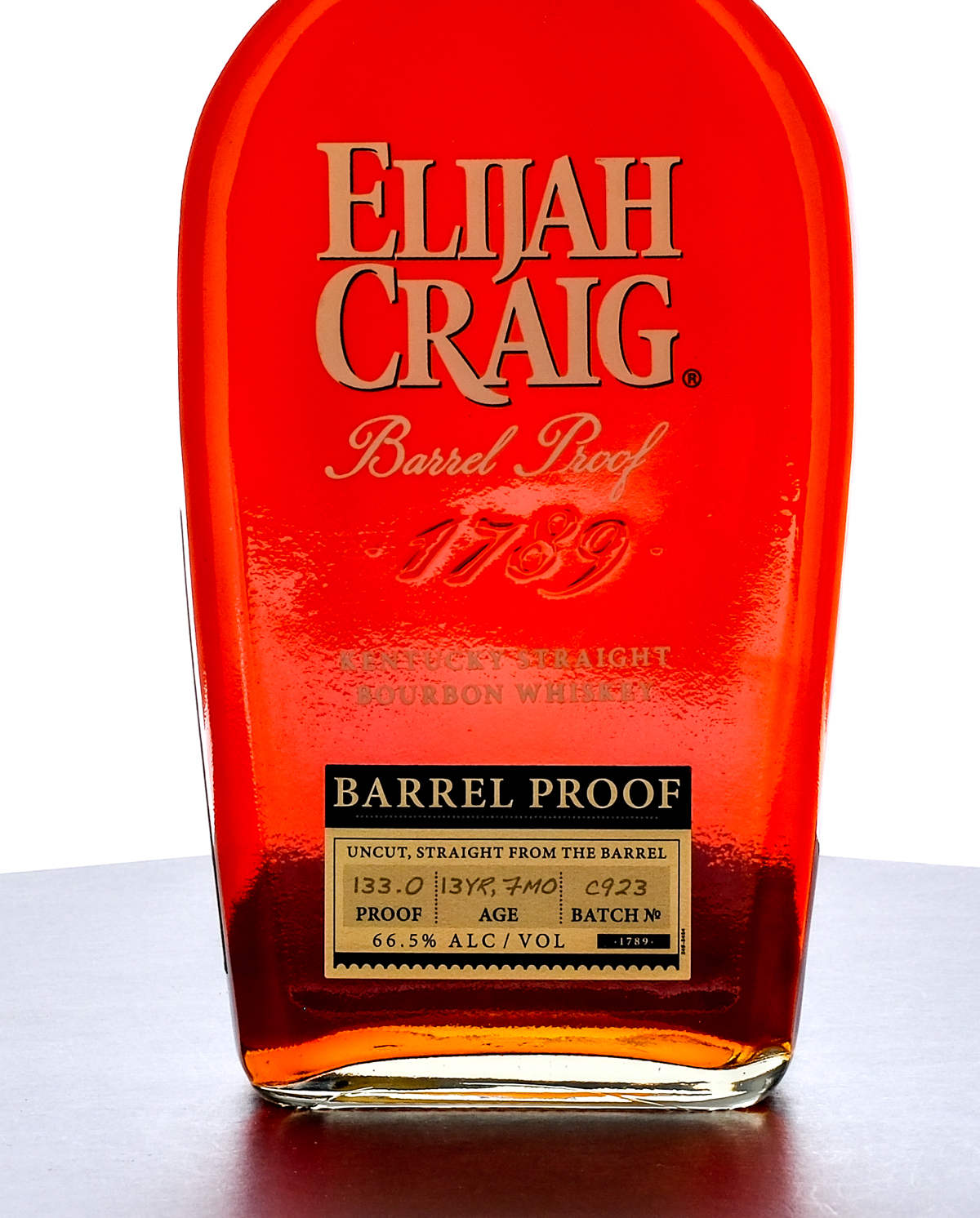 **UPDATED DESCRIPTION** Elijah Craig Barrel Proof Kentucky Straight Bourbon Whiskey. Aged 13 Years, 7 Months. Batch No. C923. Laser code: A22231228. 66.5% ALC/VOL (133 Proof). Plastic seal intact. Screened and labels excellent. Printed labels very good, side label exhibits some lifting and a small tear on one side. 750ml. Distilled and bottled by The Elijah Craig Distillery Co.