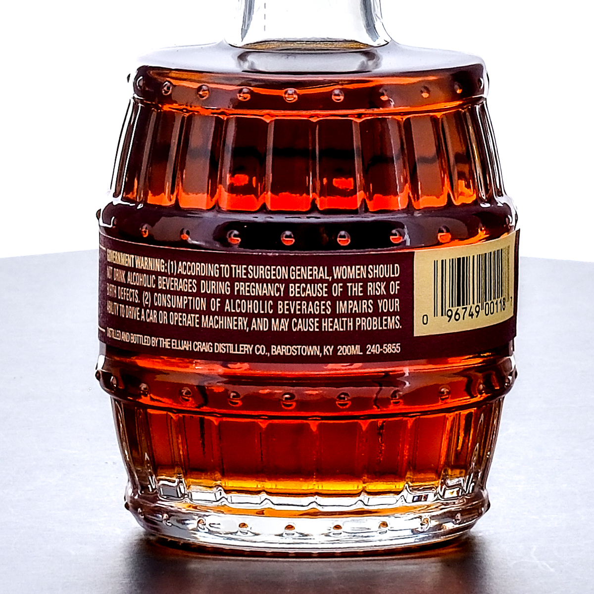 Elijah Craig Barrel Select Kentucky Straight Bourbon Whiskey. 62.5% ALC/VOL (125 Proof). Plastic seal intact. Printed label excellent. Small Bourbon barrel shaped bottle. Volume: 200ml. Distilled and Bottled by the Elijah Craig Distillery Co., Bardstown, KY