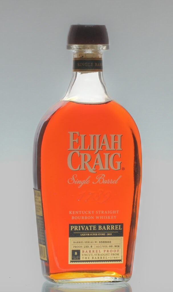 Selection by Liquor Super Store (2022). Barrel proof. Uncut, straight from the barrel. Barrel Serial No: 6588966. Non-chill filtered. Proof: 133.8. ALC/VOL: 66.90%. Plastic seal intact. Labels excellent. Whiskey Bourbon Elijah Craig USA Kentucky 2022 8 Years Old 1 750ml