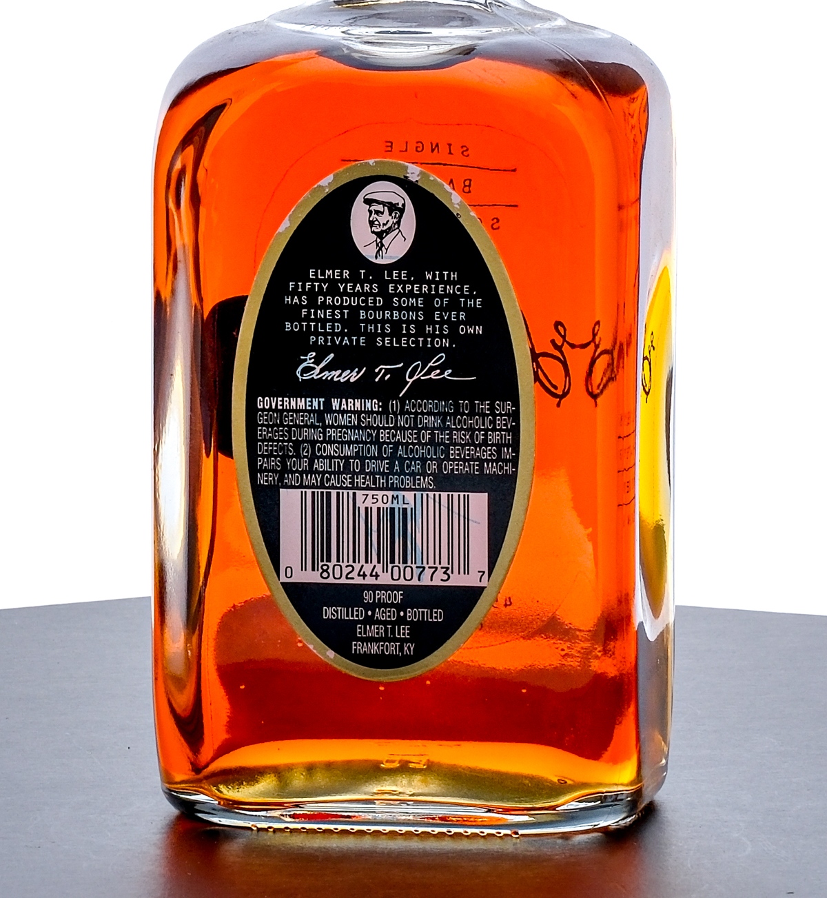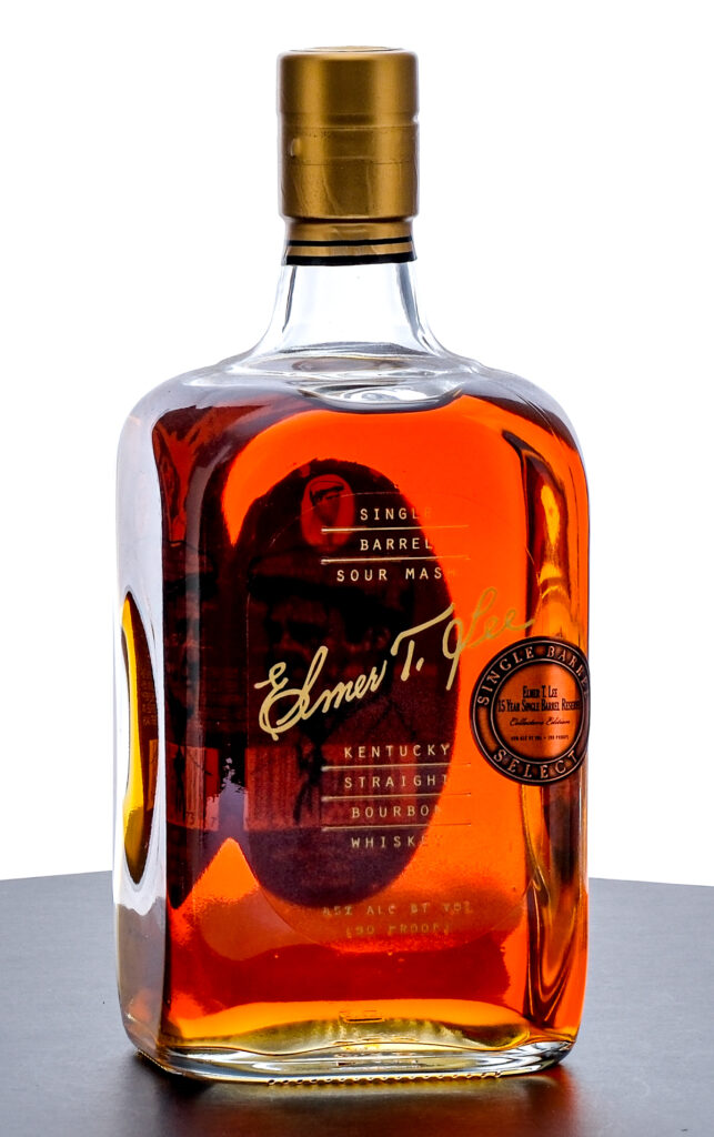 From The Collection of Michael Aronoff: Elmer T. Lee Single Barrel Sour Mash Kentucky Straight Bourbon Whiskey (2010). Single Barrel Select: Elmer T. Lee 15 Year Single Barrel Reserve Collector’s Edition. Laser Code: W3501013:54. 45% ALC/VOL (90 Proof). Foil seal excellent. Printed labels good (rear facing label exhibits some sizable losses in foil stamp). 750ml. Distilled, aged and bottled by Elmer T. Lee.