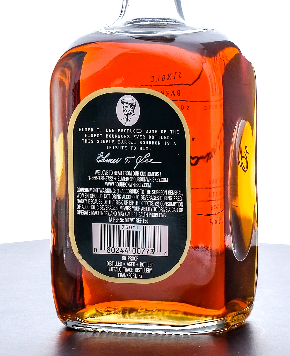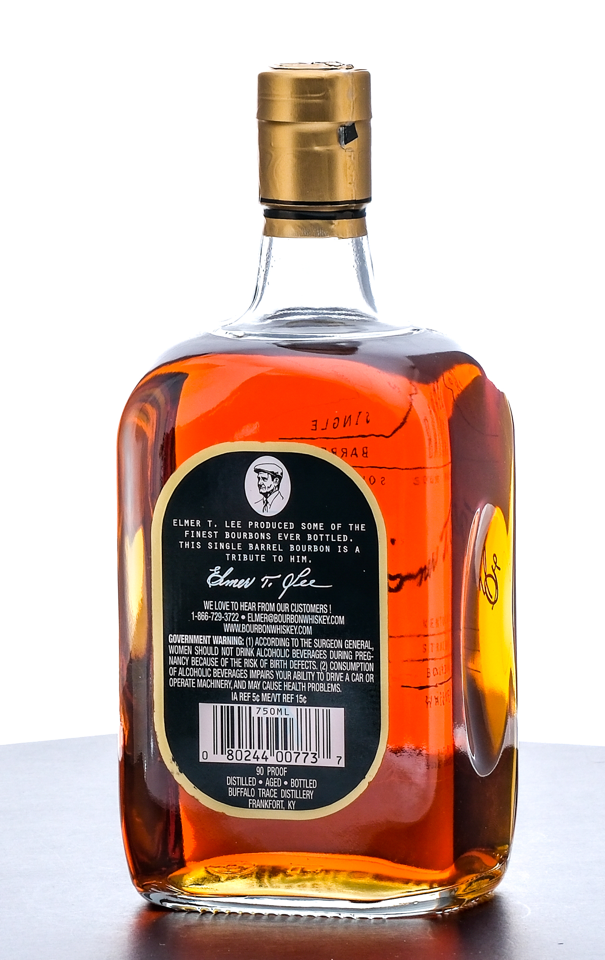 Elmer T. Lee Single Barrel Sour Mash Kentucky Straight Bourbon Whiskey Laser Code: L241840109:43?. 45% ALC/VOL (90 Proof). Foil seal excellent. Labels likewise excellent. 750ml. Distilled, Aged and Bottled Buffalo Trace Distillery.