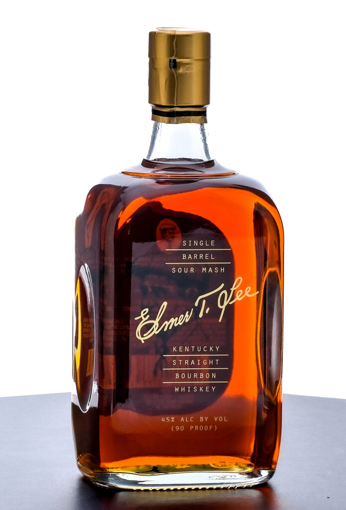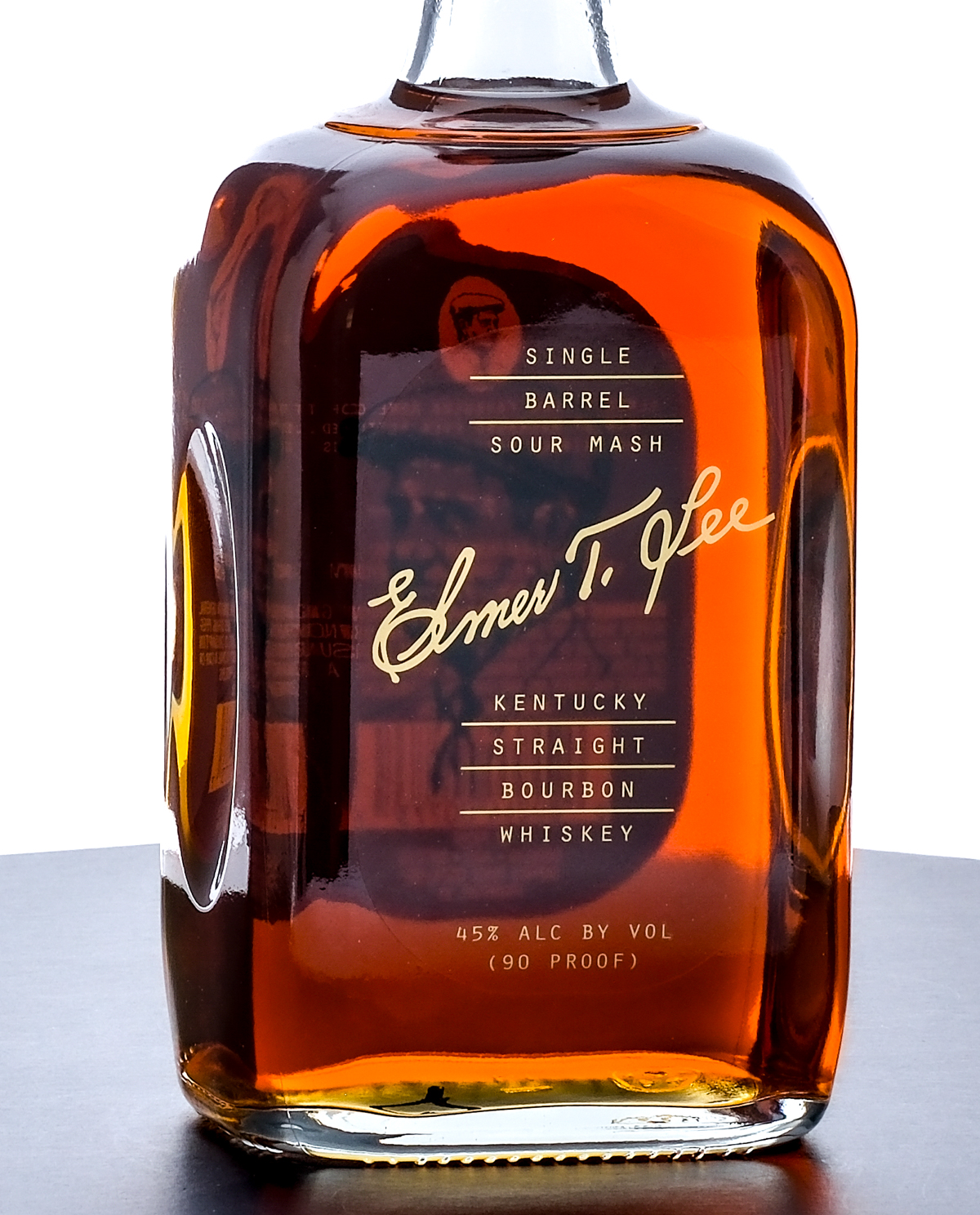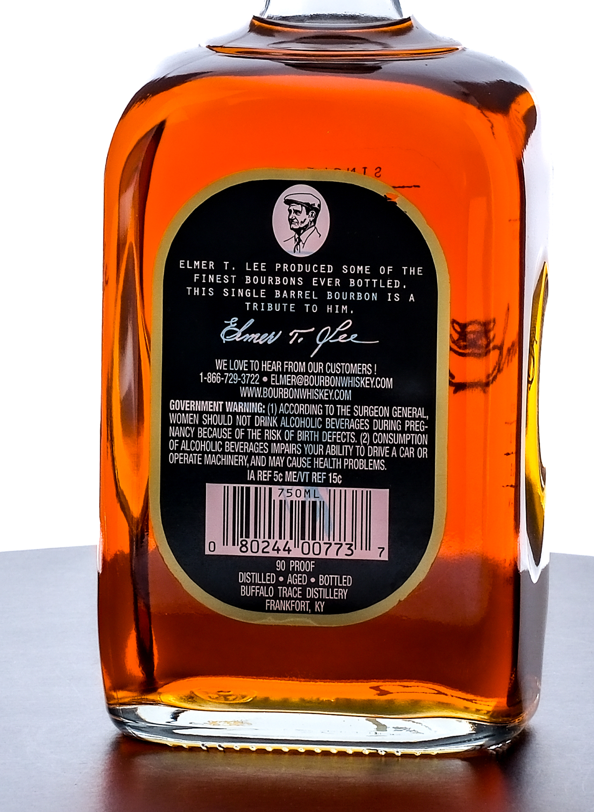 Elmer T. Lee Single Barrel Sour Mash Kentucky Straight Bourbon Whiskey No Laser Code Present, either this bottle was missed, or the bottle dates to the early to mid 2000s. 45% ALC/VOL (90 Proof). Foil seal excellent. Printed labels very good condition while exhibiting some color loss on the back label. Bottle has a smoochy, smoochy heart drawn on the bottom with permanent marker. 750ml. Distilled, Aged and Bottled Buffalo Trace Distillery.