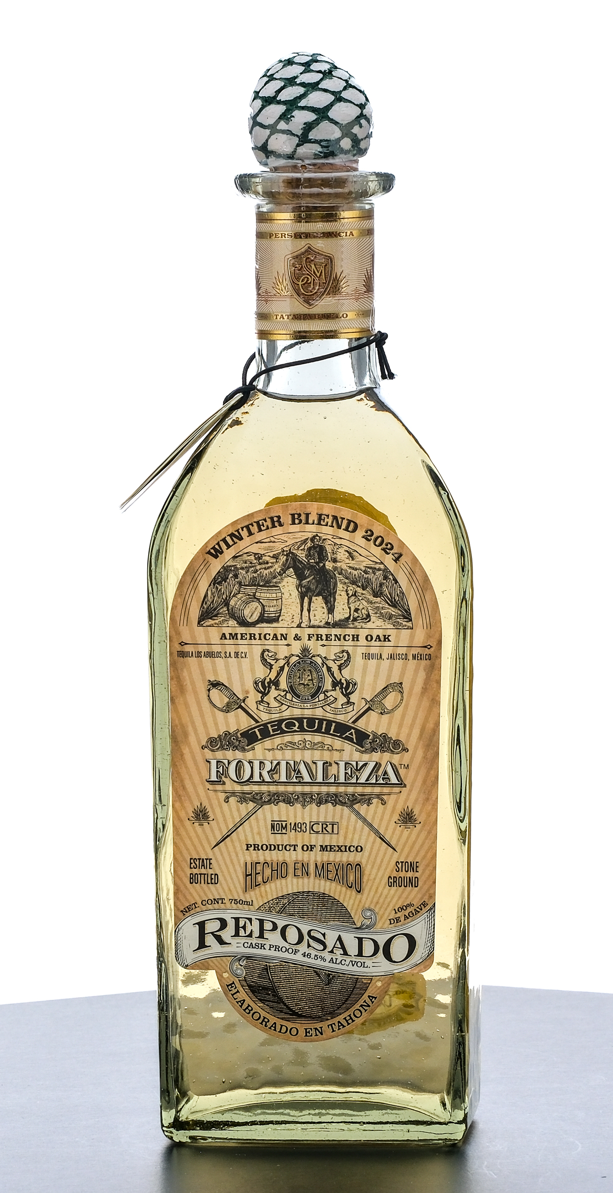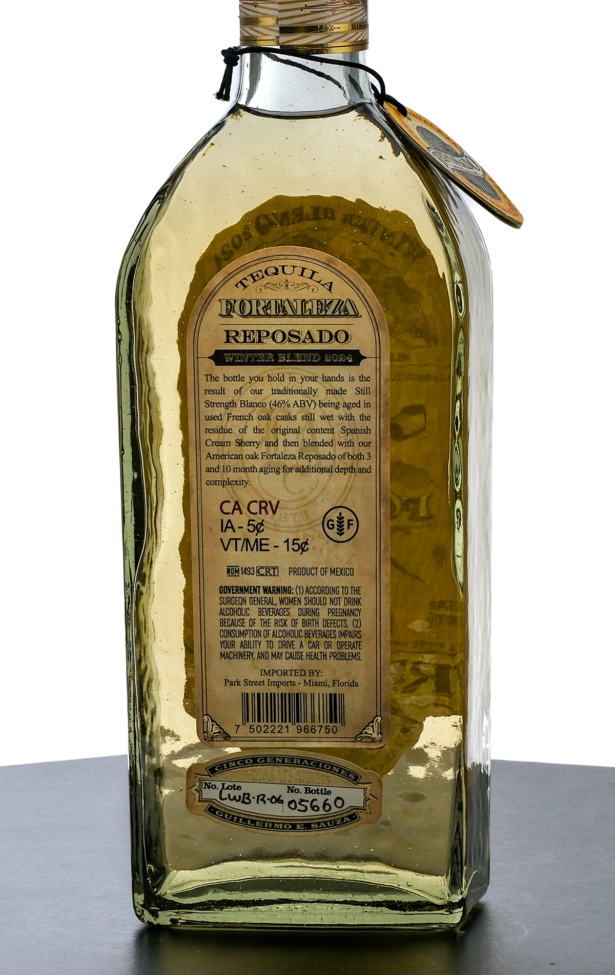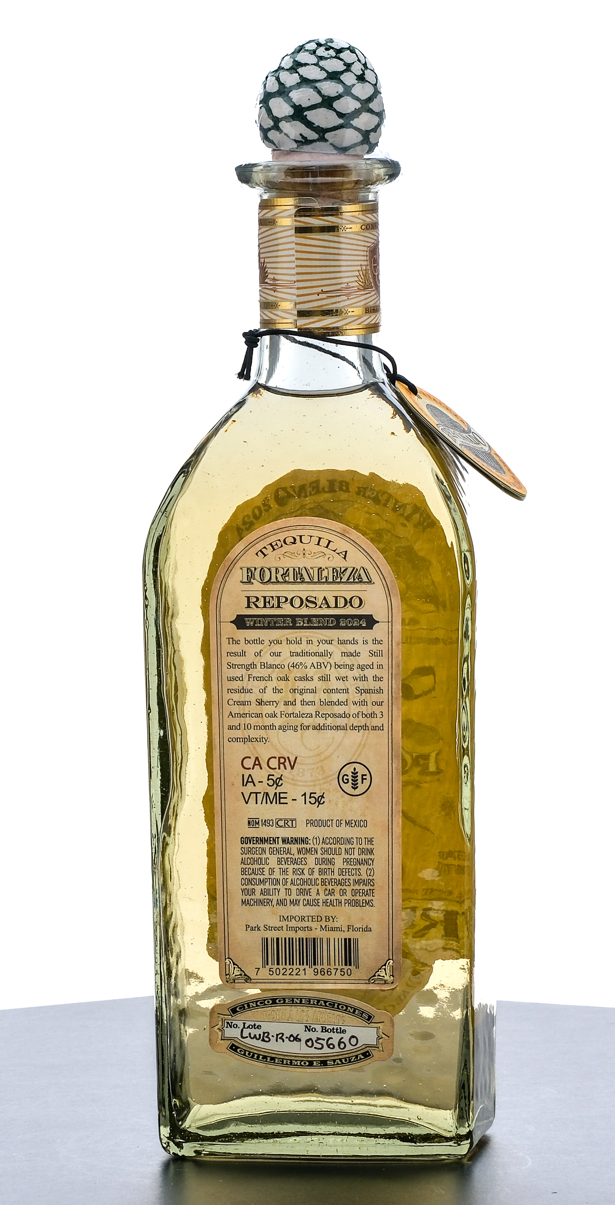 Fortaleza Tequila Reposado. Winter Blend 2024. No Lote LWB-R-06. No. Bottle: 05660 Cask Proof 40% ALC/VOL (80 Proof). Plastic seal and hang tag intact. Printed labels excellent. 750ml. Tequila Los Abuelos, S.A. DE C.V. Tequila,Jalisco Mexico. Imported by: Park Street Imports, Miami, Florida.